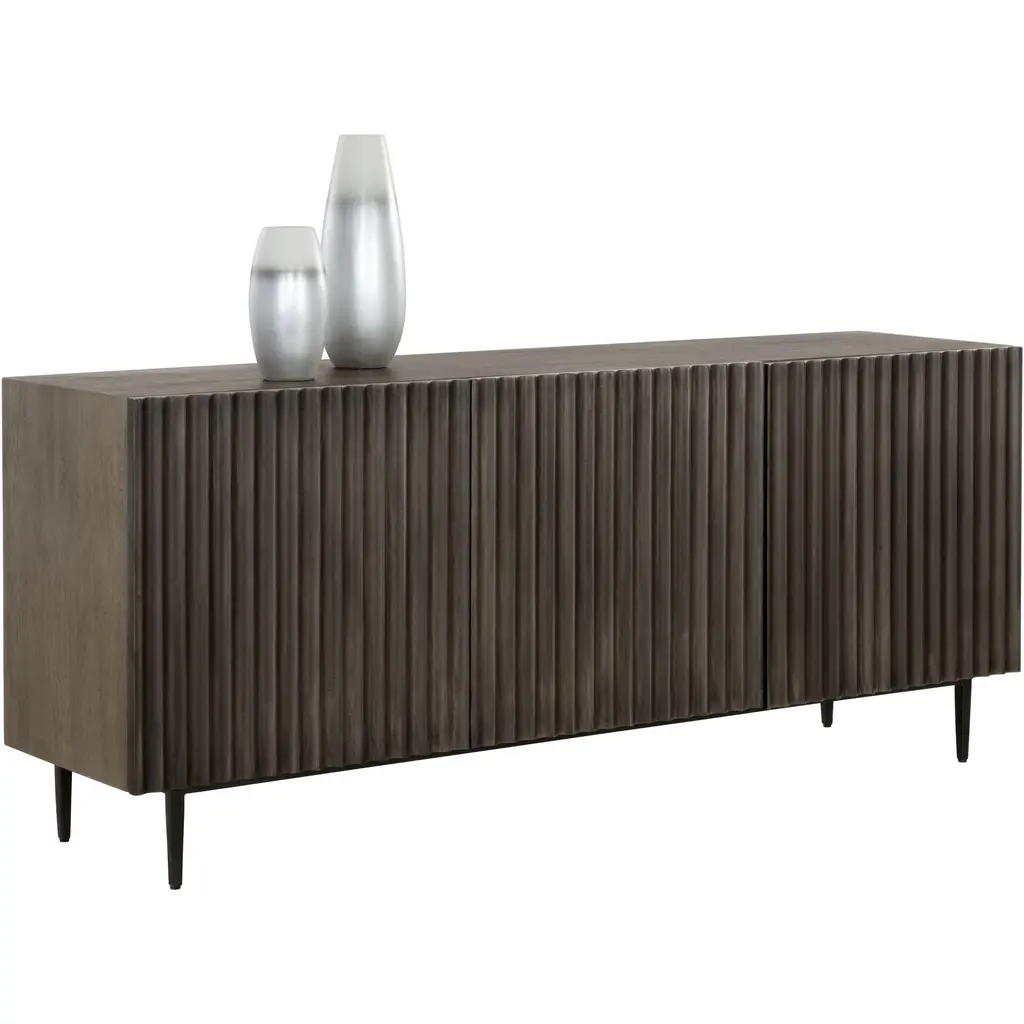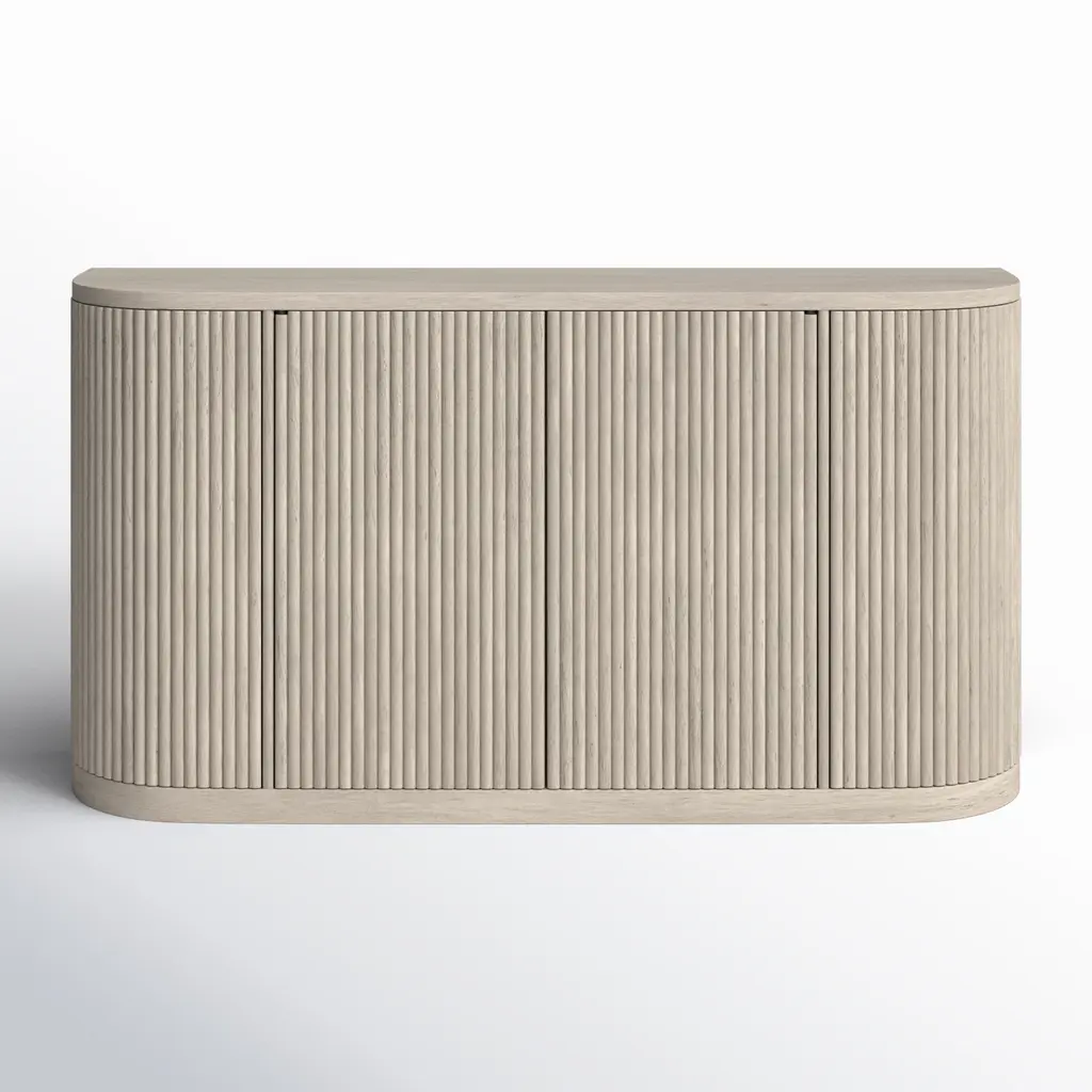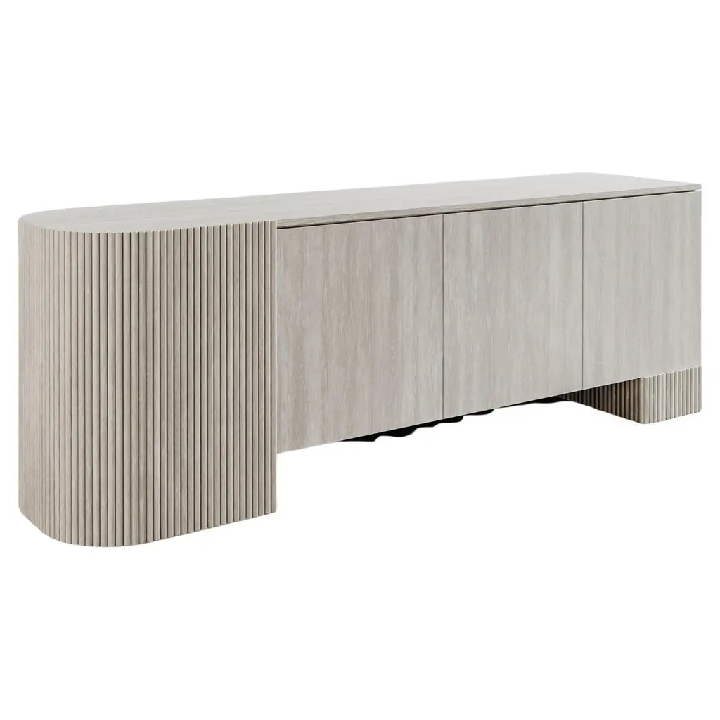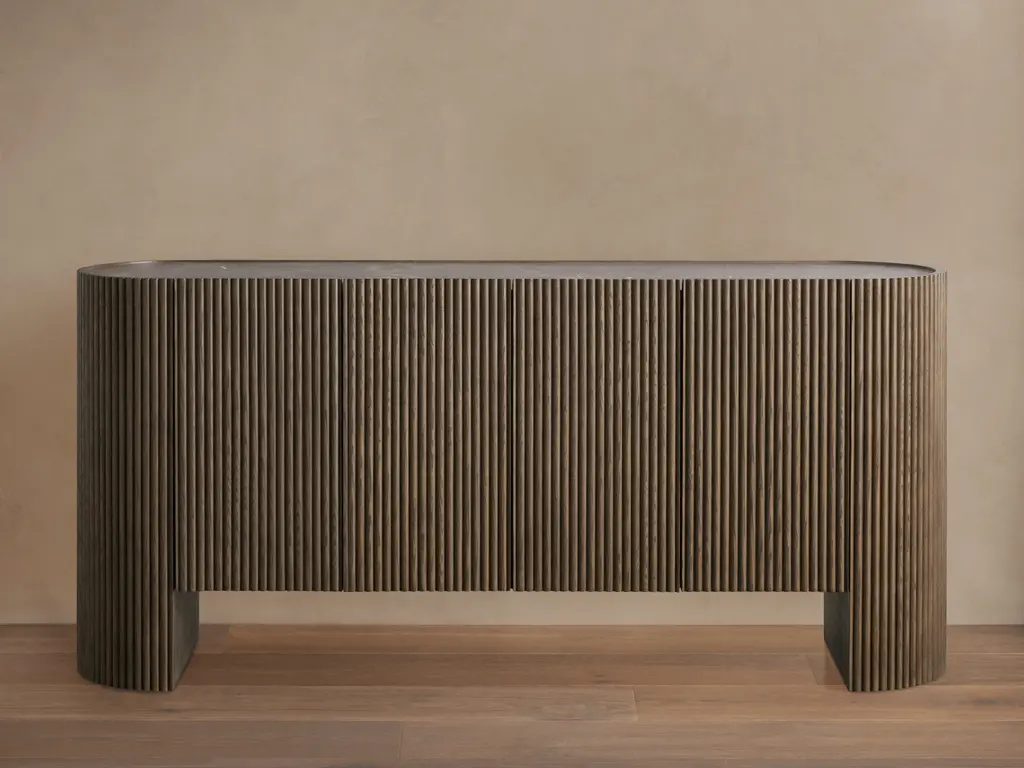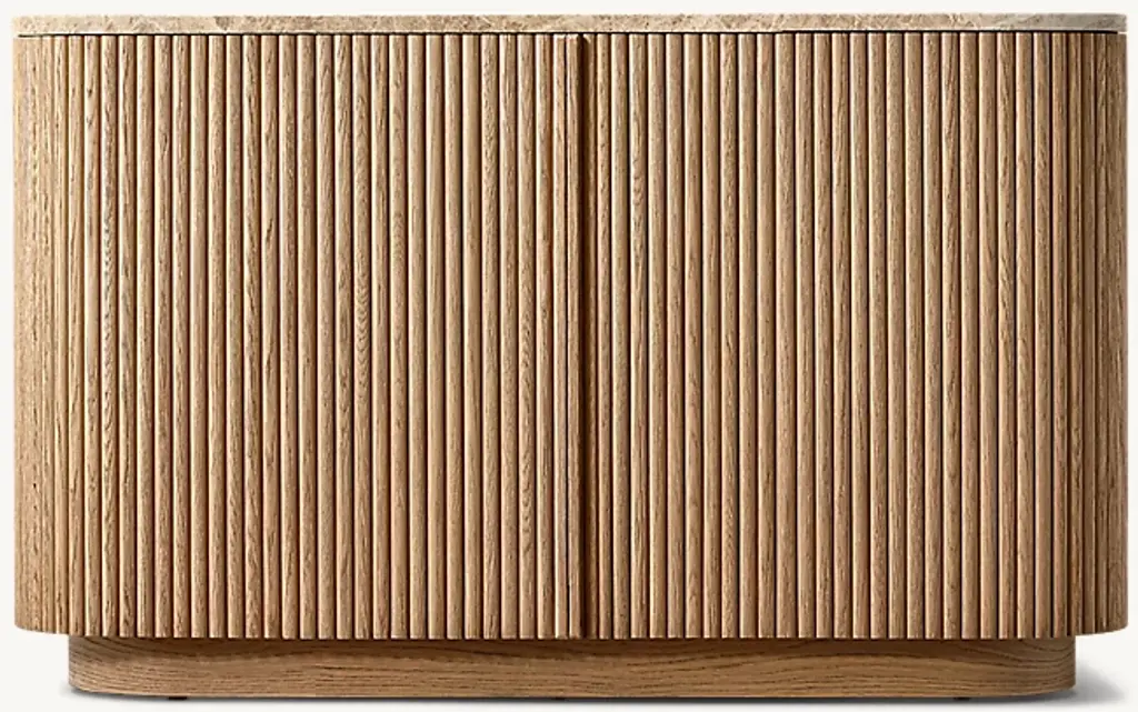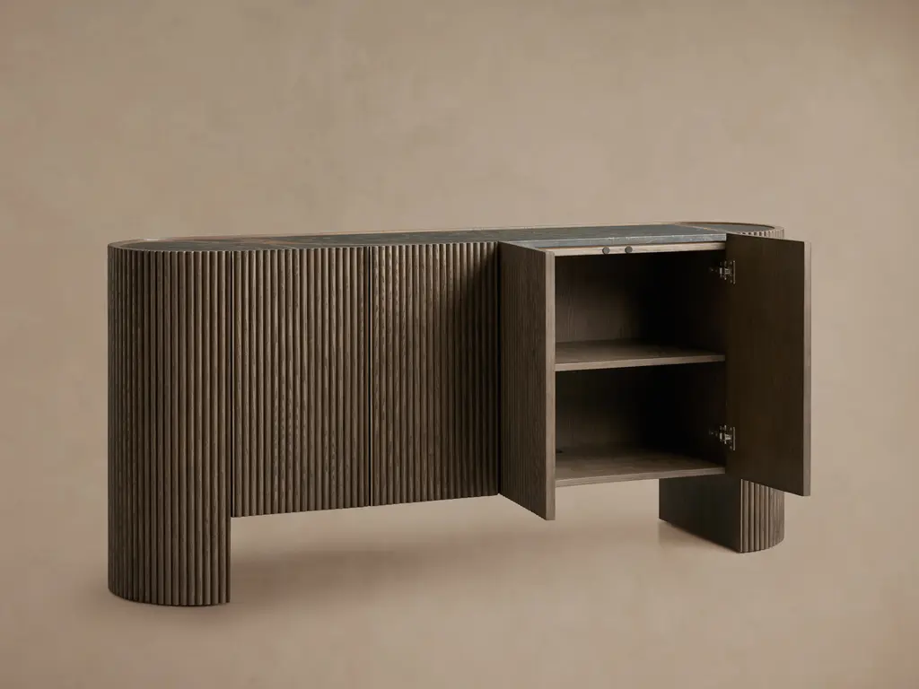 Celebrating craftsmanship with chic style, our Flore Collection’s racetrack silhouette features inset stone tops and gorgeous reeded detailing surrounding the entire piece allowing it to float in any space. Accent your dining room, living space, entryway, home office, and more with Flore’s uniquely crafted curves, soft-close doors housing interior shelving, and elegant mixed-material design available in your choice of two finishes and three stone top options.