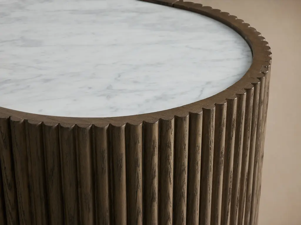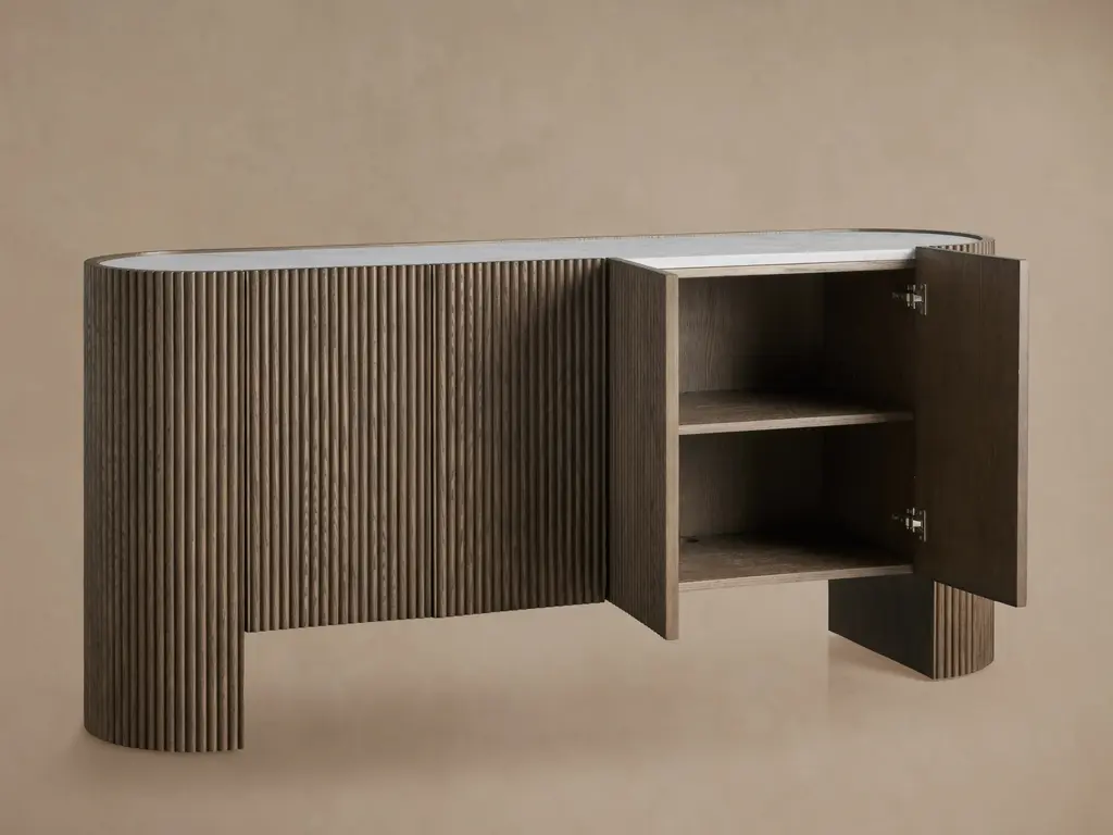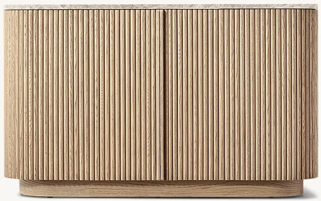 Celebrating craftsmanship with chic style, our Flore Collection’s racetrack silhouette features inset stone tops and gorgeous reeded detailing surrounding the entire piece allowing it to float in any space. Accent your dining room, living space, entryway, home office, and more with Flore’s uniquely crafted curves, soft-close doors housing interior shelving, and elegant mixed-material design available in your choice of two finishes and three stone top options.
