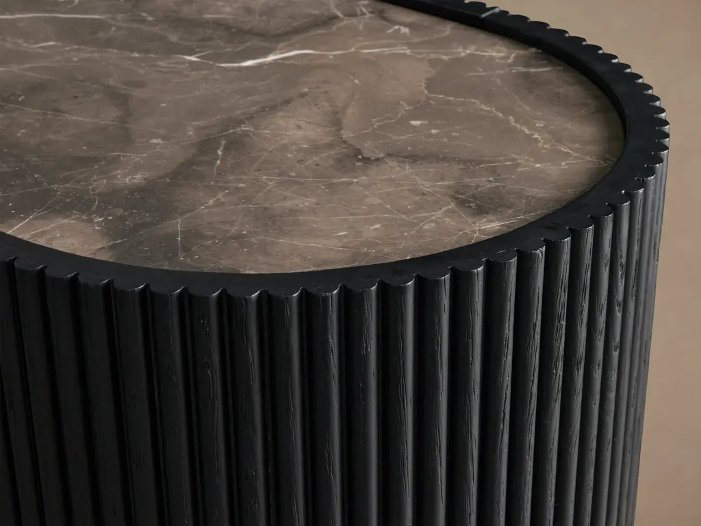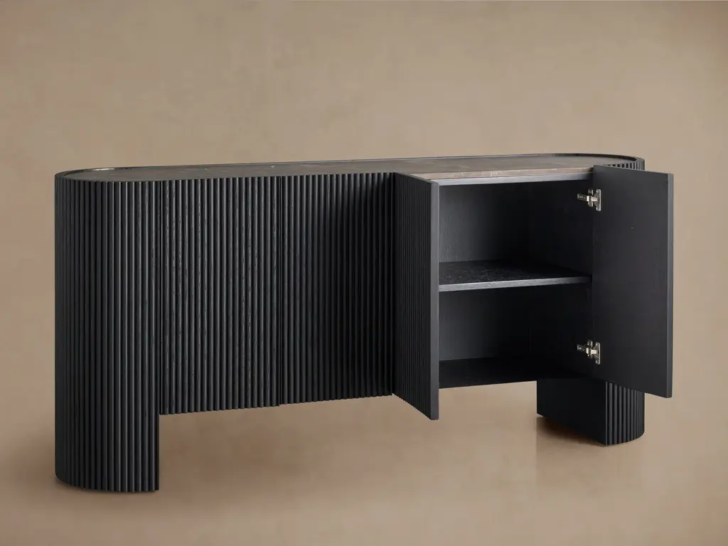 Celebrating craftsmanship with chic style, our Flore Collection’s racetrack silhouette features inset stone tops and gorgeous reeded detailing surrounding the entire piece allowing it to float in any space. Accent your dining room, living space, entryway, home office, and more with Flore’s uniquely crafted curves, soft-close doors housing interior shelving, and elegant mixed-material design available in your choice of two finishes and three stone top options.
