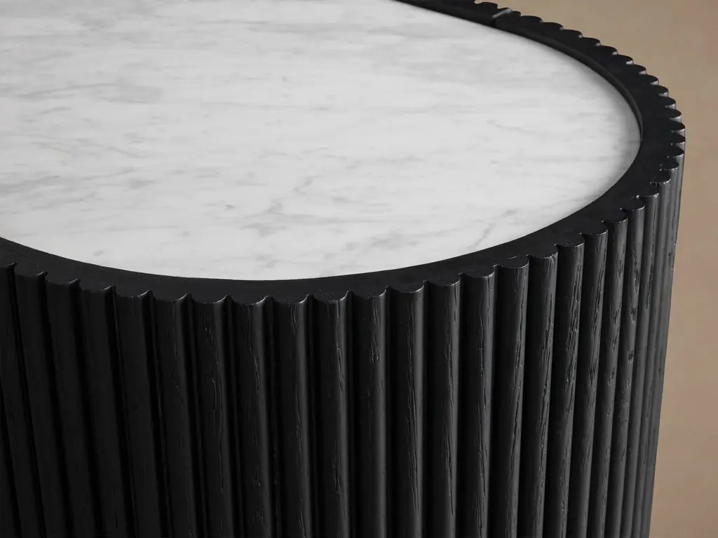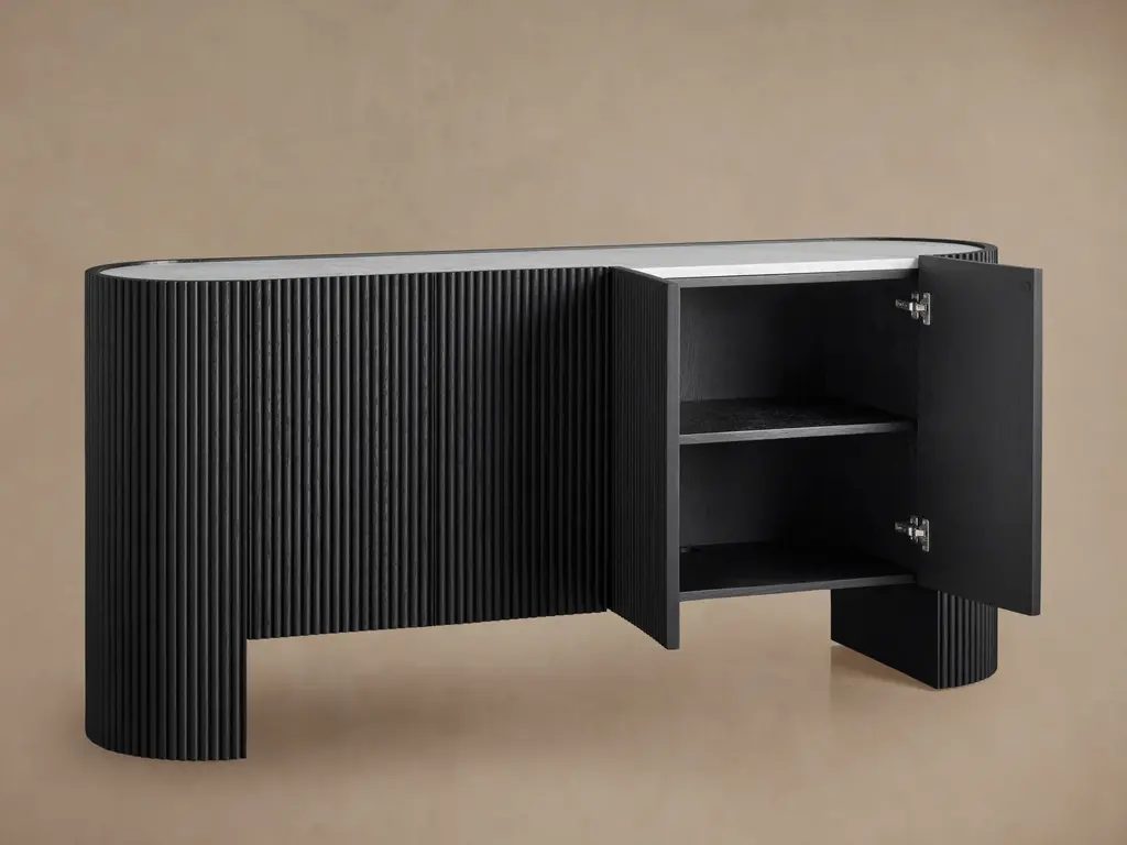 Celebrating craftsmanship with chic style, our Flore Collection’s racetrack silhouette features inset stone tops and gorgeous reeded detailing surrounding the entire piece allowing it to float in any space. Accent your dining room, living space, entryway, home office, and more with Flore’s uniquely crafted curves, soft-close doors housing interior shelving, and elegant mixed-material design available in your choice of two finishes and three stone top options.