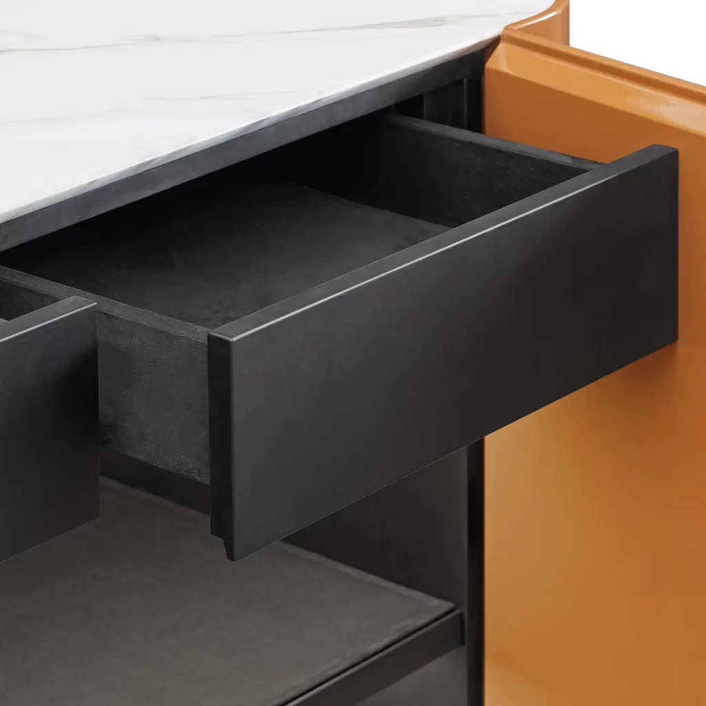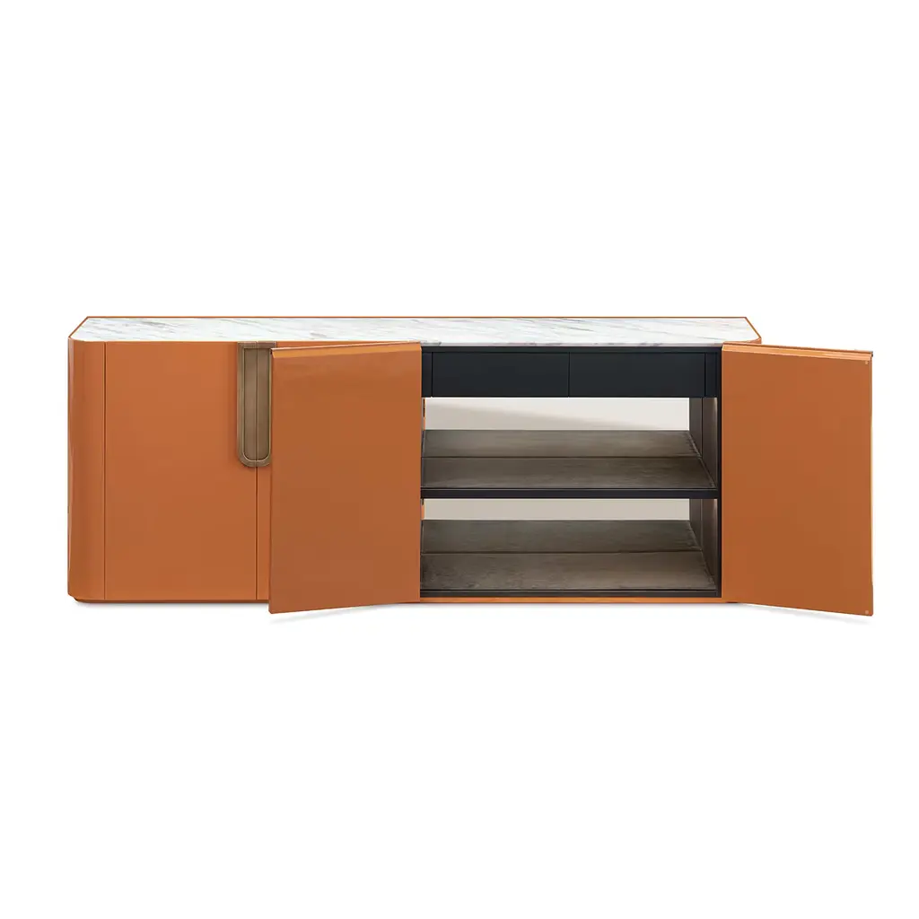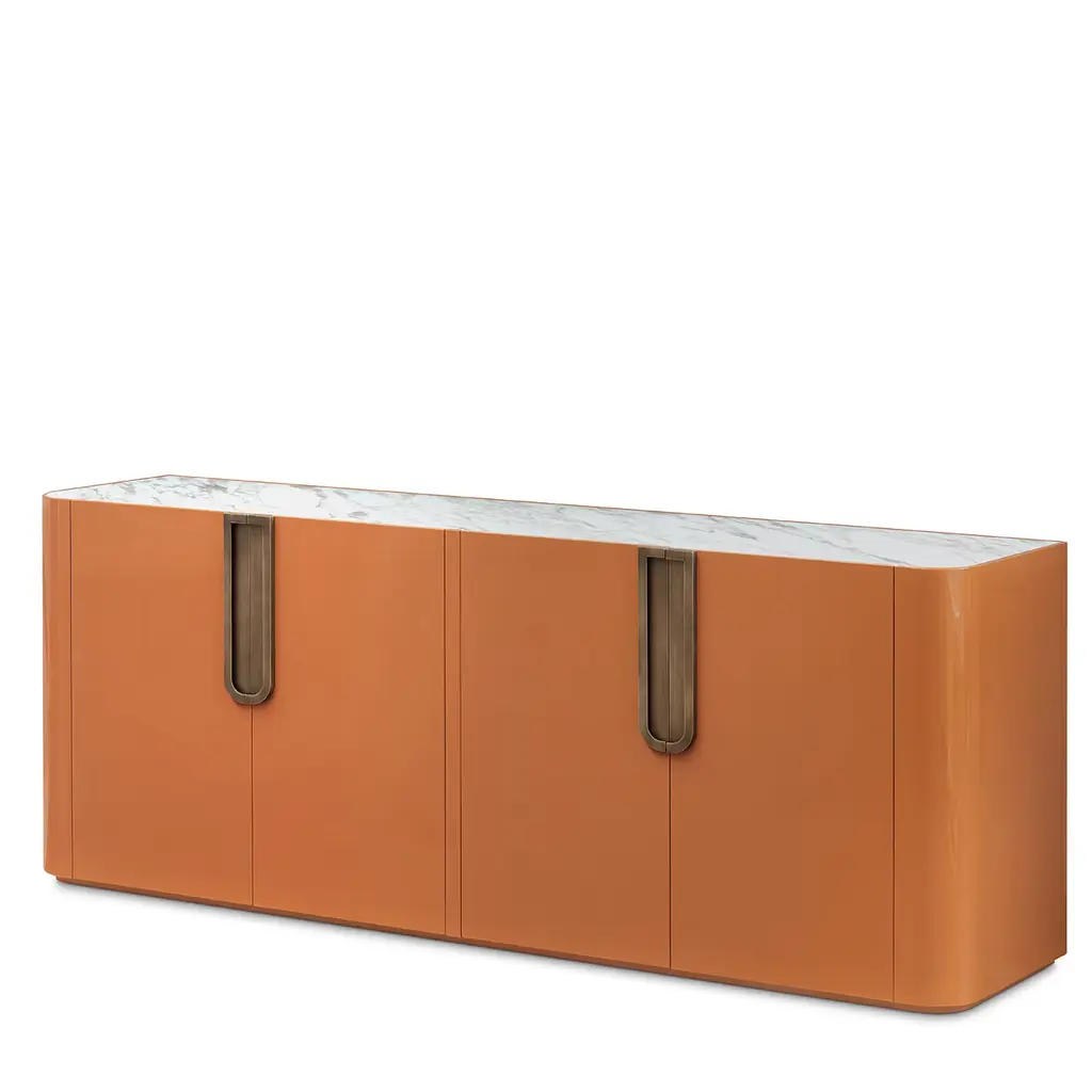 Inspired by the concept of a buffet, this sideboard boasts an exceptionally practical character combined with an elegant aesthetic. Exclusive and iconic, it is distinguished by a Calacatta gold marble top and mosaic handles, enhancing the precious and luminous qualities of this design. Its interior is lacquered and features a smokey glass back, illuminated with an opening-sensory LED lighting system. Also available in glass sheet, please ask the Concierge for more details.