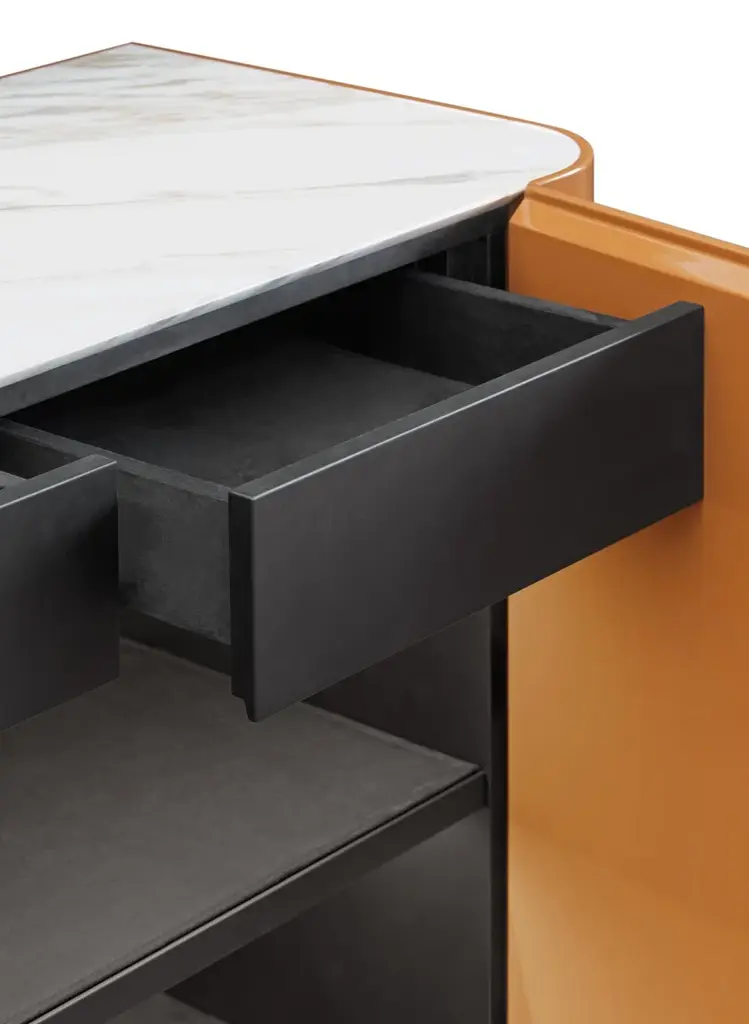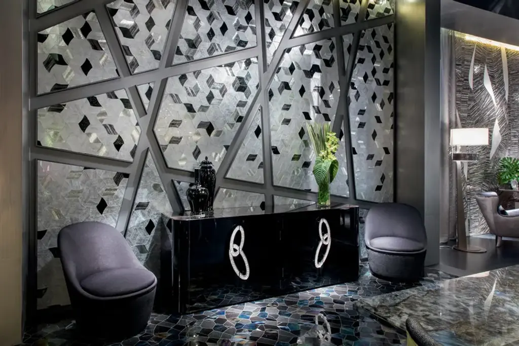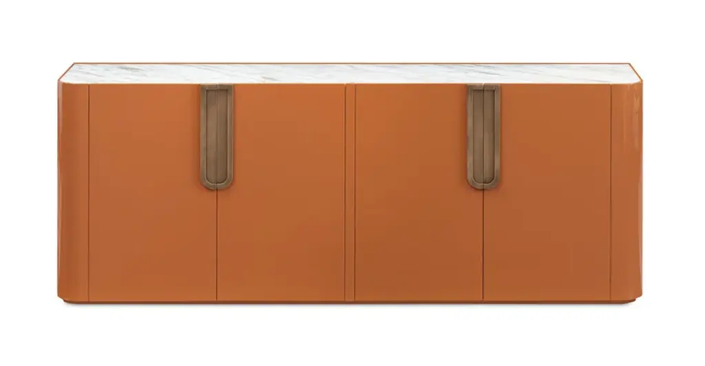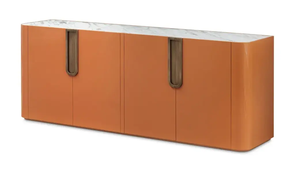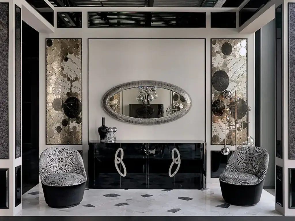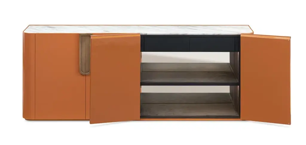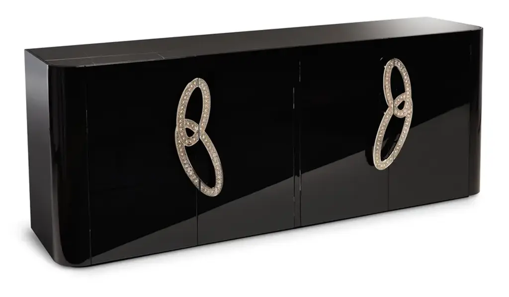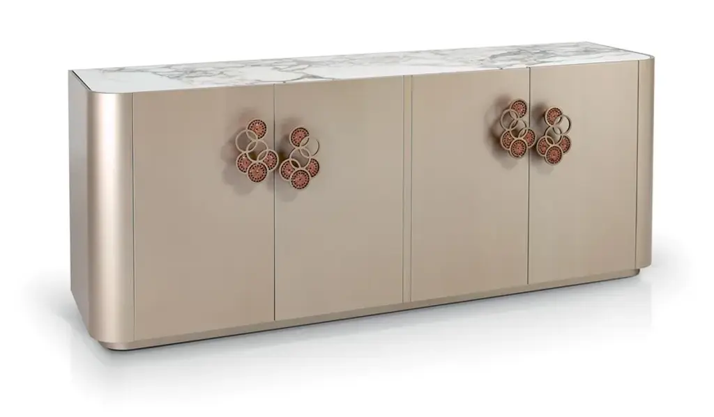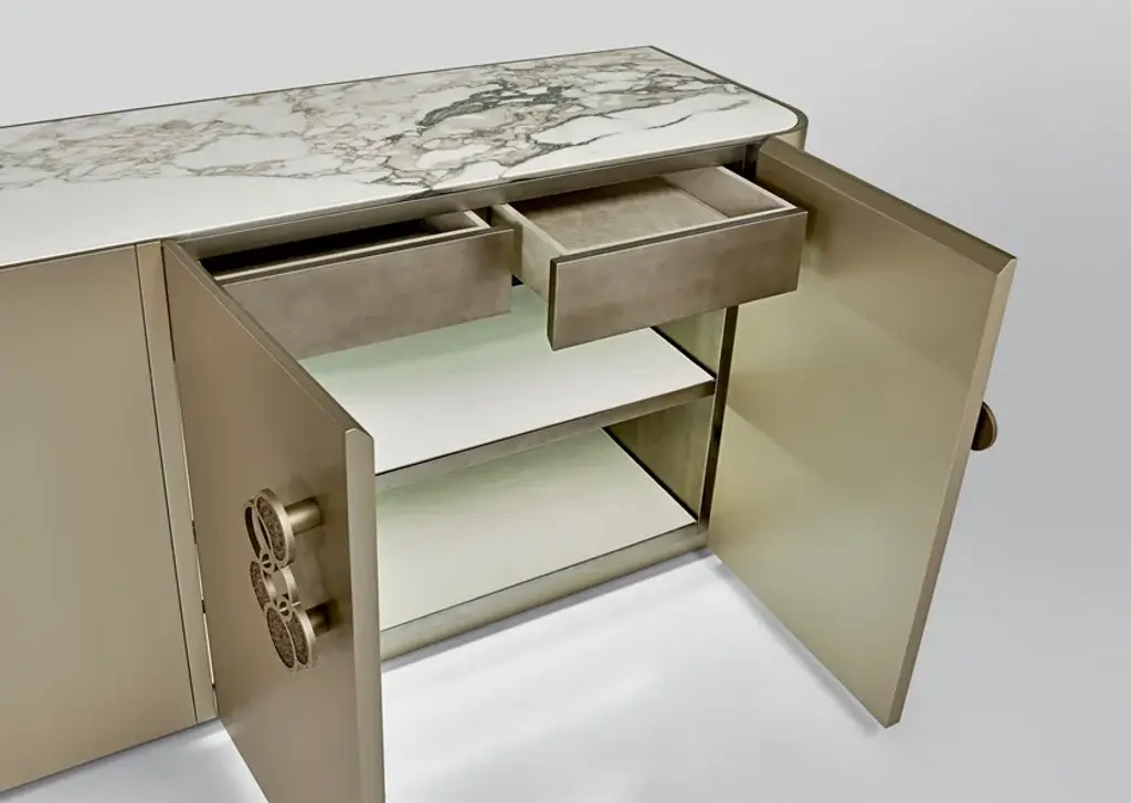 Thanks to its with wooden structure and marble or foam glass top, this sideboard has a refined and exclusive look. The handles, in minute mosaic, give light and three-dimensionality to the piece’s surfaces. Sideboard in glossy lacquered finish. Top in marble or foam glass. Lacquered interior with smoky mirror back. LED lighting with opening sensor. Drawers finished in microfiber. Polished chrome handles, decorated in minute mosaic.