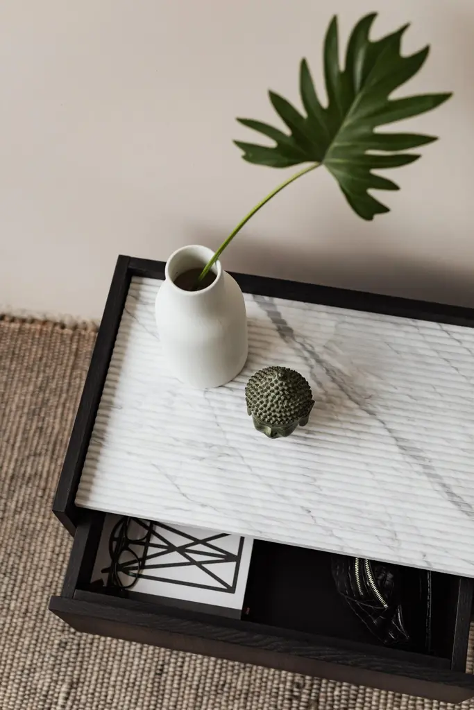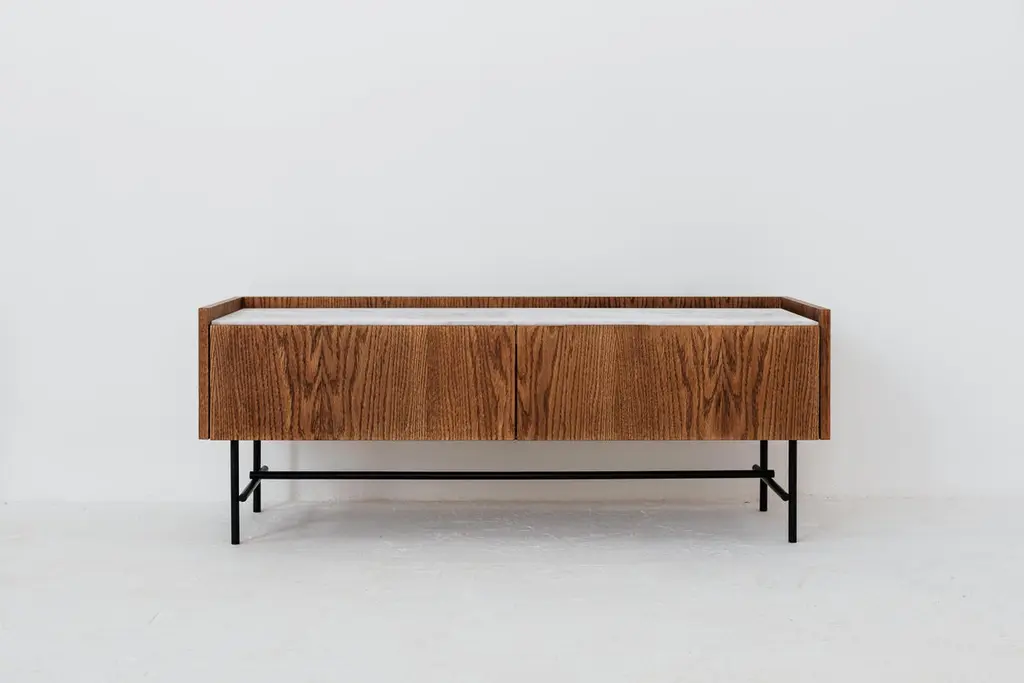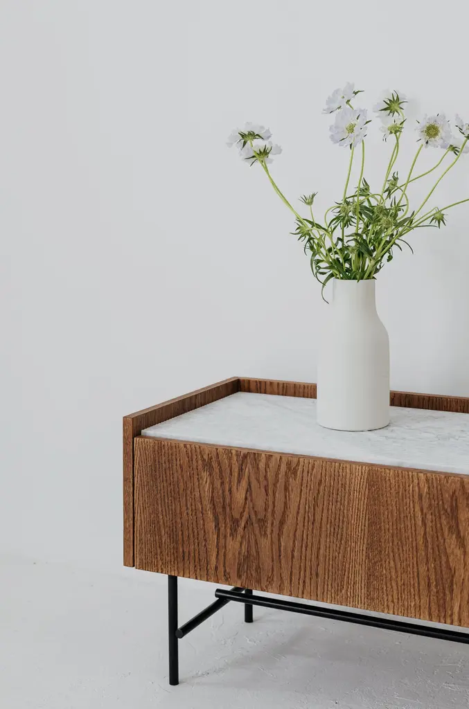 Forst Sideboard 2.0 by Un’commonDesigned by Małgorzata Korycka.Dimensions: D 40 x W 120 x H 46 cm.Materials: Oak and brushed Carrara marble.Available in different oak finishes. Available in different marble options. Please contact us.FORST SIDEBOARD 2.0 is an impressive and functional dresser. Unlike the FORST SIDEBOARD, it has two capacious drawers opened with the TIP ON system and a beautiful marble top, lying across the entire width of the dresser.Our Polish workshop designs and hand-makes furniture from marble and steel. Our furniture should not only be well-designed – it should be a feast for the senses. Nothing can produce this effect quite as good as marble.It is a beautiful, refined, natural material used for centuries in architecture, art, and everyday life. There are many different stone quarries, offering different types and colors of marble. However, because it is a natural material formed in a very complex process, it is virtually impossible to extract two identical pieces of stone. In our opinion, in a world ruled by plastic and mass production, this thrill of surprise is a bit of genuine luxury, reserved only for natural materials and their enthusiasts.Thanks to the physical properties of stone and precise workmanship, Un’common furniture is built to last. Over time, a natural patina may form on the surface, adding extra charm to your beautiful and refined furniture, which – if treated well – will reward you every day. Nothing can beat the taste of coffee when you drink it at a marble table.