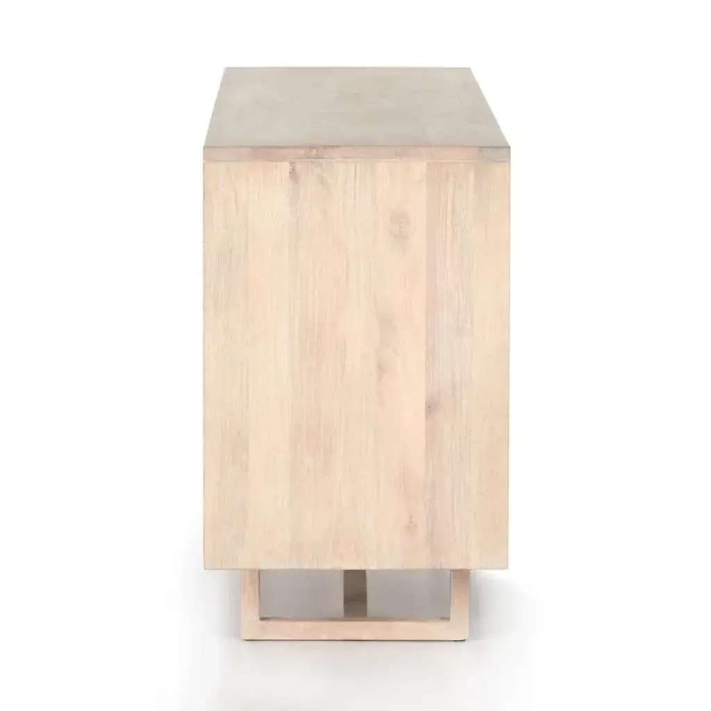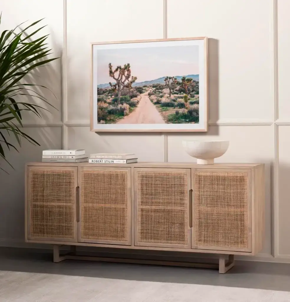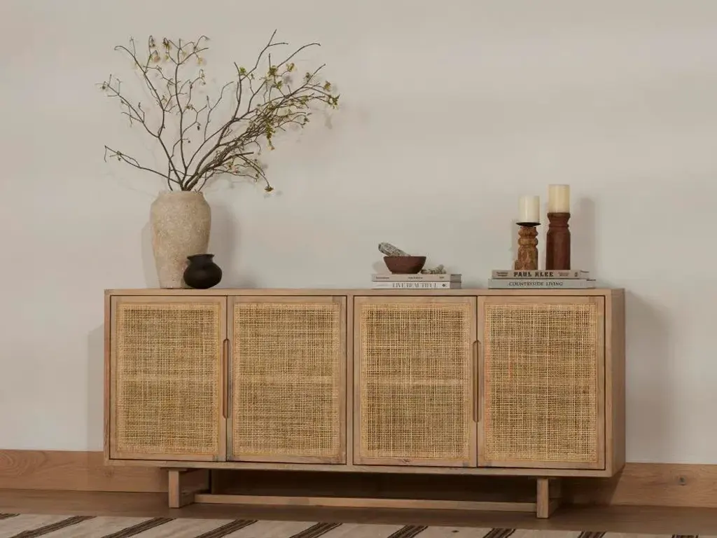 Mid century-spirited while beautifully on trend. A texture-driven sideboard of white-washed mango features door fronts with natural cane paneling. Spacious interior for plenty of storage space, with adjustable shelving plus rear cutouts for cord management. Assembly Required? Yes