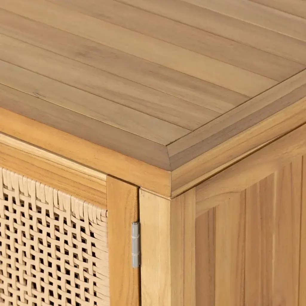 The cane trend moves outdoors. FSC®-certified teak frame is detailed with rattan-inspired woven panels for a breezy, crafted minimalism take on the outdoor cabinet. Includes two removable inner shelves. Cover or store indoors during inclement weather and when not in use. Assembly Required? No