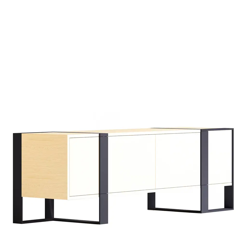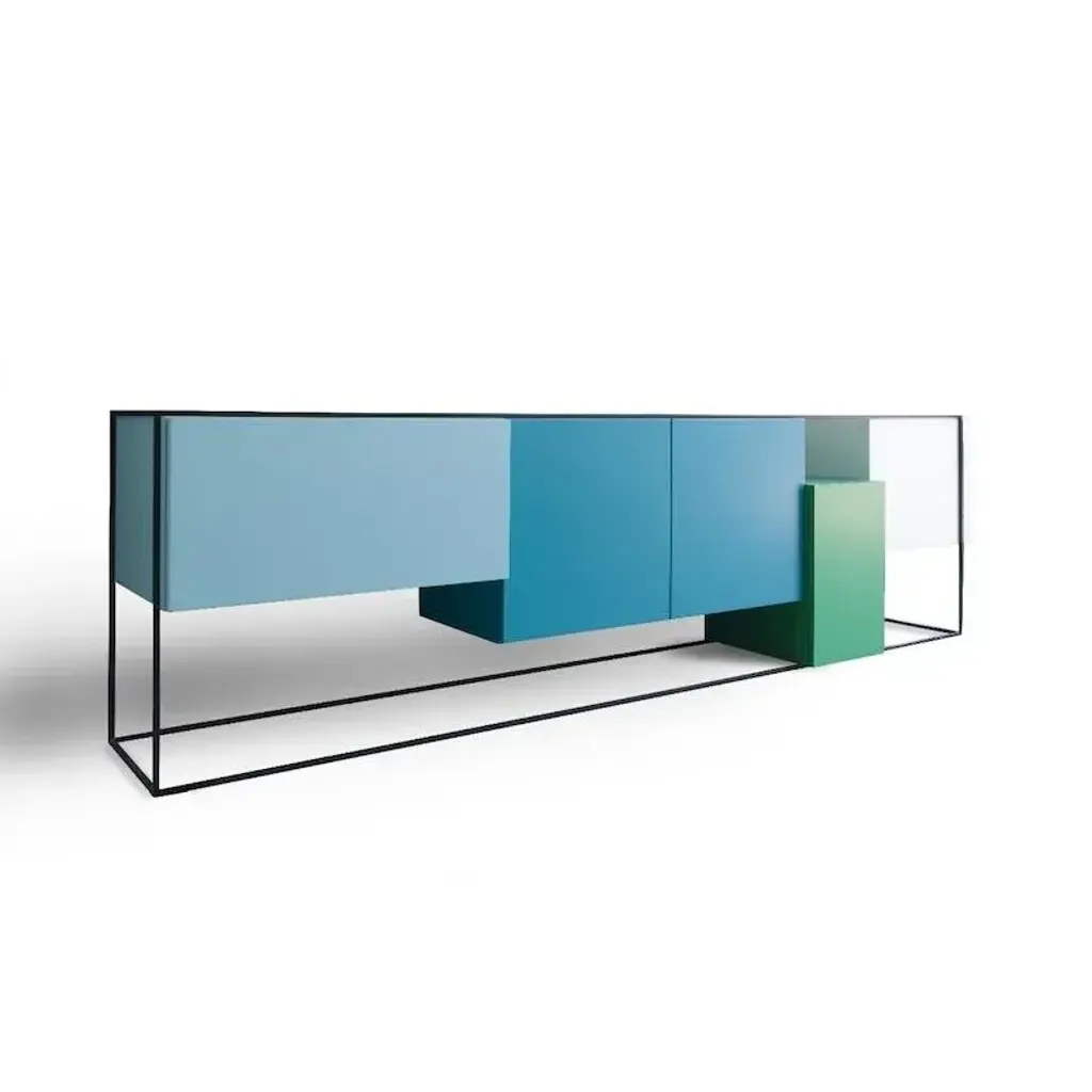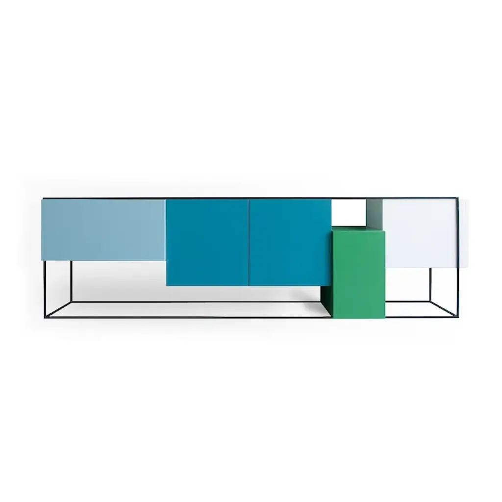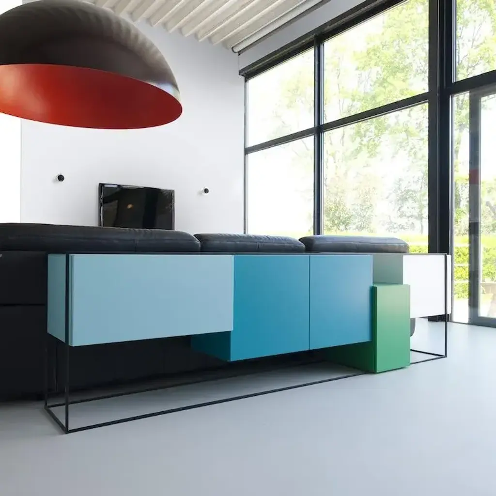 This varnished buffet is a storage cabinet composed of multiple units in different colours. All units are integrated into a black steel frame. A colorful design by Koenraad Ruys.