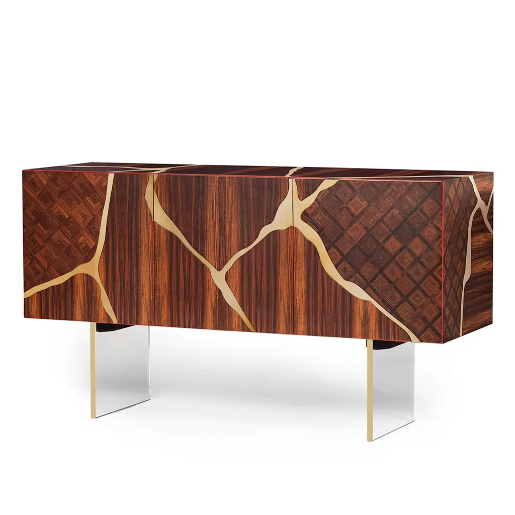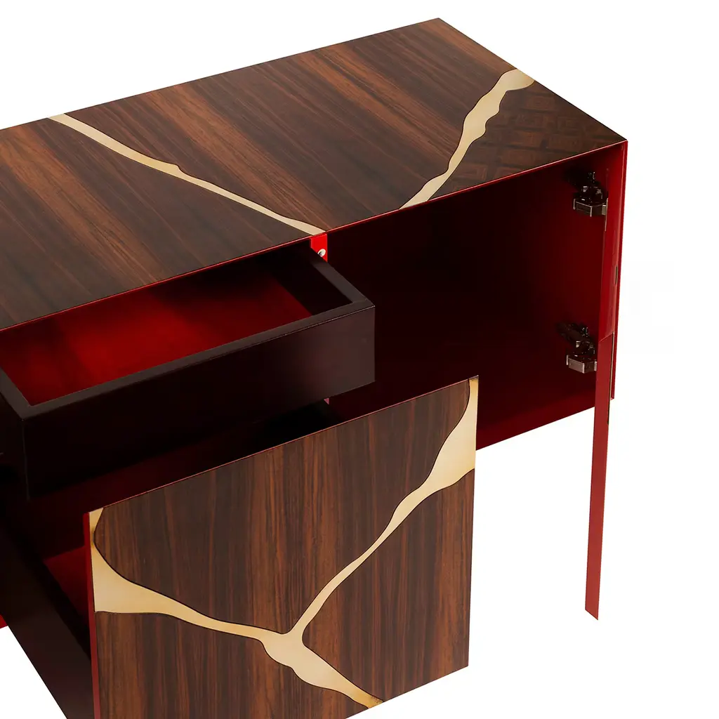Inspired by the ancient Japanese technique known as Kintsugi, this gorgeous sideboard is a flawless bridge between tradition and innovation. Symbolic of the harmonious blend of past and present, it is handcrafted of veneered and carved rosewood, enriched with inserts in gold-finished steel. Its interior is in red birch wood, while the base is in gold-finished metal. Also available in durmast and ash, please inquire with the Concierge for details.