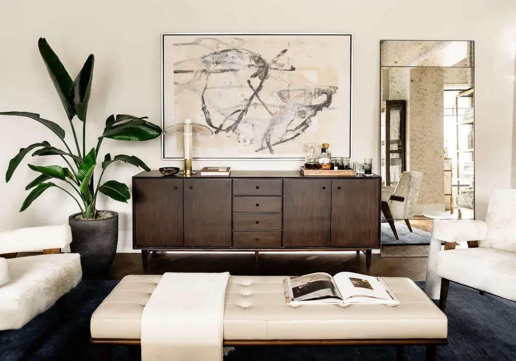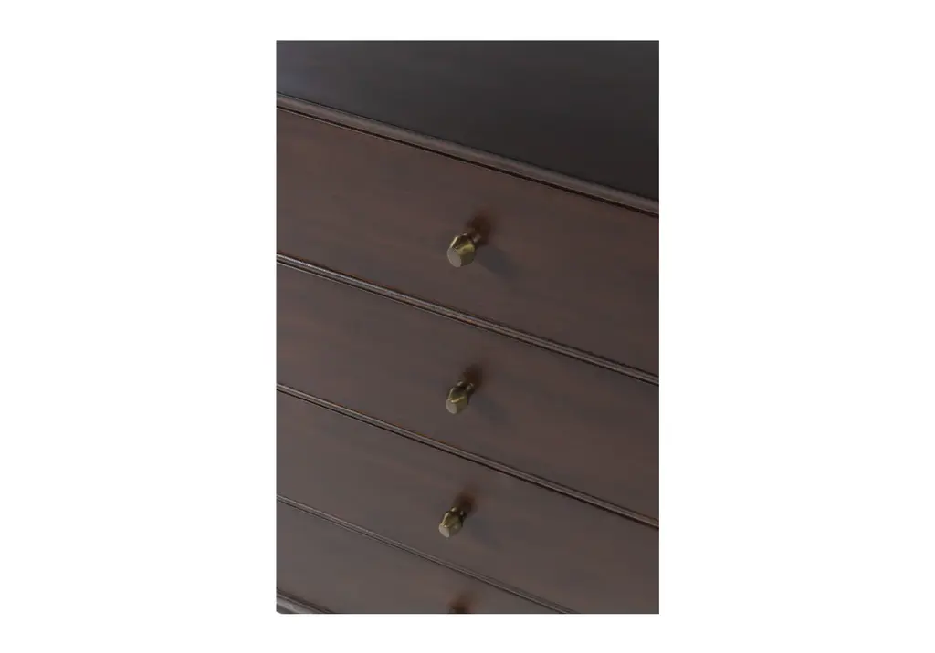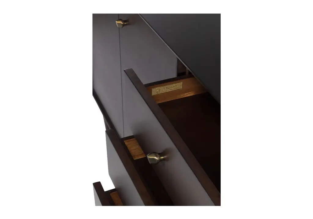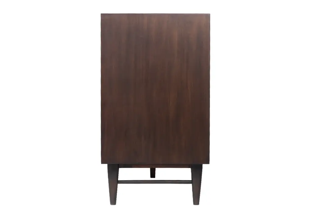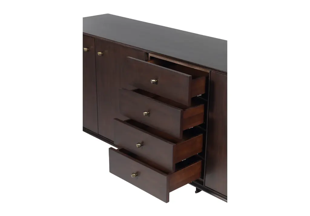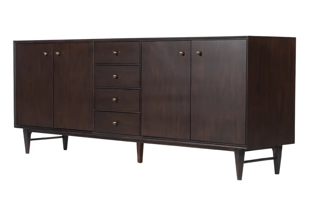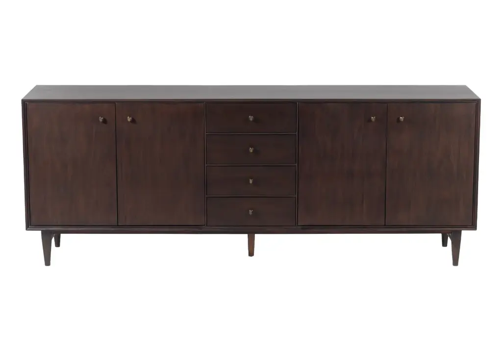 The Frank Sideboard gives an elevated, mid-century feel with its handsome design. Its dark mahogany box, doors, and drawers add a rich sophistication to any room. Organic-shaped bronzed knobs provide additional dimension complemented by ample hidden storage. Style in a living room, dining room, office, or bedroom for a one-of-a-kind design.