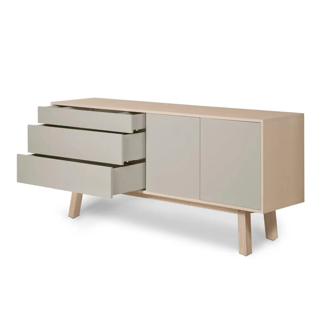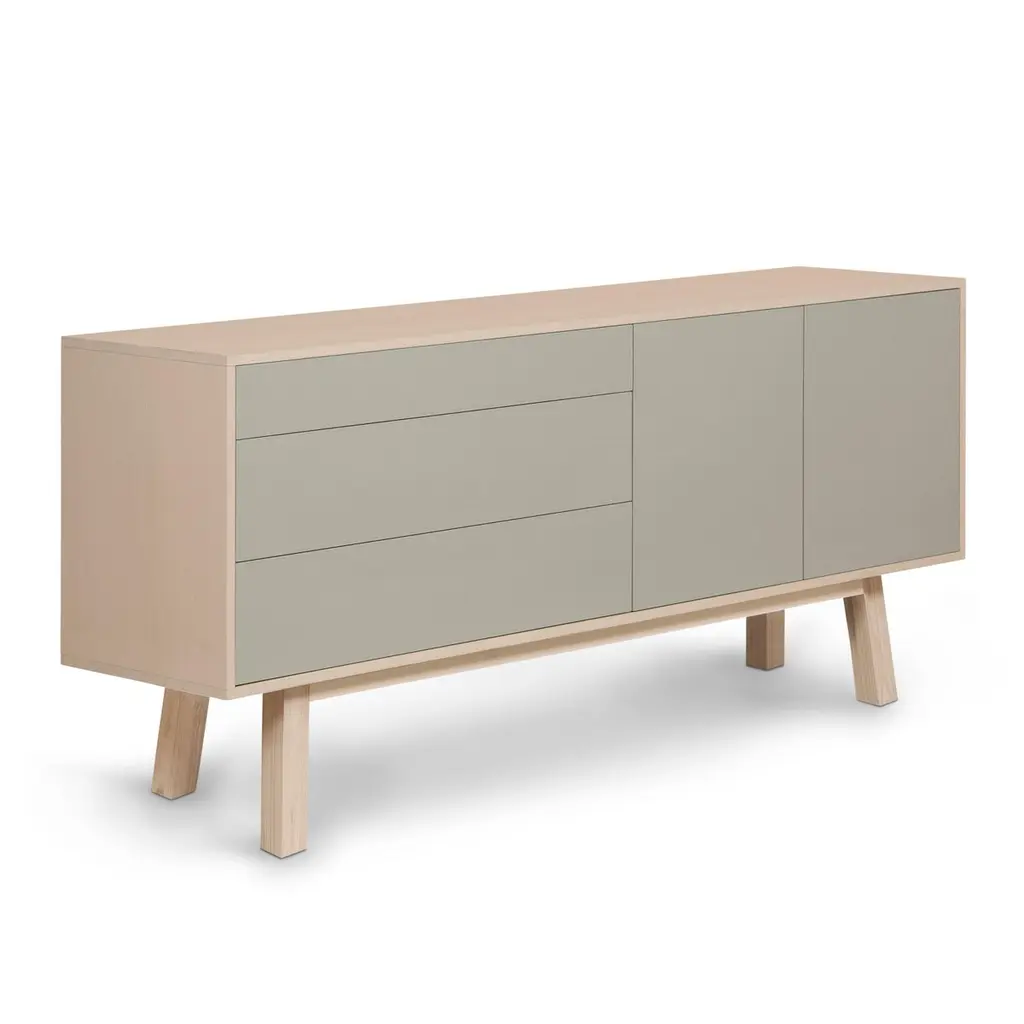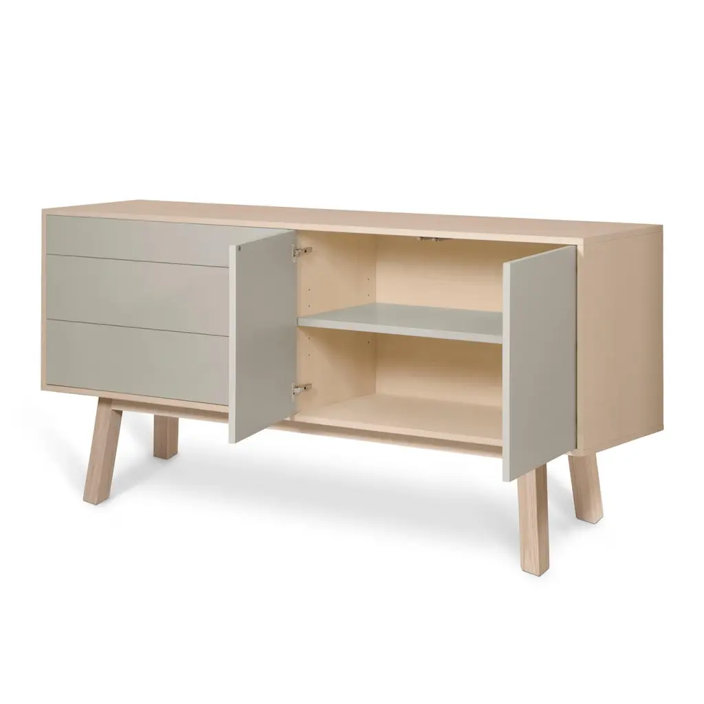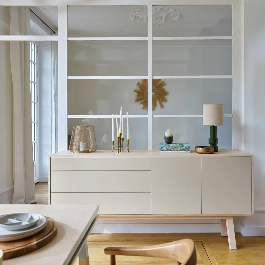 This 2-door, 3-drawer sideboard is presented here in ash wood and also available in French oak.No assembly is required from your side, the furniture is fully mounted in our workshop.The 3 drawers take up half the total length. The drawers fronts are solidly assembled with dovetail joints. The top drawer is lower than the other 2 and features 2 removable interior wooden dividers. The 2 lower drawers are normal drawers without dividers. Behind the 2 hinged doors, 1 height-adjustable shelf on cleats is supplied with the sideboard. To prevent damage during transport, it is positioned at the bottom of the buffet. All you have to do is place it on the cleats (supplied) at the desired height upon reception. Doors and drawers open with a « push & release » pressure on the front.ÉGÉE COLLECTIONThis high & large 2-door 3 -drawer sideboard is part of the ÉGÉE collection, designed by the Parisian designer Eric GIZARD who here adopts the refined codes of Scandinavian design. combining natural materials, elegance and sobriety of lines by adding very beautiful muted and "trendy" colors.Inside the ÉGÉE collection, the KUBE concept is designed to offer an optimized and aesthetically pleasing storage concept.MON PETIT MEUBLE FRANÇAISoffers you 100% French products. The solid wood comes exclusively from sustainably managed French forests.The manufacture and finishes are of very high quality, carried out in French workshops in Mayenne, France.