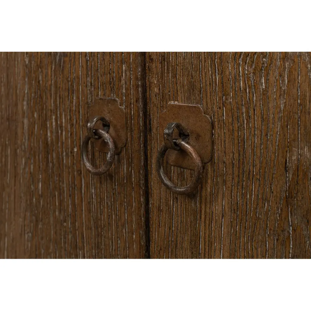 French Art Deco sideboard, made of Elm, the sideboard has four doors opening to two separate compartments. With an antiqued rustic finish and raised on round tapered legs. The interior with two removable shelves.Dimensions: 87" W x 19" D x 34" H.