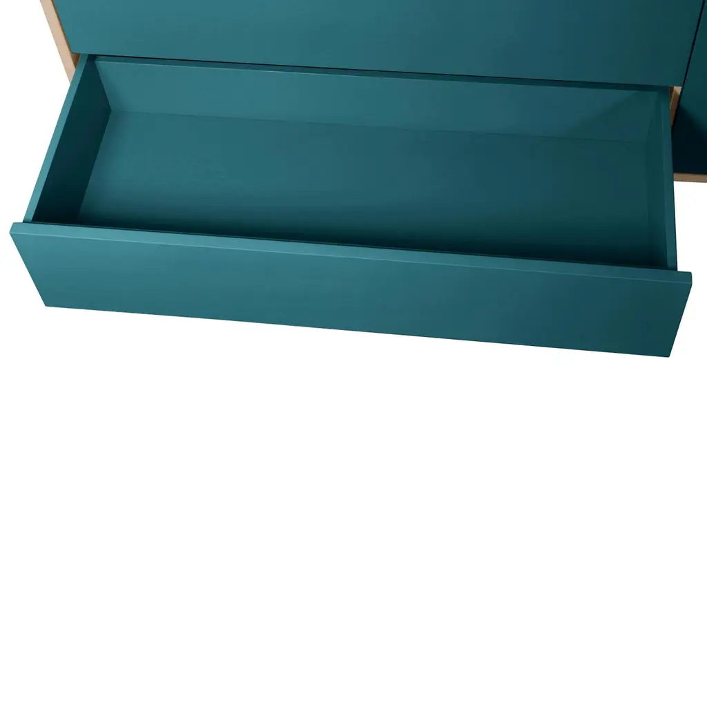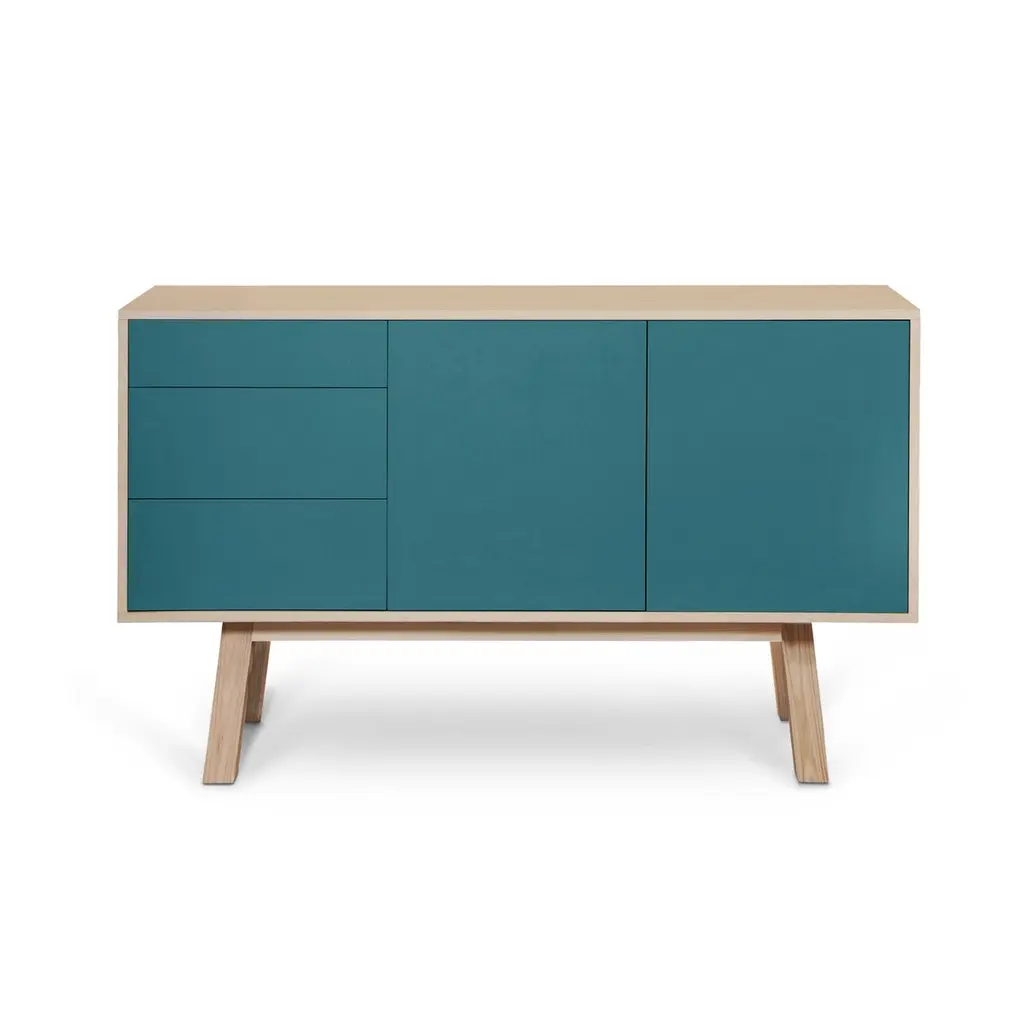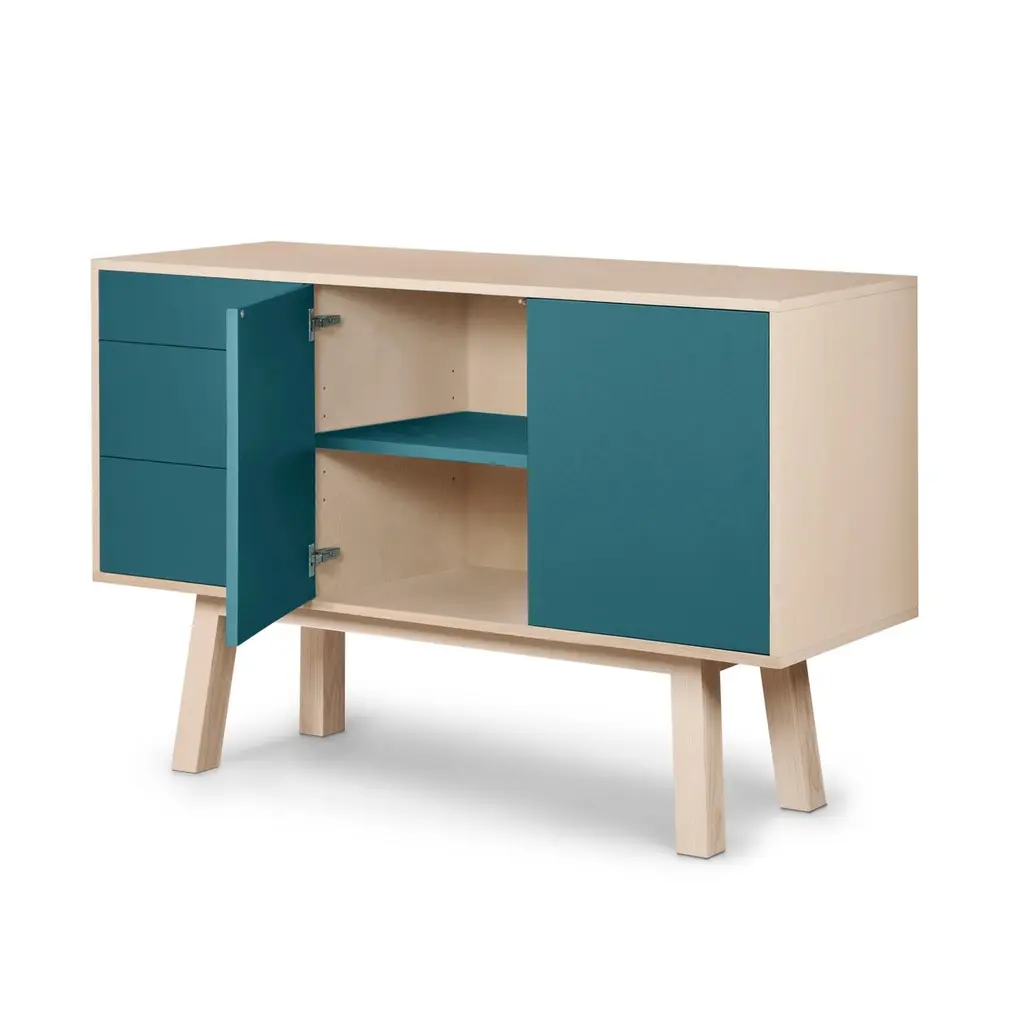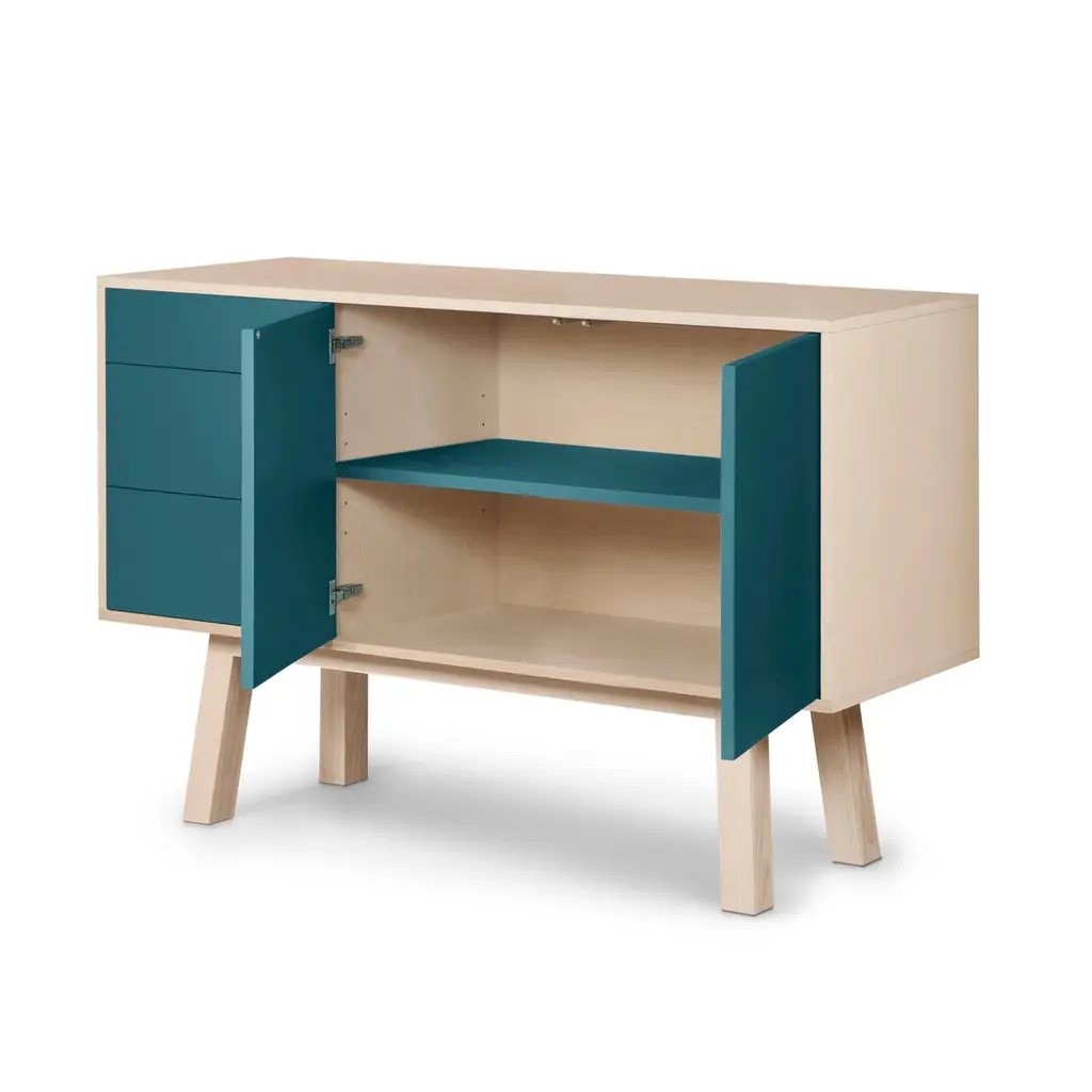 This 2 doors and 3 drawers sideboard is designed by Eric Gizard - Paris.It is 100% made in France with solid ash wood, veneer and lacquered doors in MDF panels. Each door and each drawer opens with a "push-to-release" pressure. An adjustable wooden shelf on cleats is placed behind the 2 doors. The shelf's colour is identical to the doors' colour.The first drawer is lower and can store cutlery, napkins, placemats, etc.In this small drawer, 2 movable wooden dividers allow you to create 3 storage spaces as you wish (see the last detail picture). The other 2 drawers are regular drawers without divider.collection ÉGÉEThis sideboard is part of the ÉGÉE collection designed by Eric Gizard in Paris. Eric combines the sleek and refined codes of Scandinavian design with natural materials and muted and "trendy" colorful lacquers.MON PETIT MEUBLE FRANCAISprovides exclusively 100% Made in France Furniture. The manufacture and finishes are of very high-end quality, carried out in French craft workshops, in the west countryside of France: Loire and Bretagne. Solid ash comes from sustainably managed French forests.