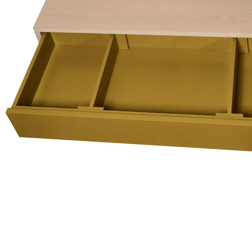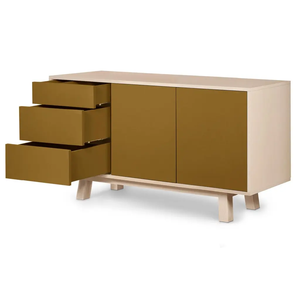 This 2-door and 3-drawer low sideboard is designed by Eric Gizard - Paris.It is 100% made in France with solid ash wood, veneer and lacquered doors in MDF panels. Each door and each drawer opens with a "push-to-release" pressure. An adjustable wooden shelf on cleats is placed behind the 2 doors. The shelf's colour is identical to the doors' colour.The first drawer is lower and can store cutlery, napkins, placemats, etc.In this small drawer, 2 movable wooden dividers allow you to create 3 storage spaces as you wish (see the last detail picture). The other 2 drawers are regular drawers without divider.collection ÉGÉEThis sideboard is part of the ÉGÉE collection designed by Eric Gizard in Paris. Eric combines the sleek and refined codes of Scandinavian design with natural materials and muted and "trendy" colorful lacquers.MON PETIT MEUBLE FRANCAISprovides exclusively 100% Made in France Furniture. The manufacture and finishes are of very high-end quality, carried out in French craft workshops, in the west countryside of France: Loire and Bretagne. Solid ash comes from sustainably managed French forests.