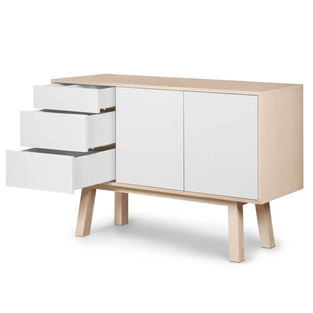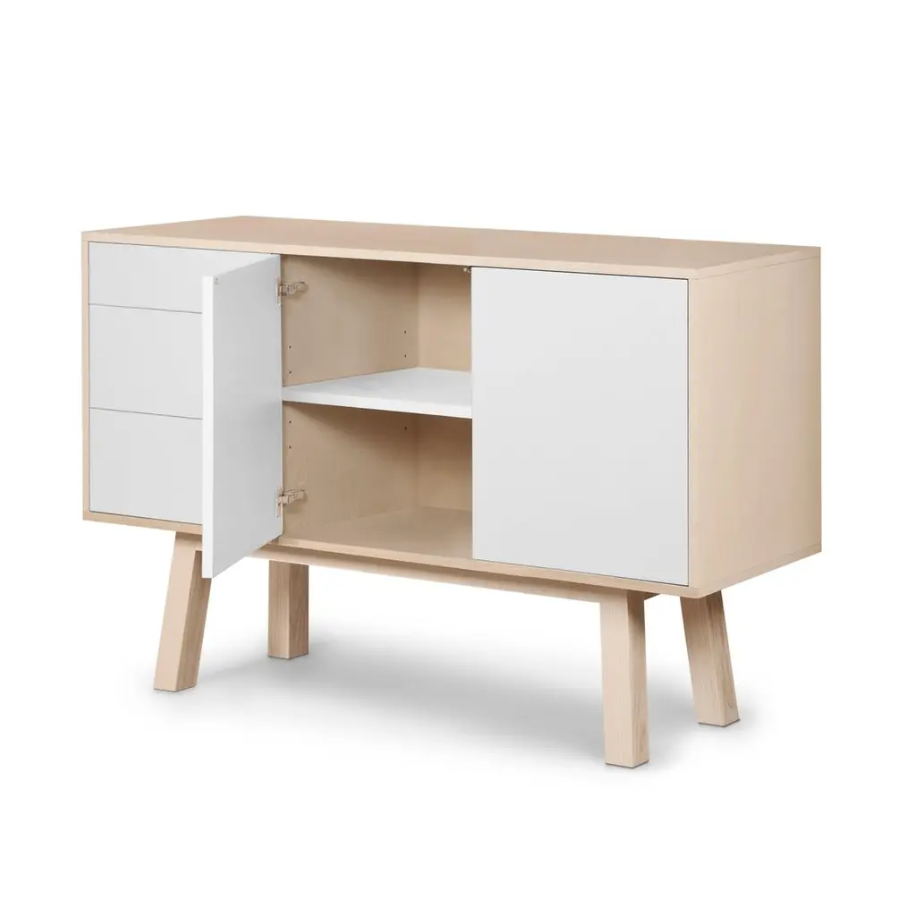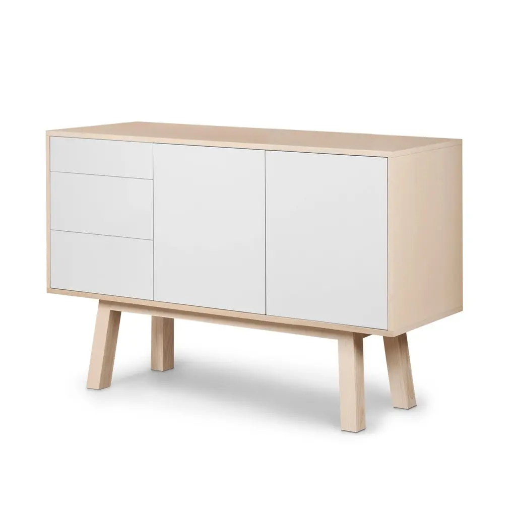 This 2 doors and 3 drawers sideboard is designed by Eric Gizard - Paris.It is 100% made in France with solid ash wood, veneer and lacquered doors in MDF panels. Each door and each drawer opens with a "push-to-release" pressure. An adjustable wooden shelf on cleats is placed behind the 2 doors. The shelf's colour is identical to the doors' colour.The first drawer is lower and can store cutlery, napkins, placemats, etc.In this small drawer, 2 movable wooden dividers allow you to create 3 storage spaces as you wish (see the last detail picture). The other 2 drawers are regular drawers without divider.collection ÉGÉEThis sideboard is part of the ÉGÉE collection designed by Eric Gizard in Paris. Eric combines the sleek and refined codes of Scandinavian design with natural materials and muted and "trendy" colorful lacquers.MON PETIT MEUBLE FRANCAISprovides exclusively 100% Made in France Furniture. The manufacture and finishes are of very high-end quality, carried out in French craft workshops, in the west countryside of France: Loire and Bretagne. Solid ash comes from sustainably managed French forests.