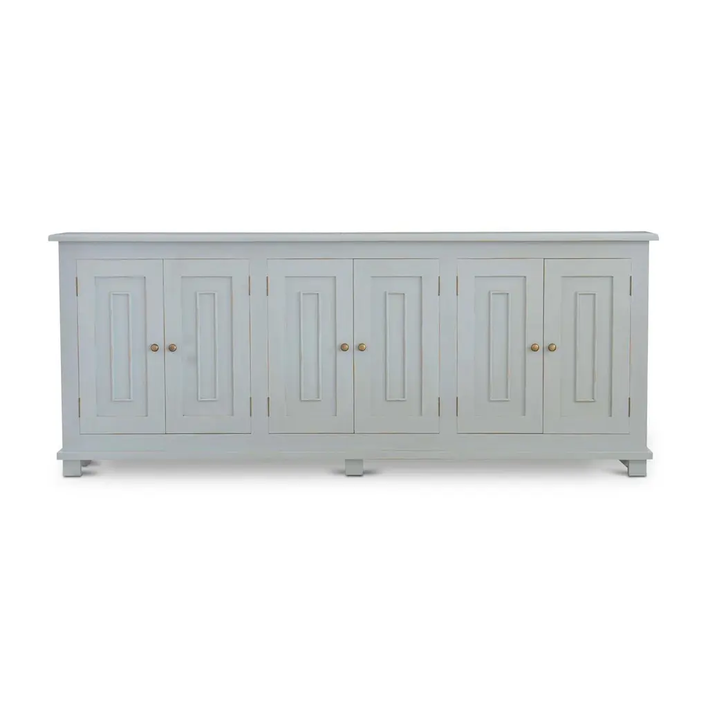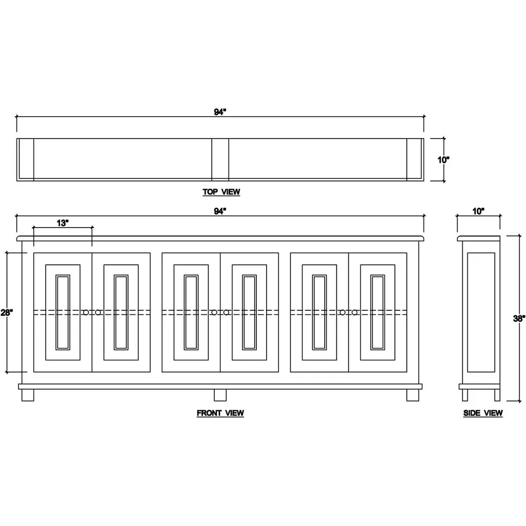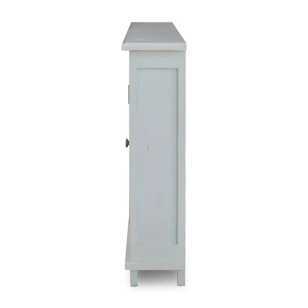 Featuring a lightly distressed ocean blue finish, this elegant piece, measuring 94" x 10" x 38", is perfect for adding a touch of rustic sophistication to any room.Designed with both style and functionality in mind, this sideboard offers ample storage space behind its beautifully paneled doors, making it ideal for keeping your essentials organized. The unique narrow design ensures it fits seamlessly into tight spaces, while the exquisite ocean blue finish adds a serene and stylish touch to your decor.Dimensions: 94" W x 10" D x 38" H