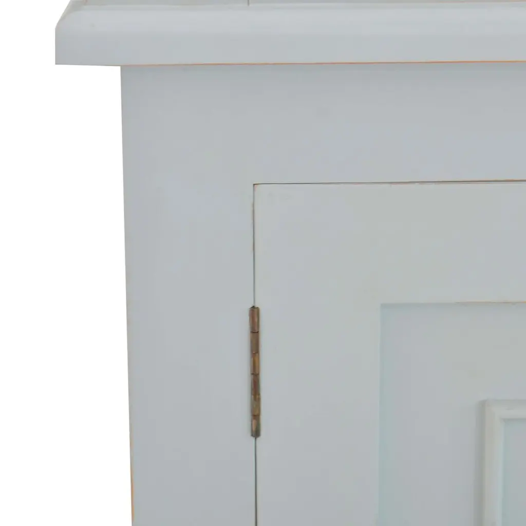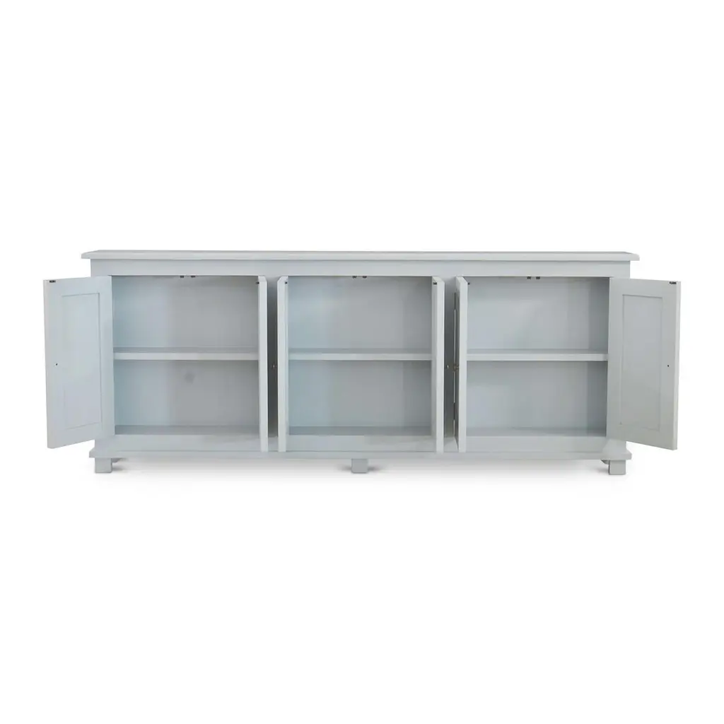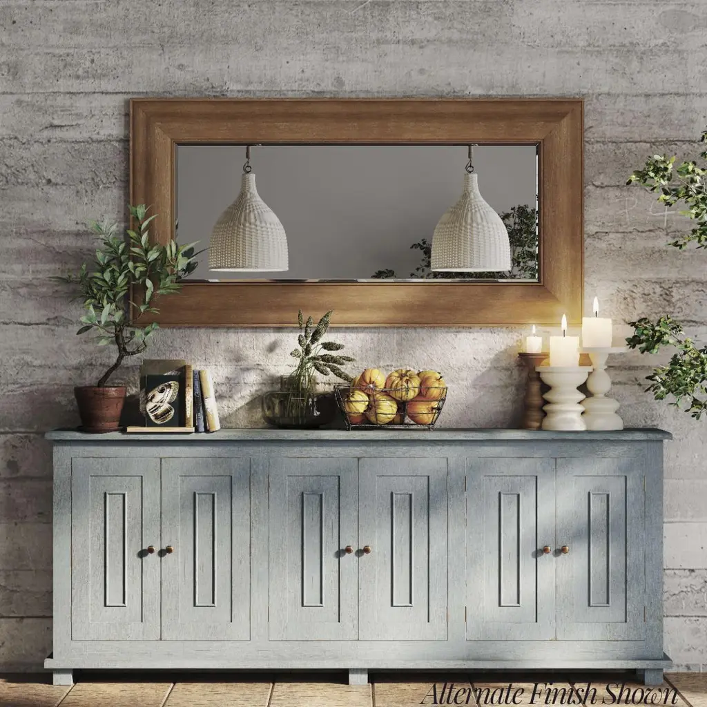 Featuring a lightly distressed ocean blue finish, this elegant piece, measuring 94" x 10" x 38", is perfect for adding a touch of rustic sophistication to any room.Designed with both style and functionality in mind, this sideboard offers ample storage space behind its beautifully paneled doors, making it ideal for keeping your essentials organized. The unique narrow design ensures it fits seamlessly into tight spaces, while the exquisite ocean blue finish adds a serene and stylish touch to your decor.Dimensions: 94" W x 10" D x 38" H
