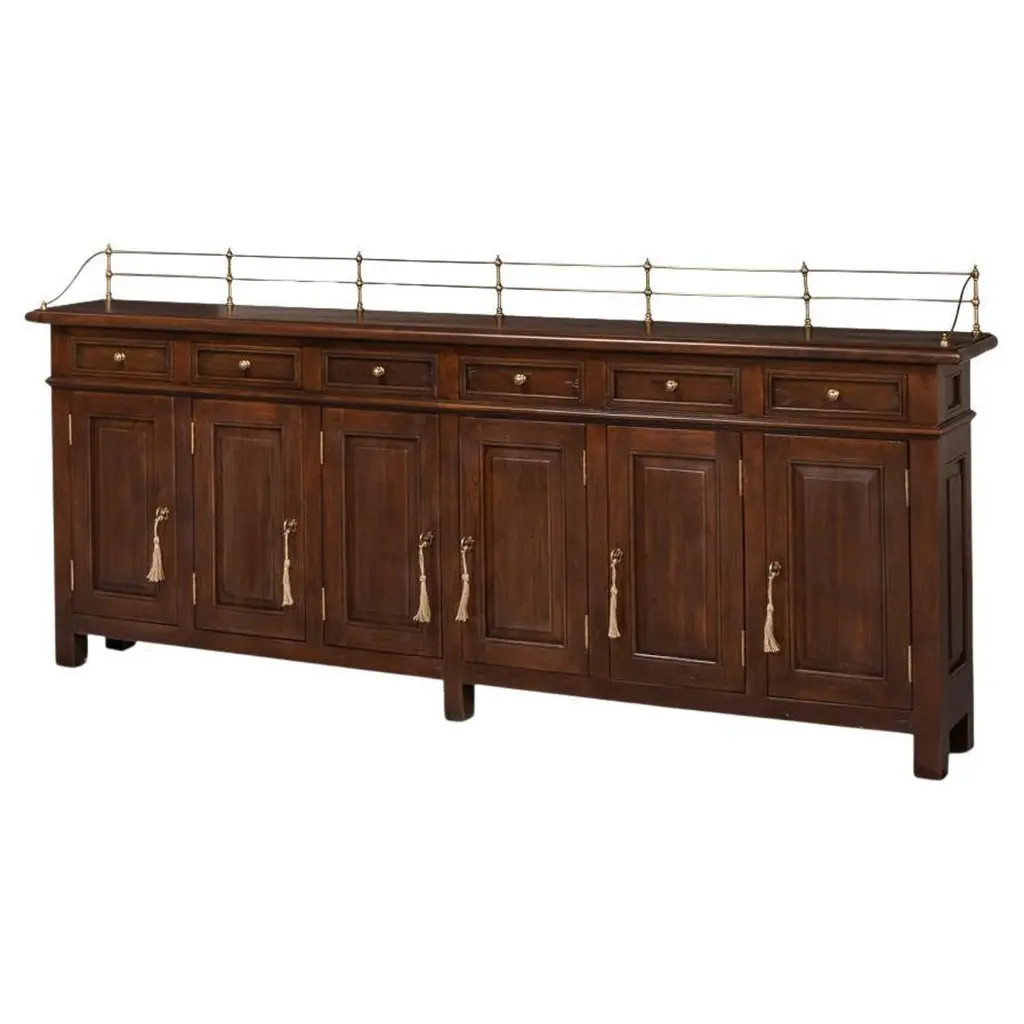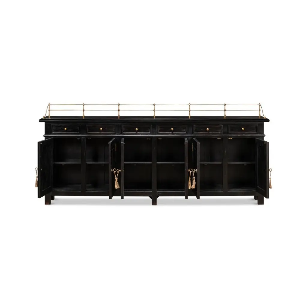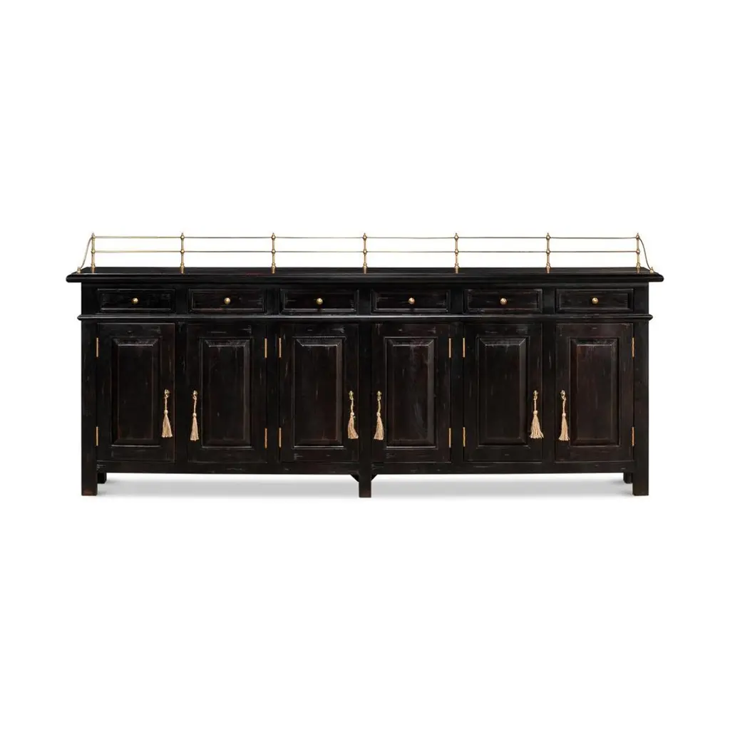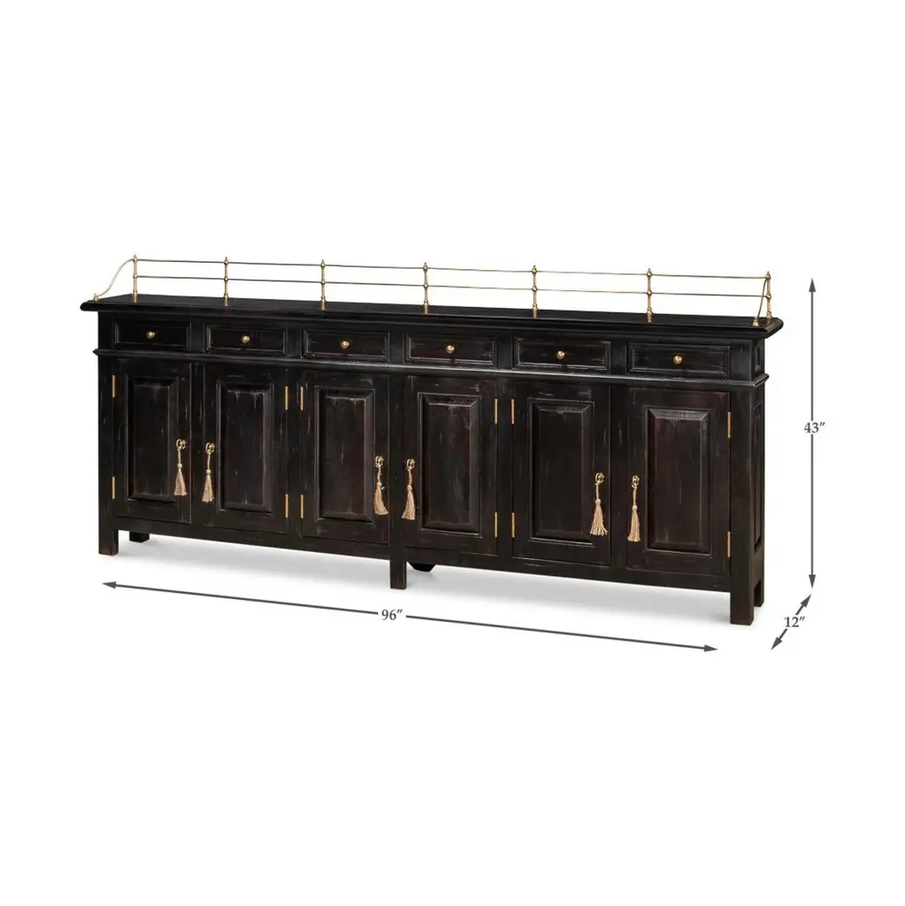 Crafted from solid wood in a hand-rubbed rustic and antiqued ebonized finish, this piece resonates with durability and a timeless aesthetic. Its generous dimensions, measuring 96 inches in width, 12 inches in depth, and standing 43 inches tall, make it a statement piece for spacious dining rooms.With a molded top edge, three-quarter brass gallery, six drawers, and six adjustable shelves hidden behind classic panel doors, there is ample storage and the organization becomes as effortless as it is stylish. Dimensions: 96" W x 12" D x 43" H