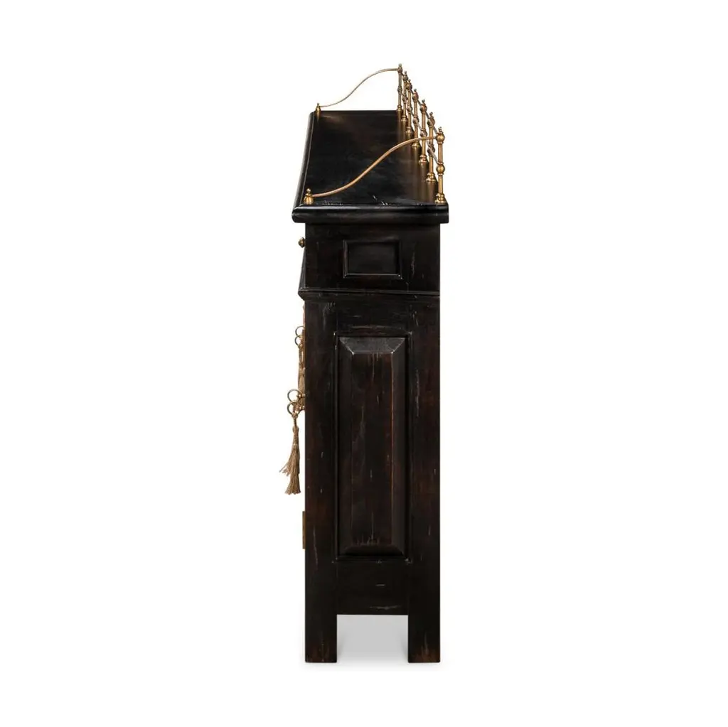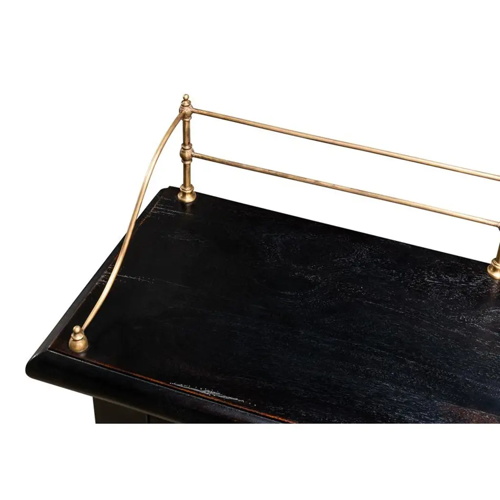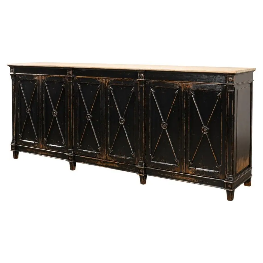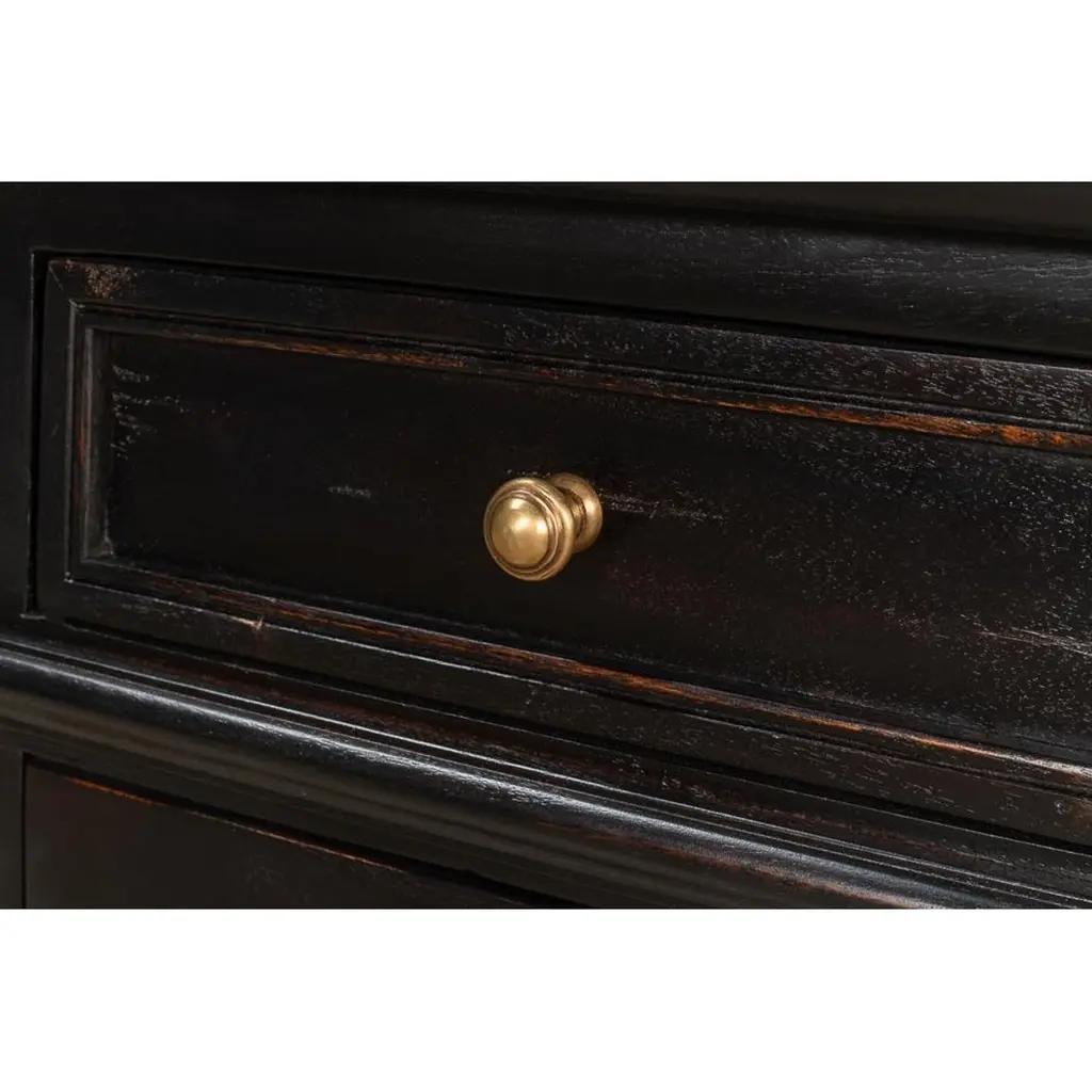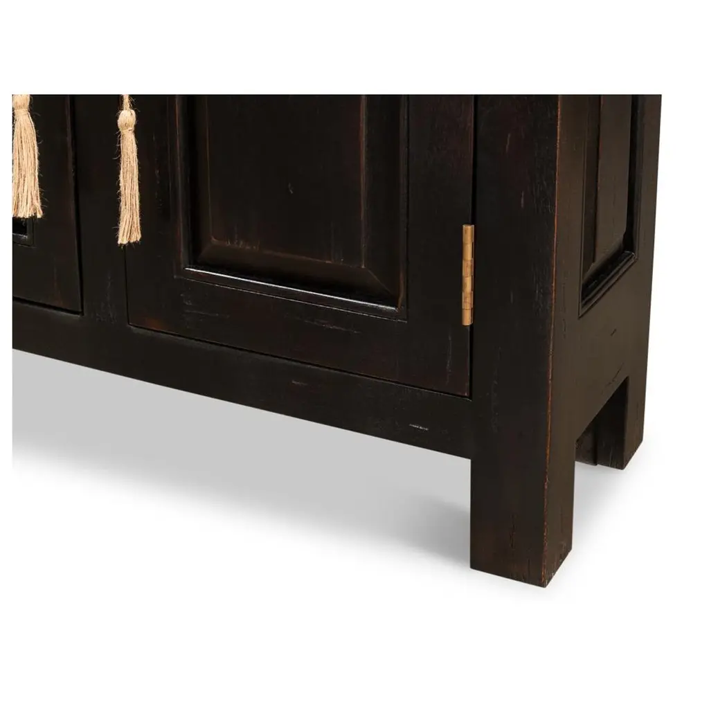 Crafted from solid wood in a hand-rubbed rustic and antiqued ebonized finish, this piece resonates with durability and a timeless aesthetic. Its generous dimensions, measuring 96 inches in width, 12 inches in depth, and standing 43 inches tall, make it a statement piece for spacious dining rooms.With a molded top edge, three-quarter brass gallery, six drawers, and six adjustable shelves hidden behind classic panel doors, there is ample storage and the organization becomes as effortless as it is stylish. Dimensions: 96" W x 12" D x 43" H