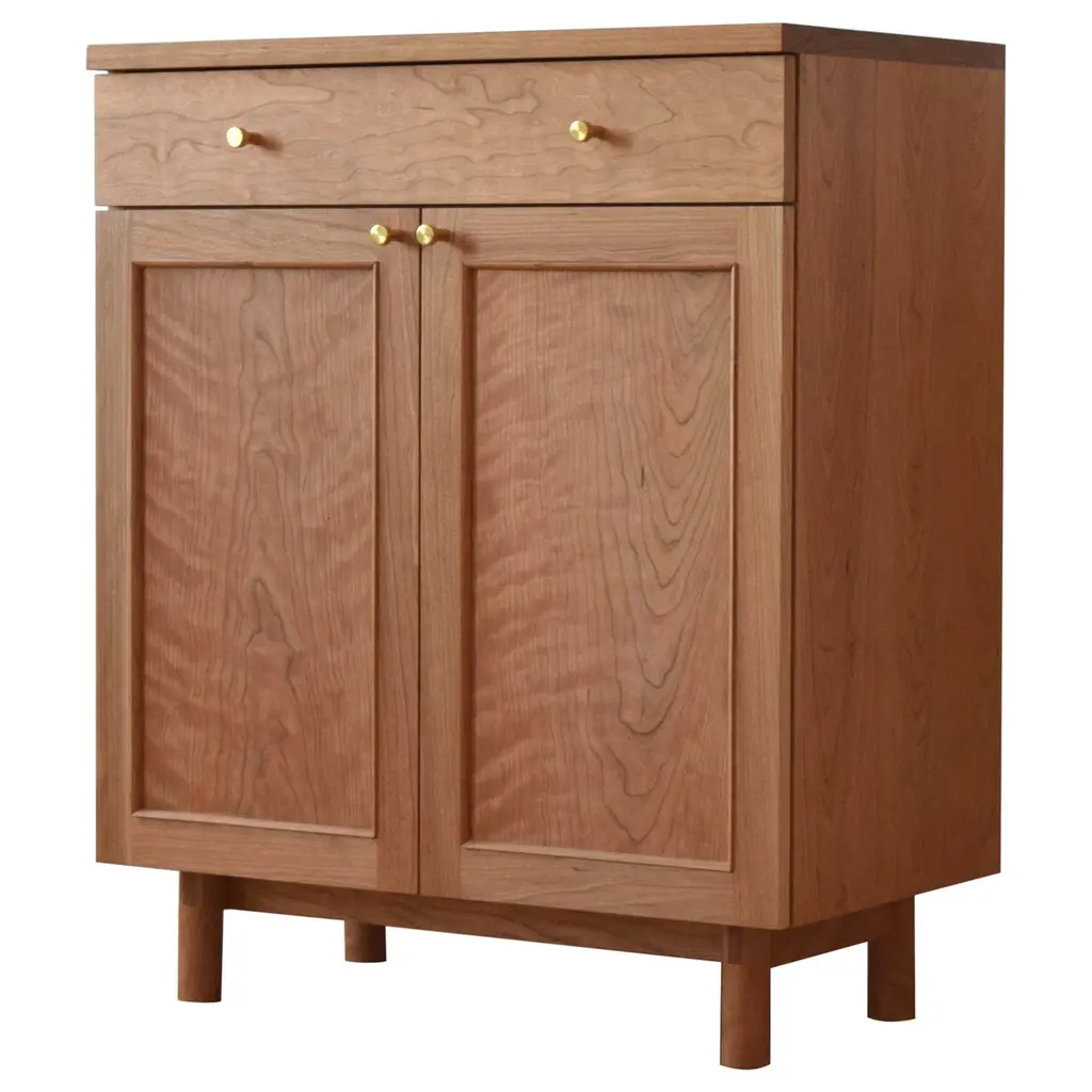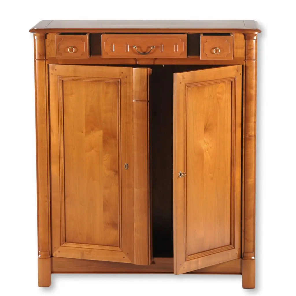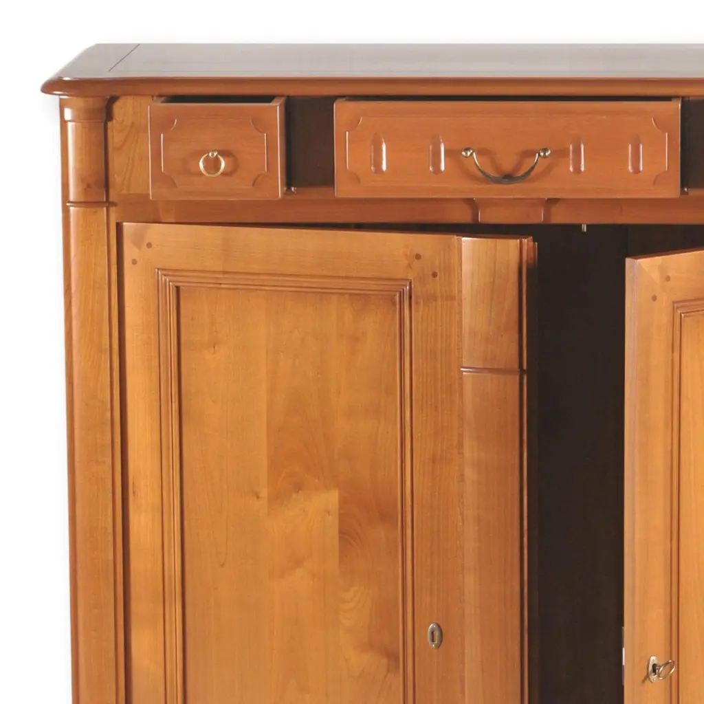 This high buffet's design is in a French Countryside style, also called "Campagne chic". This blond wild cherry Sideboard features 3 drawers, all with dove mounted fronts, one large in the middle and two small on the sides. The 2 wild cherry shelves inside are on wood tracks and removable. The sourcing of the solid wood comes from sustainably managed French forests.GONTIER, a brand of MON PETIT MEUBLE FRANCAIS group, provides you exclusively with 100% made in France classical and contemporary pieces of furniture.The manufacture of each furniture is made accordingly to traditional French techniques of woodworking by small craft workshops in the western countryside of France (Loire Valley and Bretagne). We offer a 5 year warranty on each piece.