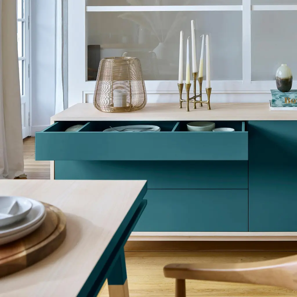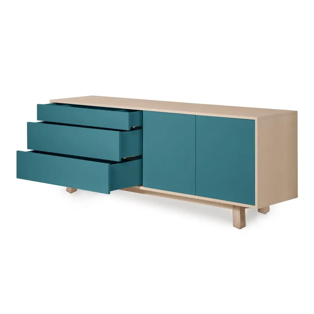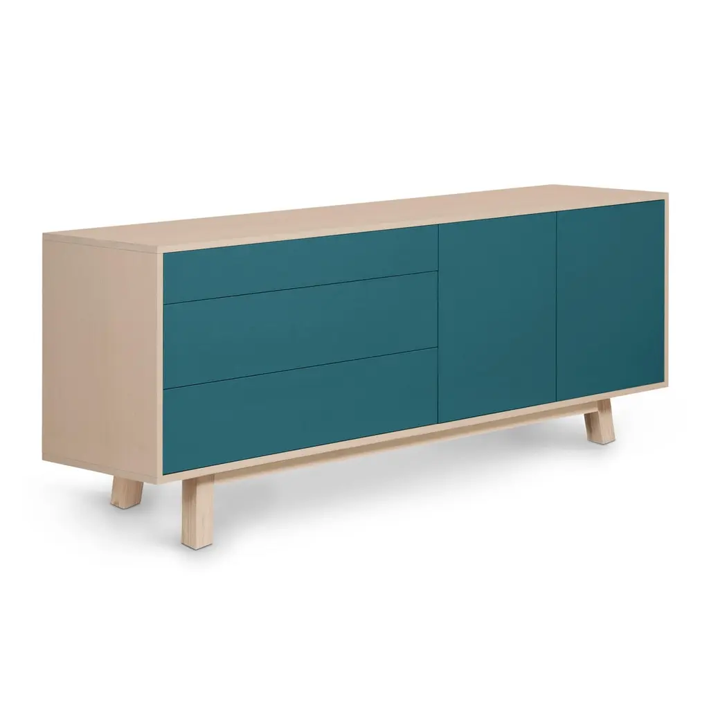 This 2-door, 3-drawer sideboard is presented here in ash wood and also available in French oak.No assembly is required from your side, the furniture is fully mounted in our workshop.The 3 drawers take up half the total length. The drawers fronts are solidly assembled with dovetail joints. The top drawer is lower than the other 2 and features 2 removable interior wooden dividers. The 2 lower drawers are normal drawers without dividers. Behind the 2 hinged doors, 1 height-adjustable shelf on cleats is supplied with the sideboard. To prevent damage during transport, it is positioned at the bottom of the buffet. All you have to do is place it on the cleats (supplied) at the desired height upon reception. Doors and drawers open with a « push & release » pressure on front.ÉGÉE COLLECTIONThis large & low 2-door 3 -drawer sideboard is part of the ÉGÉE collection, designed by the Parisian designer Eric GIZARD who here adopts the refined codes of Scandinavian design. combining natural materials, elegance and sobriety of lines by adding very beautiful muted and "trendy" colors.Inside the ÉGÉE collection, the KUBE concept is designed to offer an optimized and aesthetically pleasing storage concept.MON PETIT MEUBLE FRANÇAISoffers you 100% French products. The solid wood comes exclusively from sustainably managed French forests.The manufacture and finishes are of very high quality, carried out in French workshops in Mayenne, France.