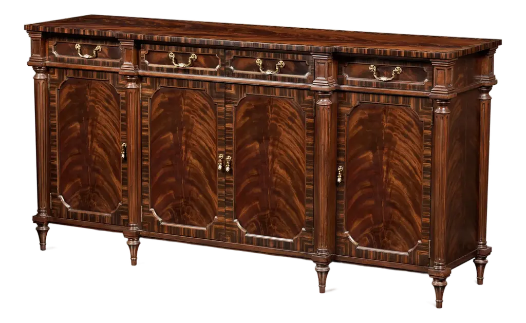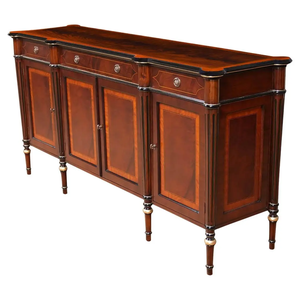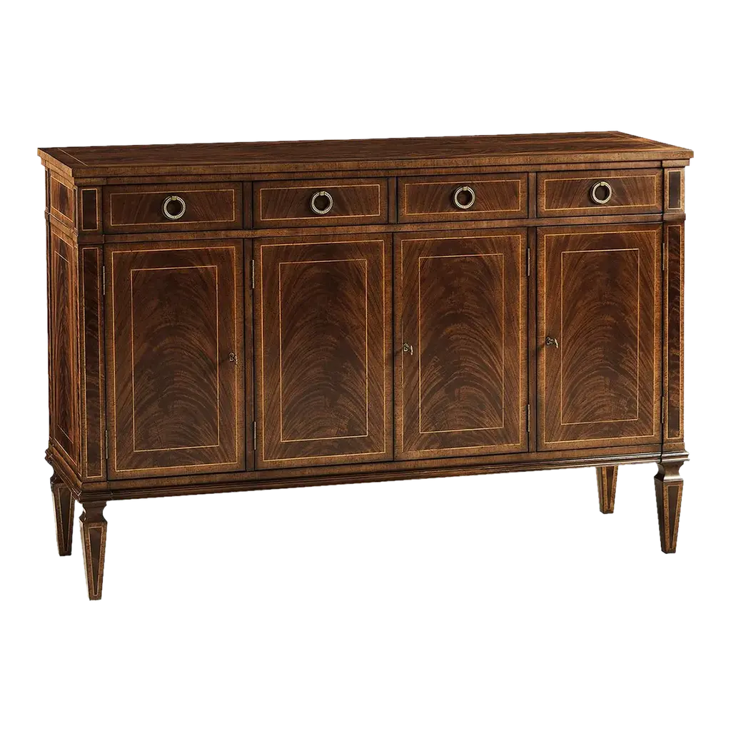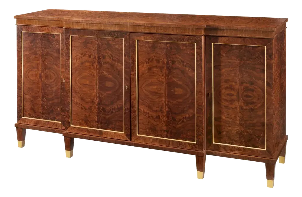 The classic form features book-matched panels framed by gold trim, while square tapered legs with brass sabots ground the piece in Empire period authenticity. Each door front showcases the careful selection and placement of figured walnut, creating a harmonious balance of pattern and form.This stately cabinet combines generous proportions with practical functionality through four cabinet sections, each fitted with adjustable interior shelves for customizable storage. The elevated stance on square tapered legs creates an elegant presence, making it an ideal centerpiece for formal dining rooms or grand entryways where both storage and sophistication are essential.Dimensions: 76" W x 20" D x 39.5" H