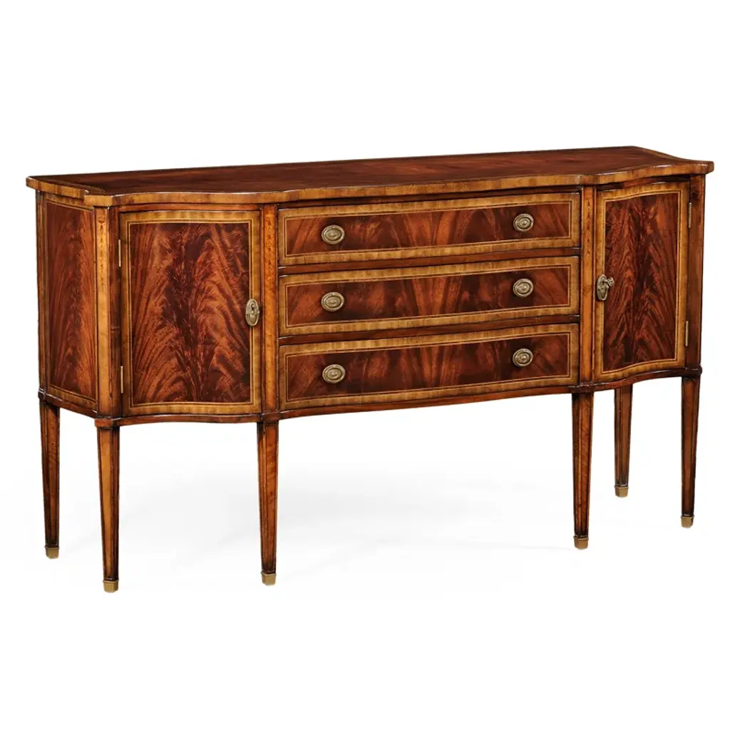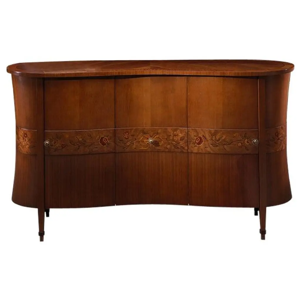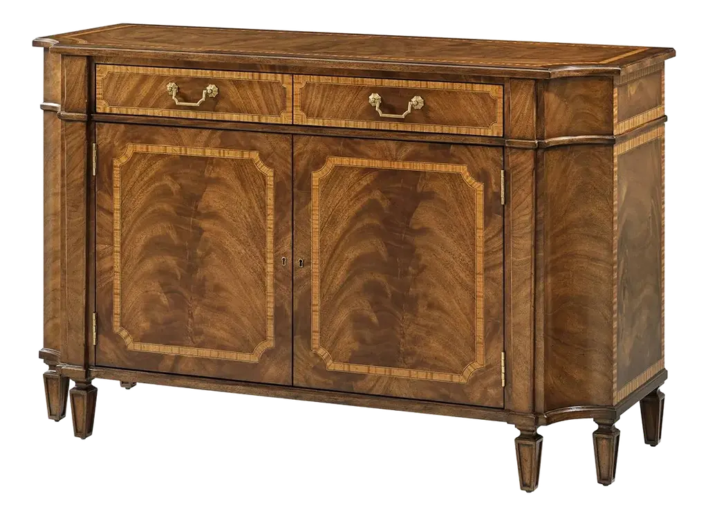 The classic form features book-matched panels framed by gold trim, while square tapered legs with brass sabots ground the piece in Empire period authenticity. Each door front showcases the careful selection and placement of figured walnut, creating a harmonious balance of pattern and form.This stately cabinet combines generous proportions with practical functionality through four cabinet sections, each fitted with adjustable interior shelves for customizable storage. The elevated stance on square tapered legs creates an elegant presence, making it an ideal centerpiece for formal dining rooms or grand entryways where both storage and sophistication are essential.Dimensions: 76" W x 20" D x 39.5" H