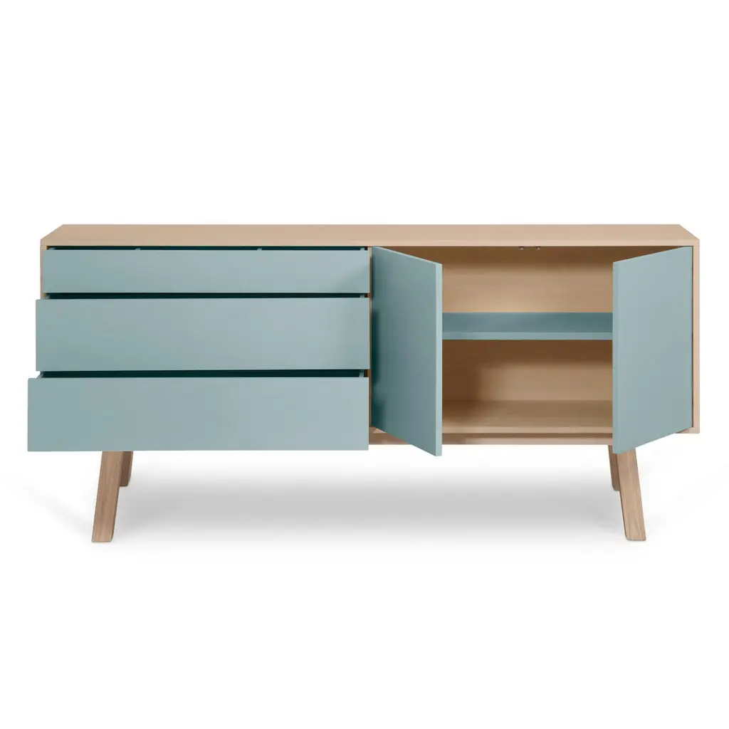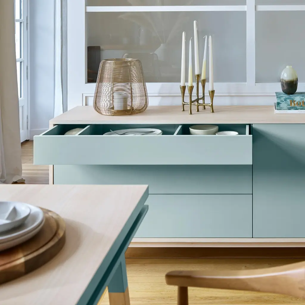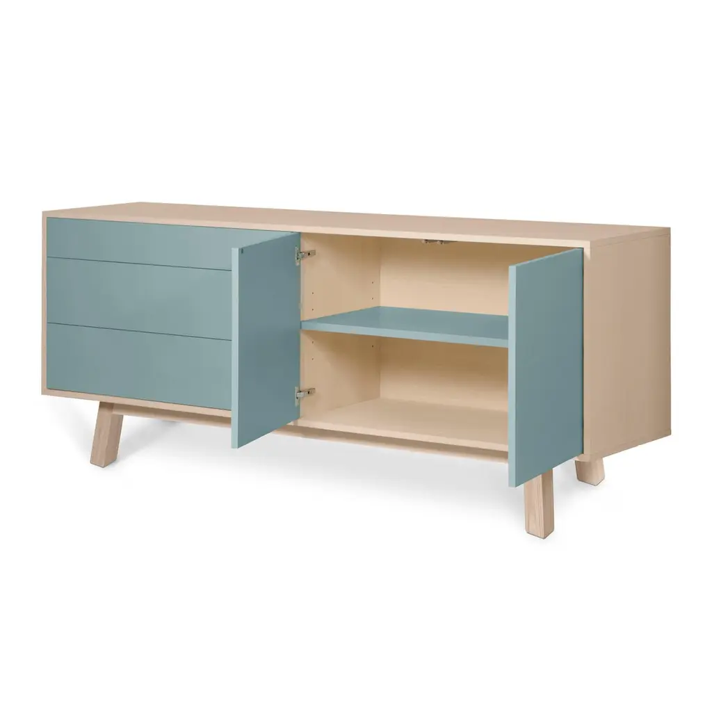 This 2-door, 3-drawer sideboard is presented here in ash wood and also available in French oak.No assembly is required from your side, the furniture is fully mounted in our workshop.The 3 drawers take up half the total length. The drawers fronts are solidly assembled with dovetail joints. The top drawer is lower than the other 2 and features 2 removable interior wooden dividers. The 2 lower drawers are normal drawers without dividers. Behind the 2 hinged doors, 1 height-adjustable shelf on cleats is supplied with the sideboard. To prevent damage during transport, it is positioned at the bottom of the buffet. All you have to do is place it on the cleats (supplied) at the desired height upon reception. Doors and drawers open with a « push & release » pressure on front.ÉGÉE COLLECTIONThis large & low 2-door 3 -drawer sideboard is part of the ÉGÉE collection, designed by the Parisian designer Eric GIZARD who here adopts the refined codes of Scandinavian design. combining natural materials, elegance and sobriety of lines by adding very beautiful muted and "trendy" colors.Inside the ÉGÉE collection, the KUBE concept is designed to offer an optimized and aesthetically pleasing storage concept.MON PETIT MEUBLE FRANÇAISoffers you 100% French products. The solid wood comes exclusively from sustainably managed French forests.The manufacture and finishes are of very high quality, carried out in French workshops in Mayenne, France.