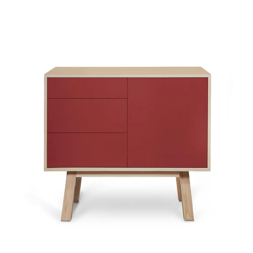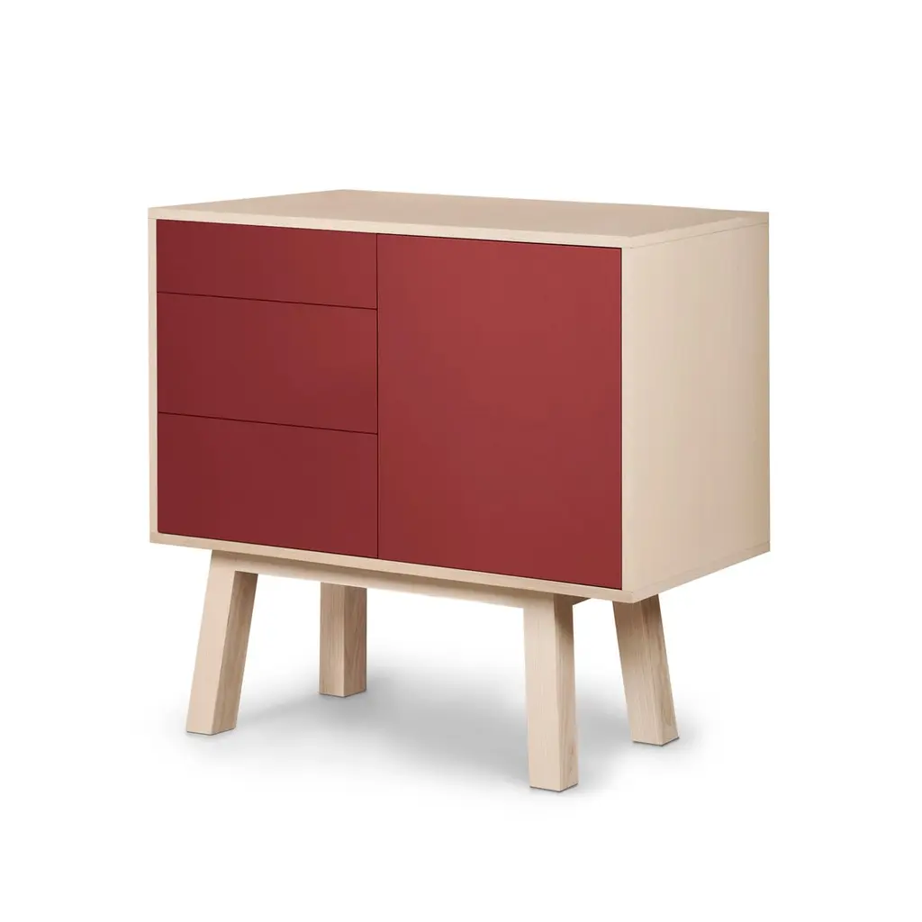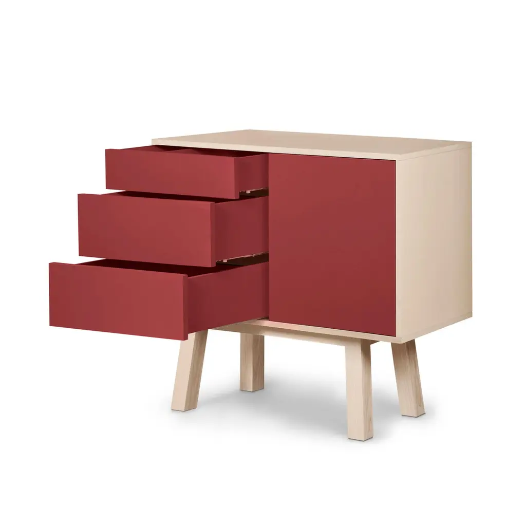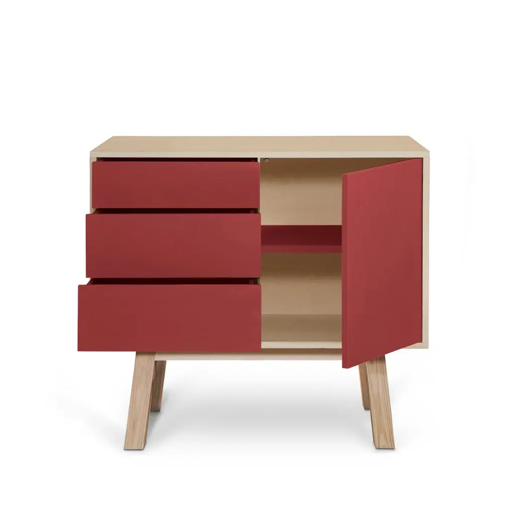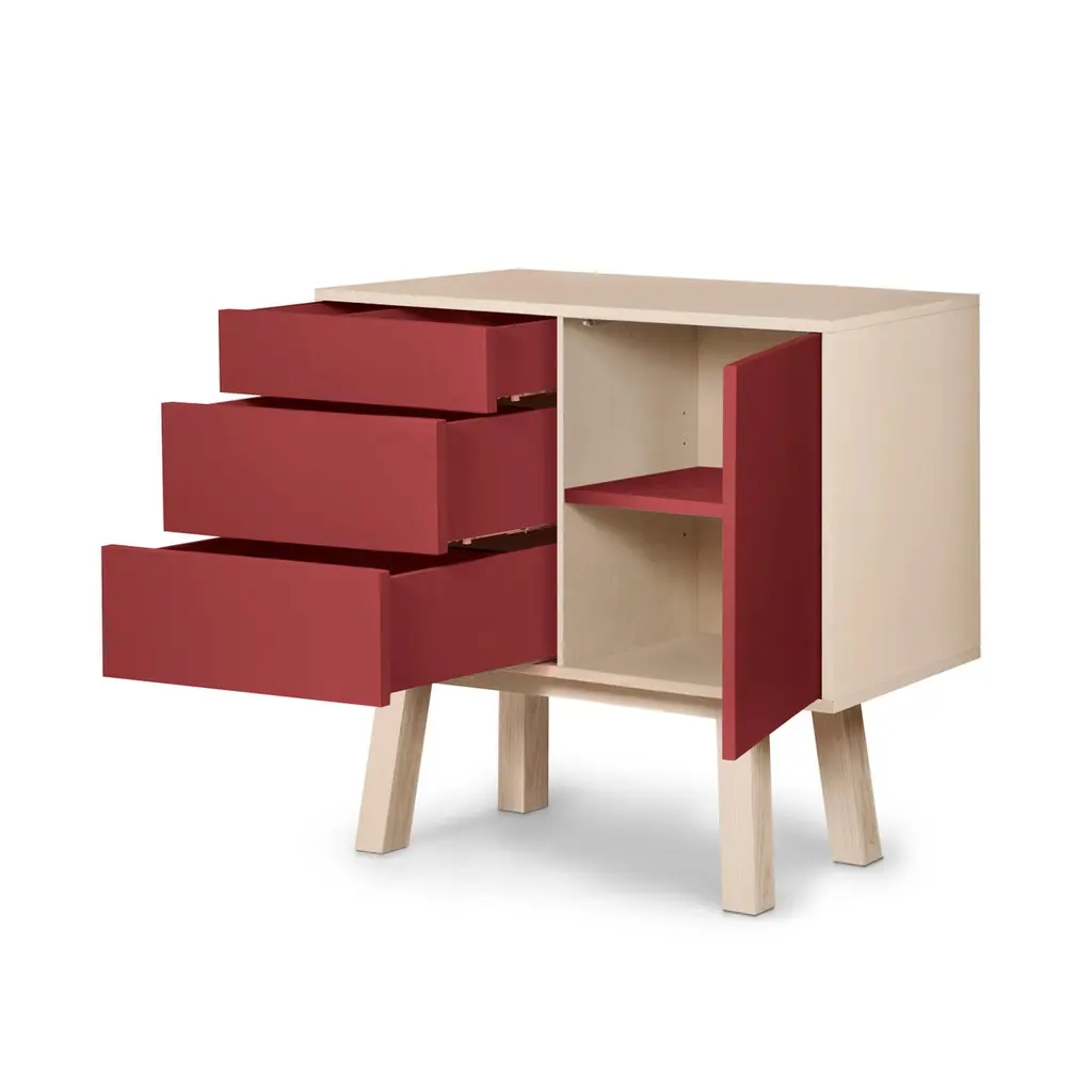 This 1-door and 3-drawer cabinet is designed by Eric Gizard - Paris.It is 100% made in France with solid ash wood, veneer and lacquered doors in MDF panels. Each door and each drawer opens with a "push-to-release" pressure. An adjustable wooden shelf on cleats is placed behind the 2 doors. The shelf's colour is identical to the doors' colour.The first drawer is lower and can store cutlery, napkins, placemats, etc.In this small drawer, 2 movable wooden dividers allow you to create 3 storage spaces as you wish (see the last detail picture). The other 2 drawers are regular drawers without divider.collection ÉGÉEThis sideboard is part of the ÉGÉE collection designed by Eric Gizard in Paris. Eric combines the sleek and refined codes of Scandinavian design with natural materials and muted and "trendy" colorful lacquers.MON PETIT MEUBLE FRANCAISprovides exclusively 100% Made in France Furniture. The manufacture and finishes are of very high-end quality, carried out in French craft workshops, in the west countryside of France: Loire and Bretagne. Solid ash comes from sustainably managed French forests.
