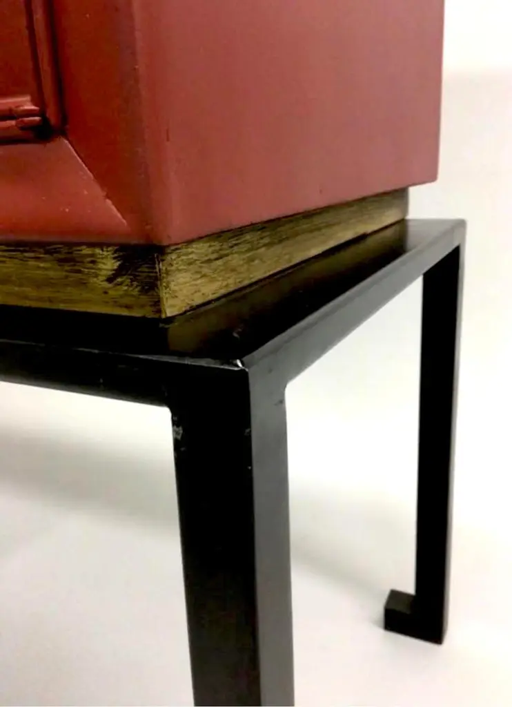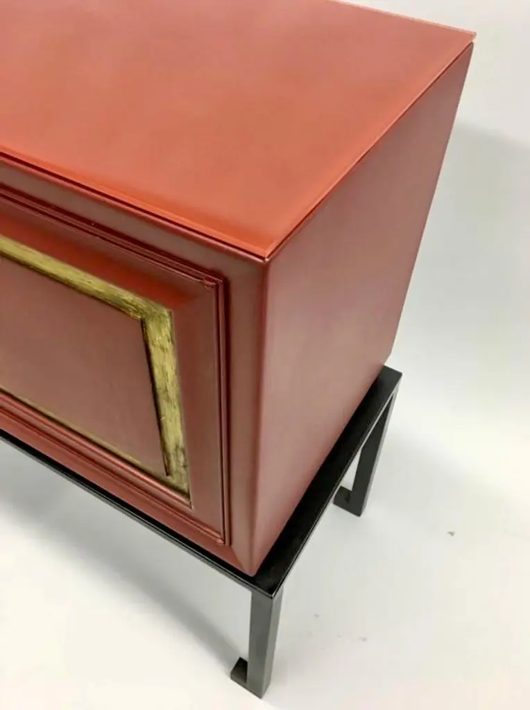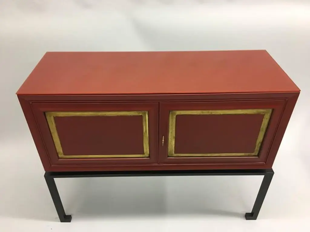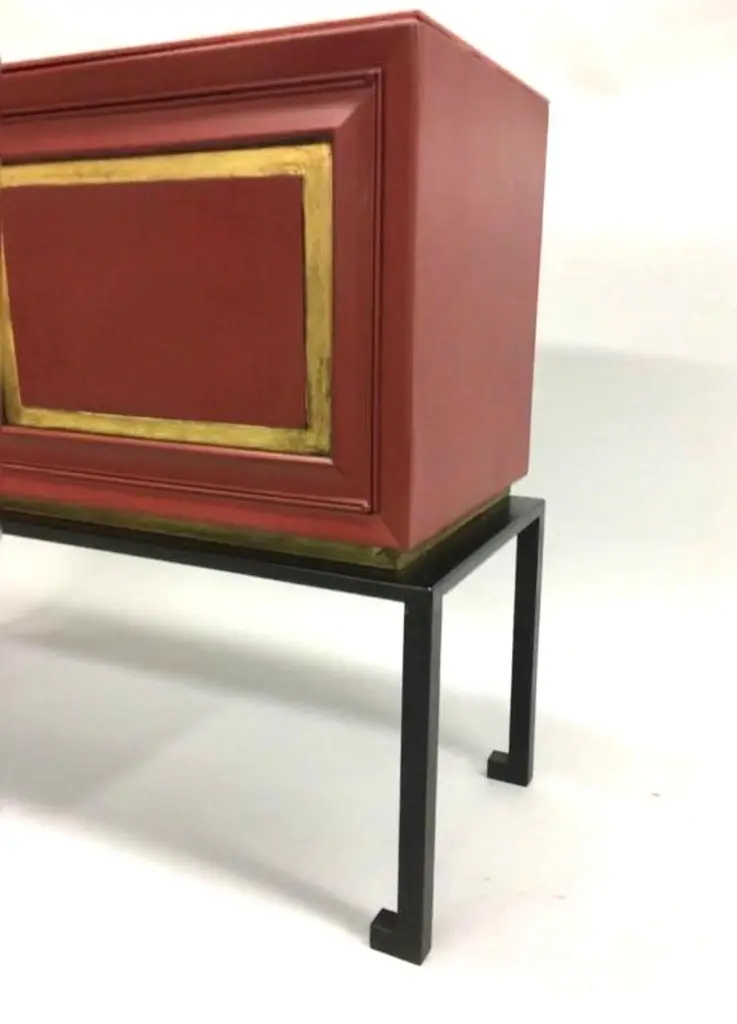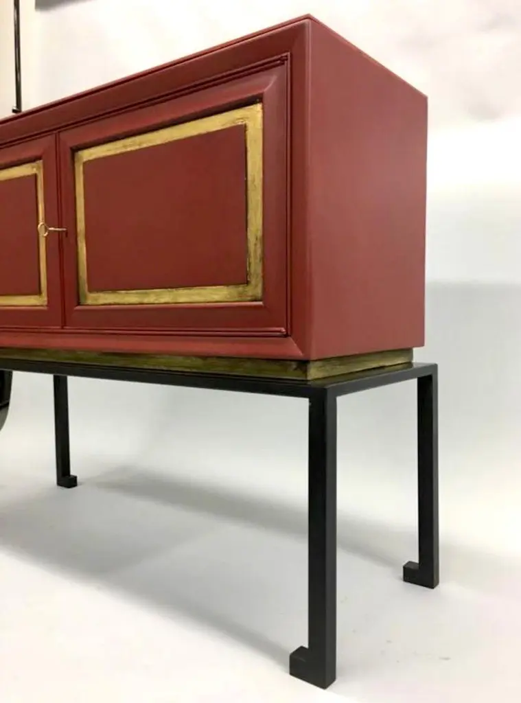 Two Rare and Exceptional French Mid-Century Modern Neoclassical Sideboards in Chinese red lacquer with Chinese red glass tops by Jacques Adnet, France, 1940-1950. (The 2 pieces are priced and sold as individual pieces. so the price shown is for 1 cabinet.) The cabinets have pure lines and an exquisite form. They possess a vibrant red color that fully captivates ones attention. This is highlighted and balanced by gold leaf decorated doors in neoclassical rectangular pattern. A gold leaf apron and turned in iron feet complete compel further attention and complete the composition. In addition, the cabinets are cantilevered over the base to provide subtle, dramatic effect. The pieces function as bars, sideboards, sofa tables, consoles or as a secretary. Furthermore, the Chinese Red glass tops are attributed to Fontana Arte, Italy's premiere glass workshop and the ironwork base and body is attributed to the French ironwork master, Gilbert Poillerat. The cabinets are of historic and aesthetic value and are among the finest pieces produced in France during the 1940 period. Please note: 2 pieces are available; however they are Priced and Sold Separately as Individual Pieces. Additional References: Emile-Jacques Ruhlmann, Jean Michel Frank, Andre Arbus, Gio Ponti, Gilbert Poillerat, Fontana Arte, Max Ingrand.