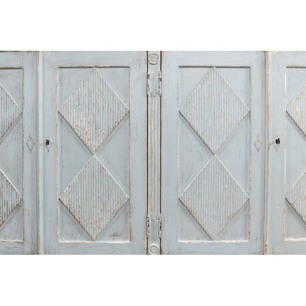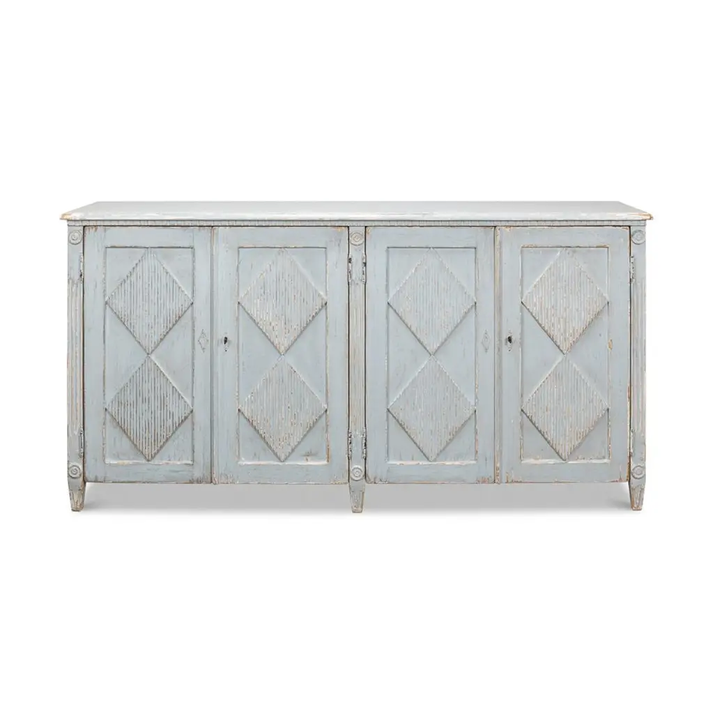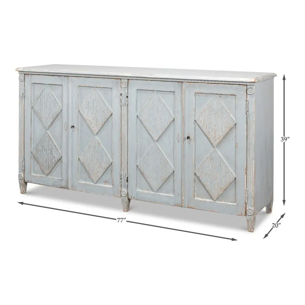 Crafted from reclaimed pine, this exquisite piece showcases a hand-applied blue-grey finish with a heavily distressed patina, evoking the elegance of antique European craftsmanship. The double-stack diamond relief panels on each door add a striking visual texture, while fluted stiles and square tapered legs enhance its refined silhouette.Designed for both beauty and functionality, this sideboard features adjustable shelves and a painted interior, offering ample storage for your dining or living space. Medallion details at the top and bottom of the fluted stiles further enrich its vintage appeal. Whether used as a statement buffet, a sophisticated storage piece, or an accent in a grand entryway, this sideboard effortlessly blends rustic charm with classic French aesthetics.Dimensions: 77" W x 20" D x 39" H