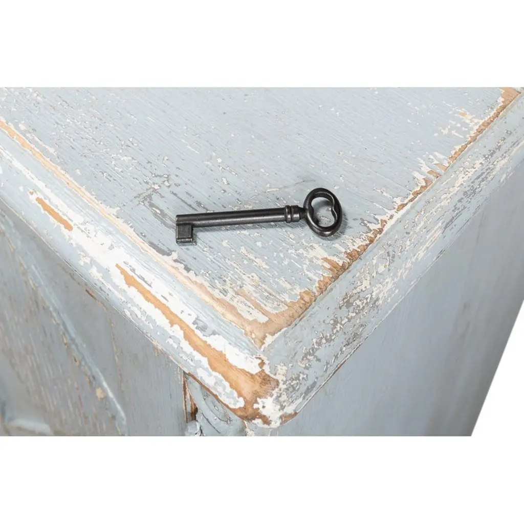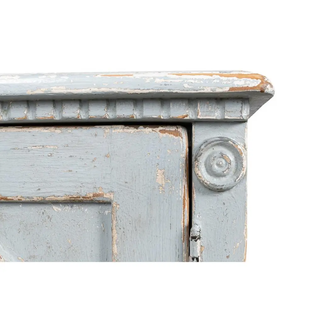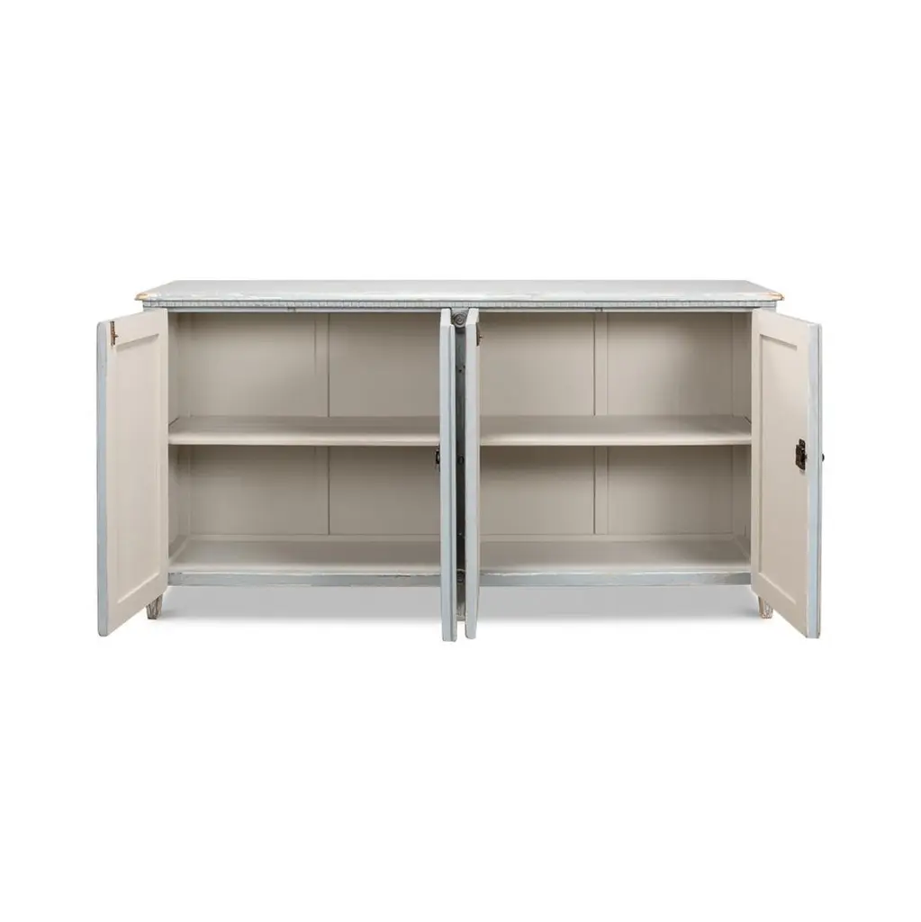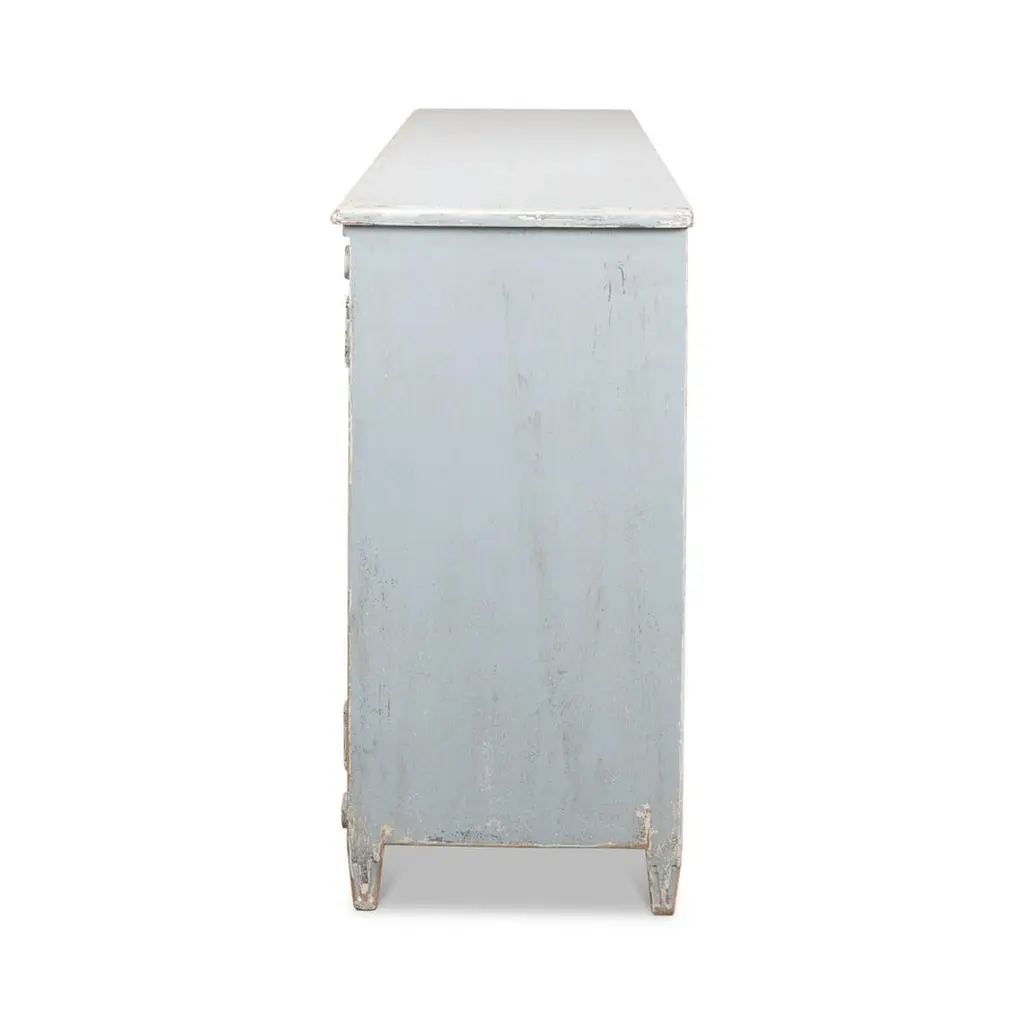 Crafted from reclaimed pine, this exquisite piece showcases a hand-applied blue-grey finish with a heavily distressed patina, evoking the elegance of antique European craftsmanship. The double-stack diamond relief panels on each door add a striking visual texture, while fluted stiles and square tapered legs enhance its refined silhouette.Designed for both beauty and functionality, this sideboard features adjustable shelves and a painted interior, offering ample storage for your dining or living space. Medallion details at the top and bottom of the fluted stiles further enrich its vintage appeal. Whether used as a statement buffet, a sophisticated storage piece, or an accent in a grand entryway, this sideboard effortlessly blends rustic charm with classic French aesthetics.Dimensions: 77" W x 20" D x 39" H