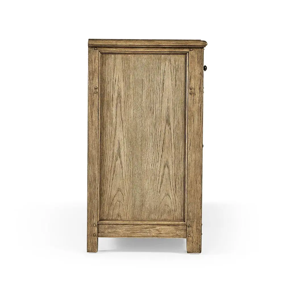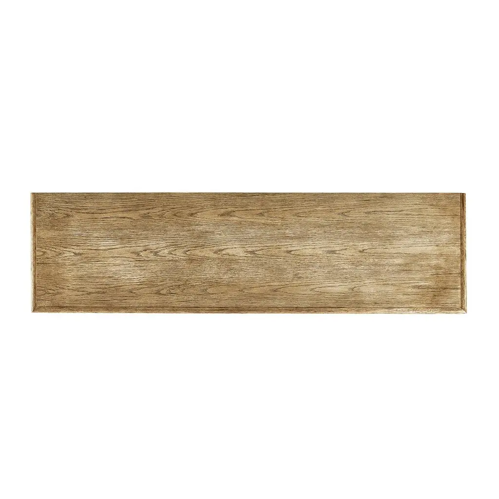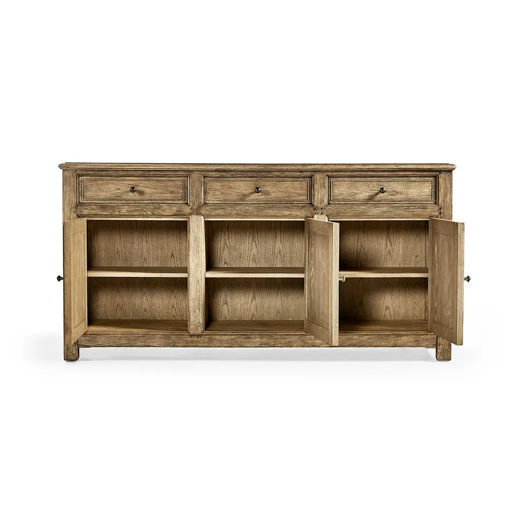 A masterpiece of traditional craftsmanship that blends luxurious design with structural perfection. Crafted from solid oak with chestnut veneers, this sideboard is finished in an alluring Stripped Brown Chestnut that radiates warmth and authenticity.The doors feature decorative panels with a classic diamond motif, complemented by custom cast hardware that adds a touch of elegance.Finished with wire brush techniques that enhance the natural chestnut grain, giving it a unique texture and rich visual depth. Equipped with three pull-out drawers and three doors, each revealing interior shelving, perfect for organizing everything from dinnerware to media devices.Dimensions: 72" W x 20" D x 36" H