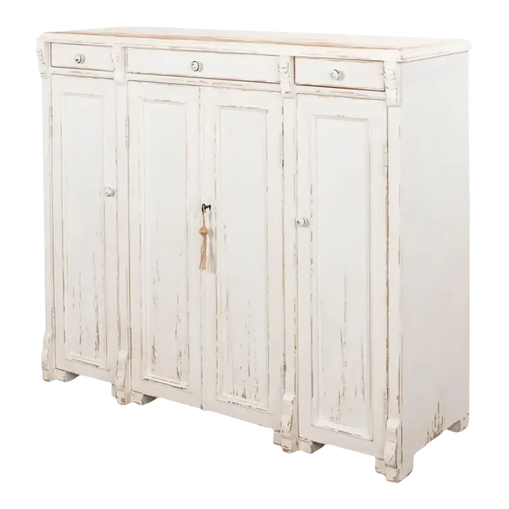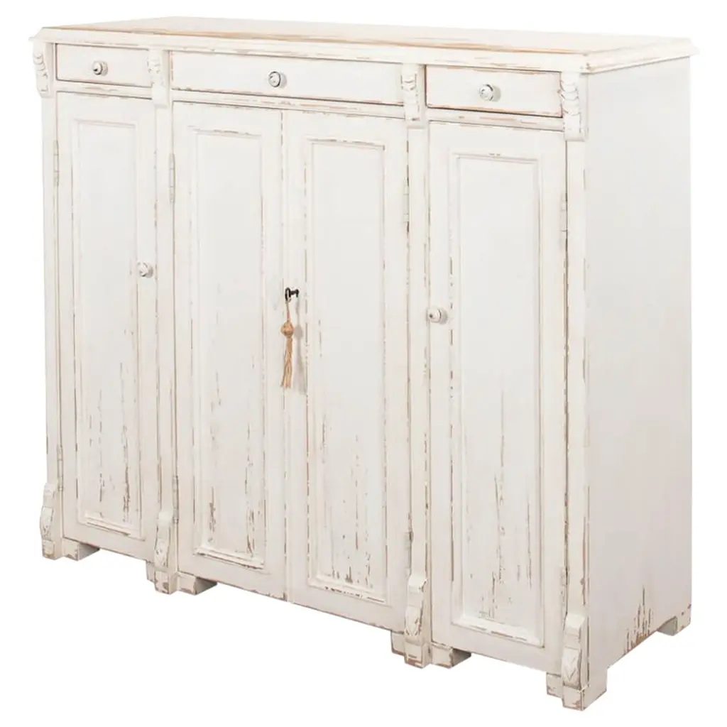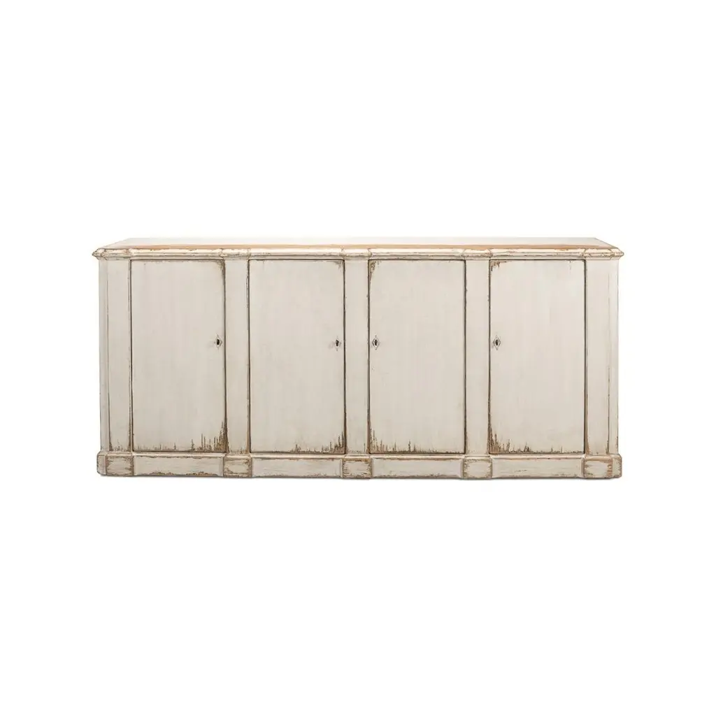 This piece captures the romantic essence of country style with its distressed white finish and vintage charm. The sideboard's generous length, accented by four doors that open to a fitted interior with removable shelves, offers substantial storage space, perfect for keeping dining essentials or living room items neatly organized. The worn edges and rustic patina of the highly distressed finish invite a sense of nostalgia, making this sideboard not just a piece of furniture, but a storyteller in your home.Dimensions: 83" W x 19" D x 36" H