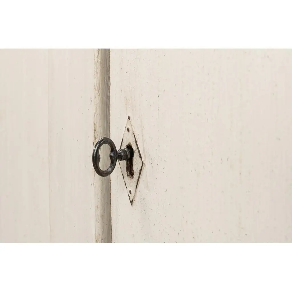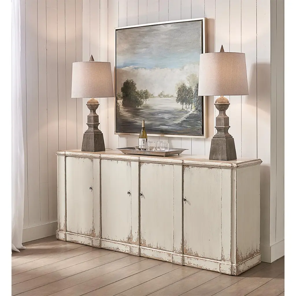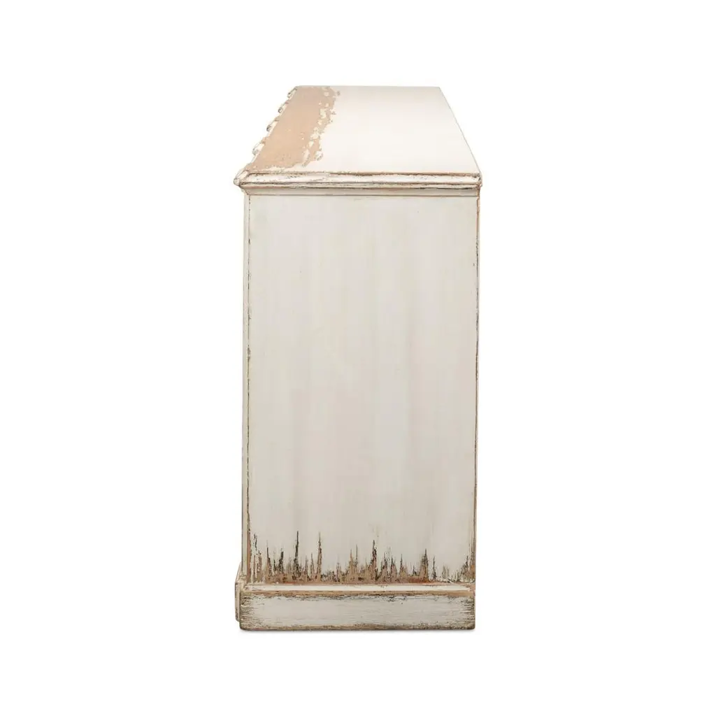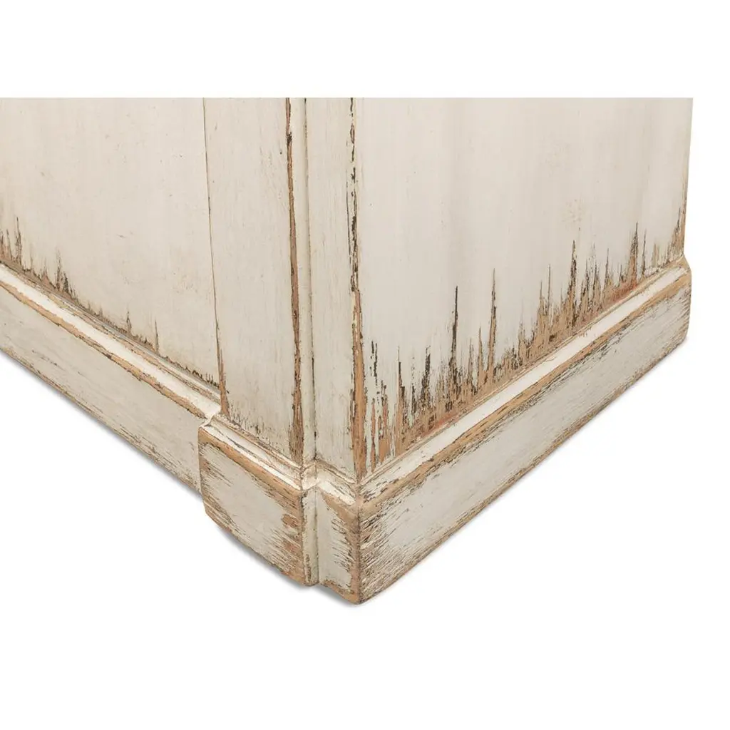 This piece captures the romantic essence of country style with its distressed white finish and vintage charm. The sideboard's generous length, accented by four doors that open to a fitted interior with removable shelves, offers substantial storage space, perfect for keeping dining essentials or living room items neatly organized. The worn edges and rustic patina of the highly distressed finish invite a sense of nostalgia, making this sideboard not just a piece of furniture, but a storyteller in your home.Dimensions: 83" W x 19" D x 36" H