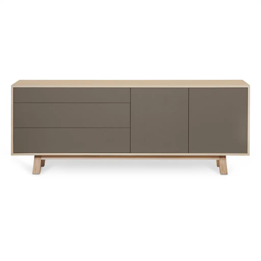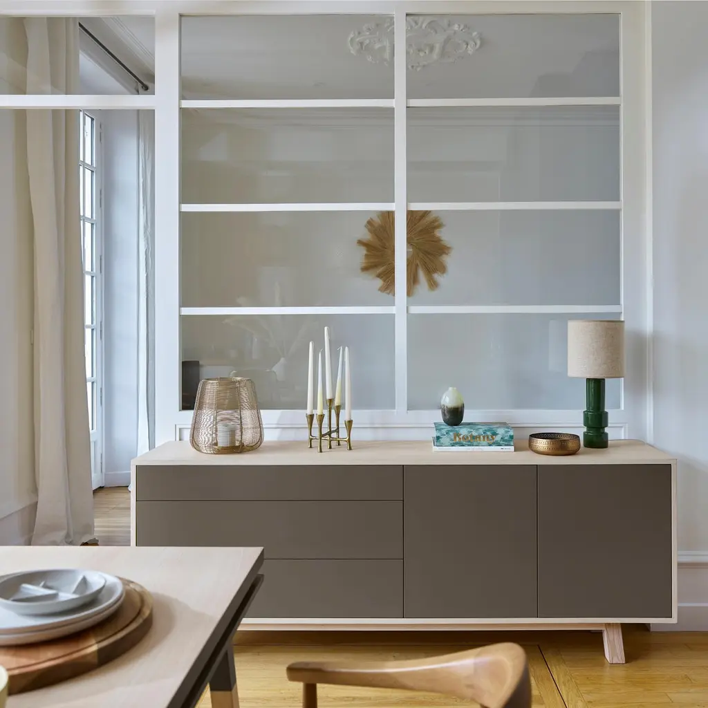 This 2-door, 3-drawer sideboard is presented here in ash wood and also available in French oak.No assembly is required from your side, the furniture is fully mounted in our workshop.The 3 drawers take up half the total length. The drawers fronts are solidly assembled with dovetail joints. The top drawer is lower than the other 2 and features 2 removable interior wooden dividers. The 2 lower drawers are normal drawers without dividers. Behind the 2 hinged doors, 1 height-adjustable shelf on cleats is supplied with the sideboard. To prevent damage during transport, it is positioned at the bottom of the buffet. All you have to do is place it on the cleats (supplied) at the desired height upon reception. Doors and drawers open with a « push & release » pressure on front.ÉGÉE COLLECTIONThis large & low 2-door 3 -drawer sideboard is part of the ÉGÉE collection, designed by the Parisian designer Eric GIZARD who here adopts the refined codes of Scandinavian design. combining natural materials, elegance and sobriety of lines by adding very beautiful muted and "trendy" colors.Inside the ÉGÉE collection, the KUBE concept is designed to offer an optimized and aesthetically pleasing storage concept.MON PETIT MEUBLE FRANÇAISoffers you 100% French products. The solid wood comes exclusively from sustainably managed French forests.The manufacture and finishes are of very high quality, carried out in French workshops in Mayenne, France.