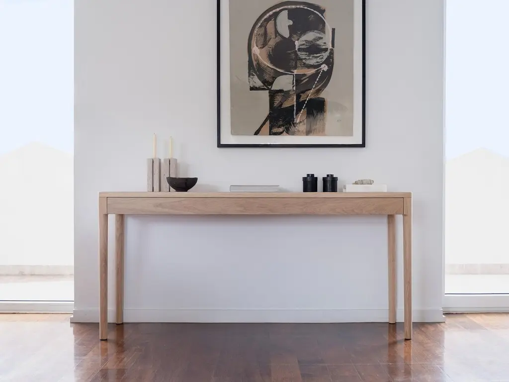 Add refined elegance to any space with this Ash Sideboard. Minimalist modern design, handcrafted in Portugal.Crafted from premium ash wood with precise joinery and a warm satin finish, this versatile console embodies clean simplicity. Its slim profile is perfect for entryways, living rooms, or behind sofas, offering functional surface space without overpowering the room.What Makes It Stand Out:Premium ash wood — showcasing natural grain and depthMinimalist frame — ideal for modern and transitional interiorHand-finished in Portugal — subtle craftsmanship that enduresFunctional surface for décor, lighting, or workspace essentialsMade-to-order with global shipping from LisbonWhether dressing up a hallway, anchoring a seating area, or completing an office, this console table brings together European craftsmanship and modern form — a timeless piece designed to elevate daily life.Measures: 80x40cm.
