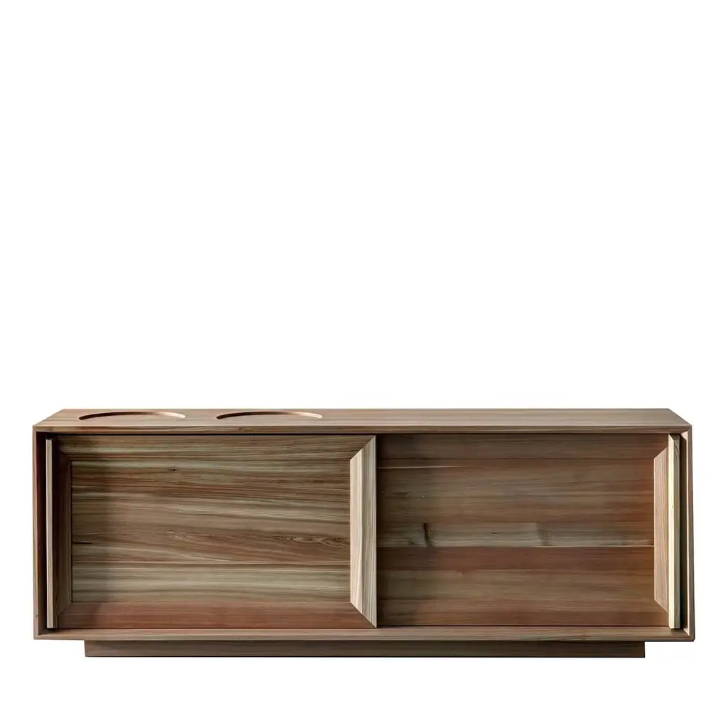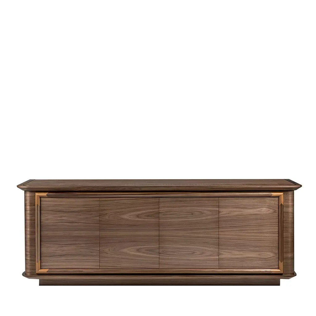 Richer in dark walnut finishing details than its "Fuga Noce Uno" twin also listed in the Artemest catalog, this sideboard by Mascia Meccani is an exercise in linear elements and natural woodgrain. The sturdy, clean-cut durmast frame is equipped with two inner shelves, revealed when the four doors - showcasing a captivating grooved design accented in dark walnut - open.