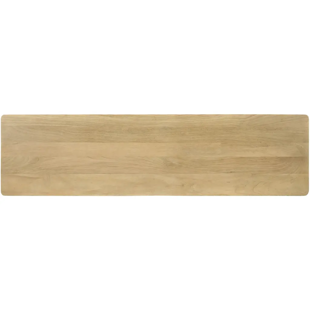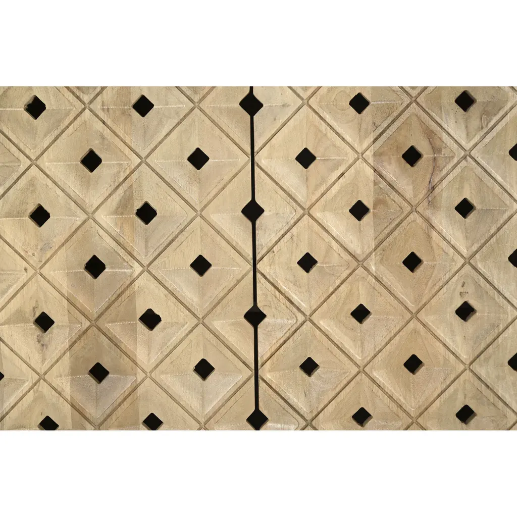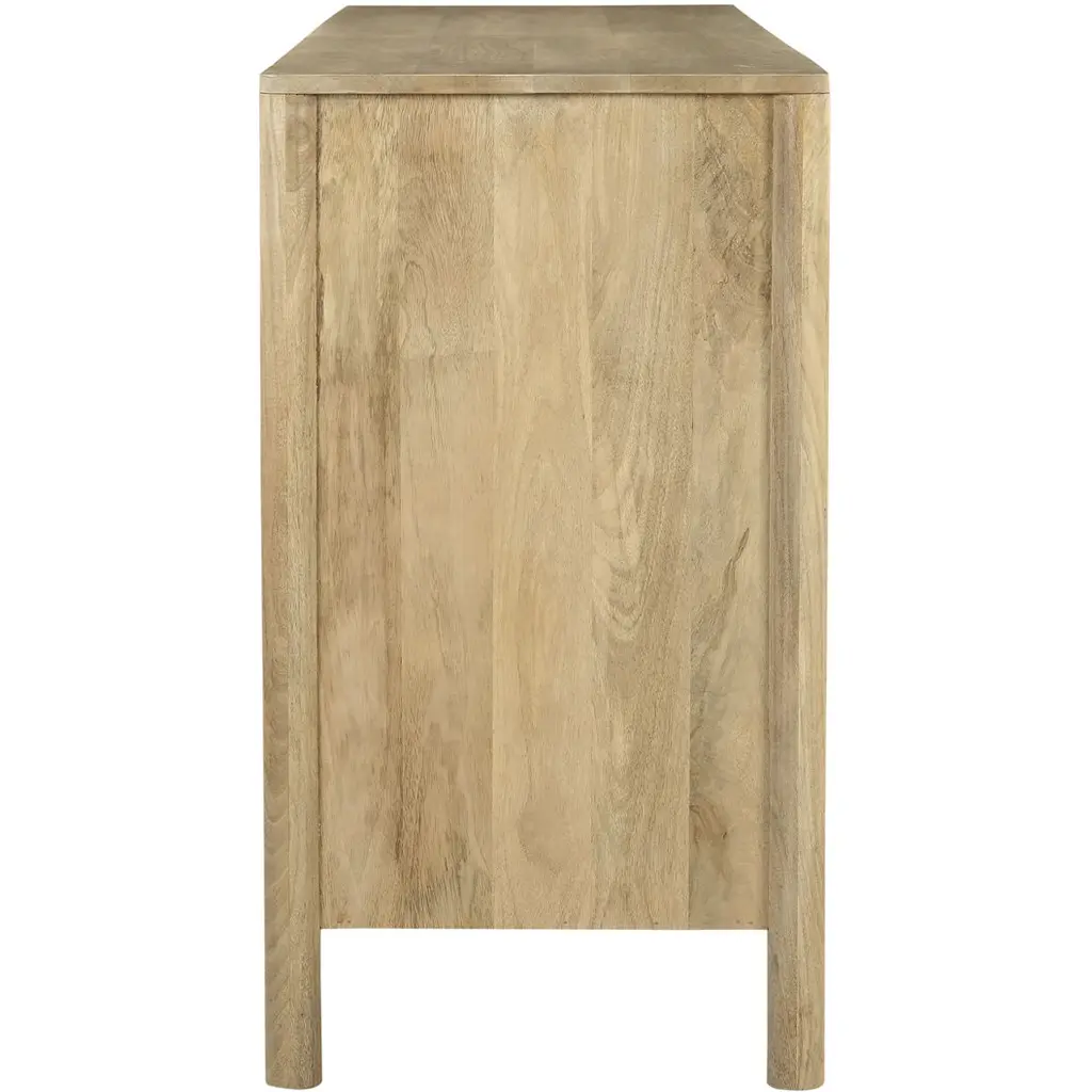 Carved from solid mango wood, the Fulton 4-door sideboards geometric, off-centered front creates a striking focal point. Push-to-open drawers offer effortless functionality. The natural finish showcases the wood's rich grain, celebrating its inherent beauty.