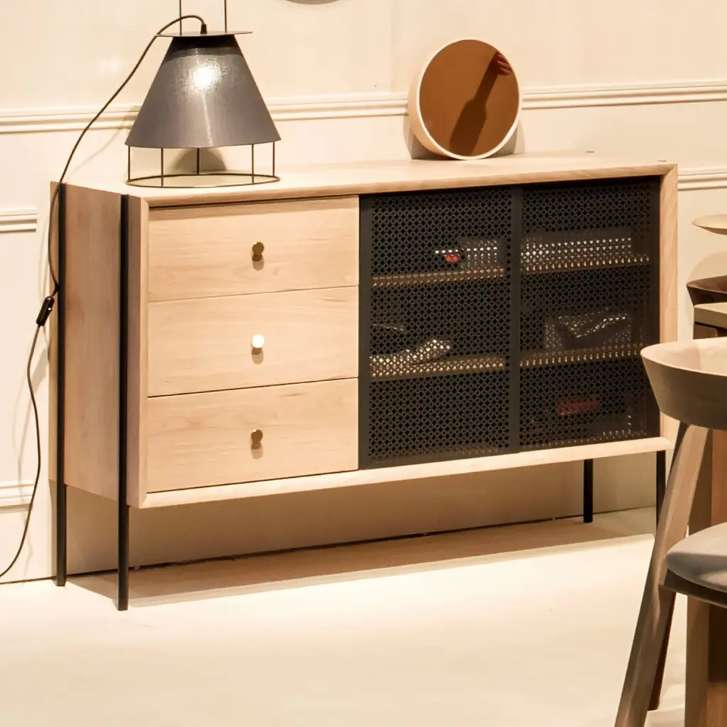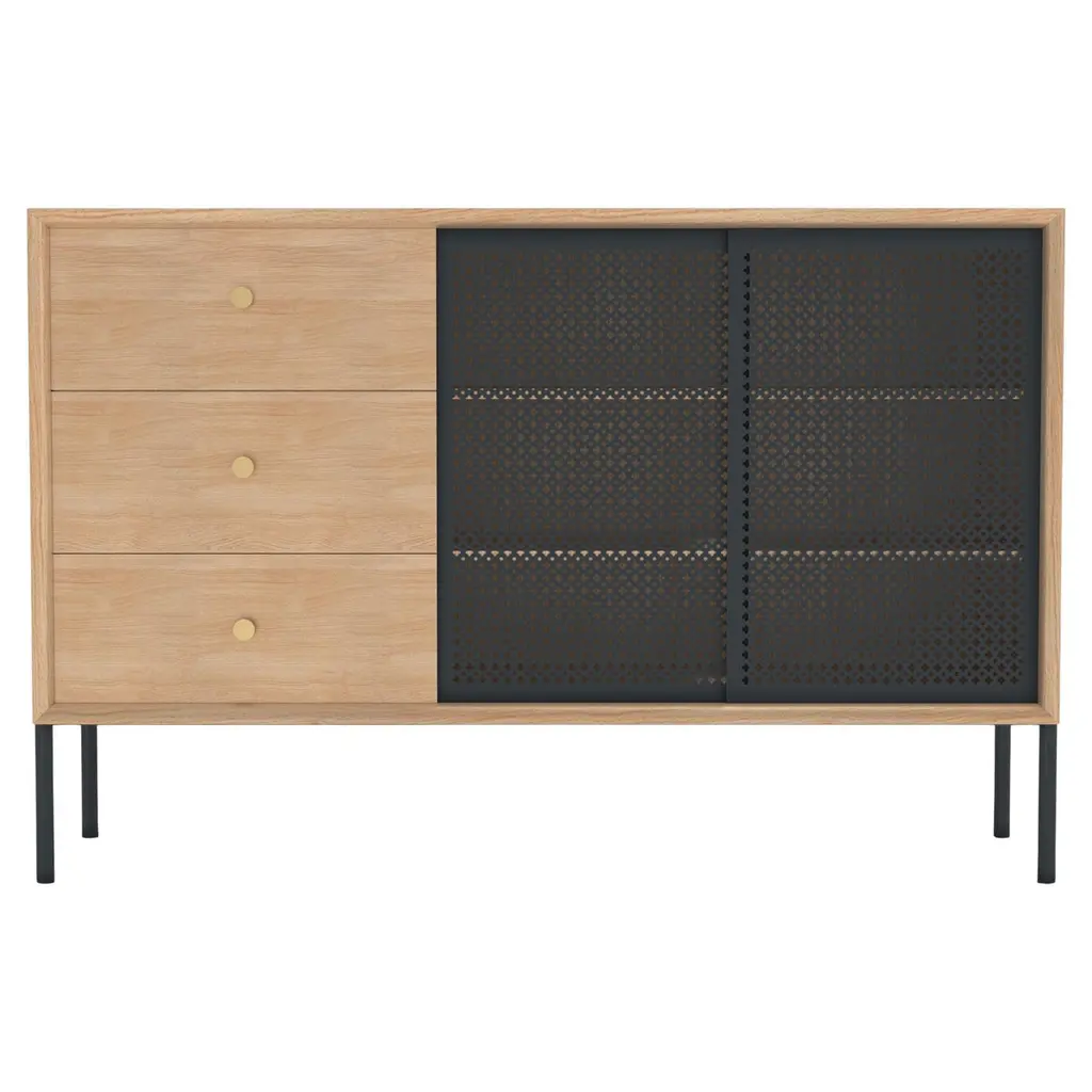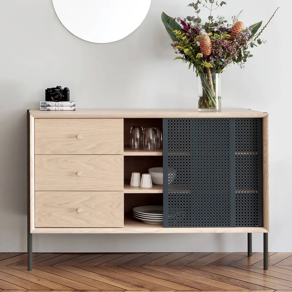 Hartô creative director Mathieu Galard extends his creative storage collection with a caning-inspired front in this higher-than-usual sideboard. Gabin’s attractive clean lines recall midcentury style while its combination of drawers and artfully concealed shelving offers a wealth of storage. With steel legs and perforated sliding doors in a lacquered finish, the cabinet is fashioned in natural solid oak and oak veneer, accentuated with drawer handles in brushed brass.