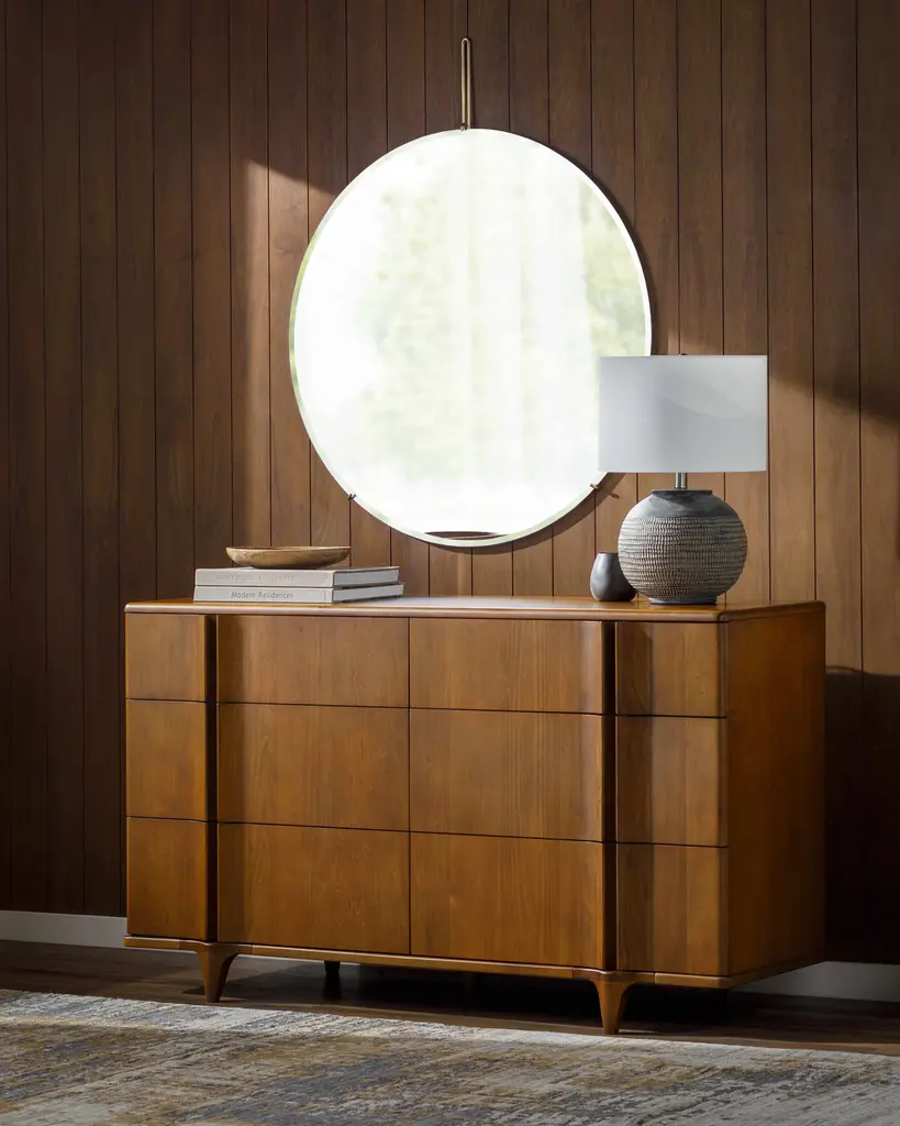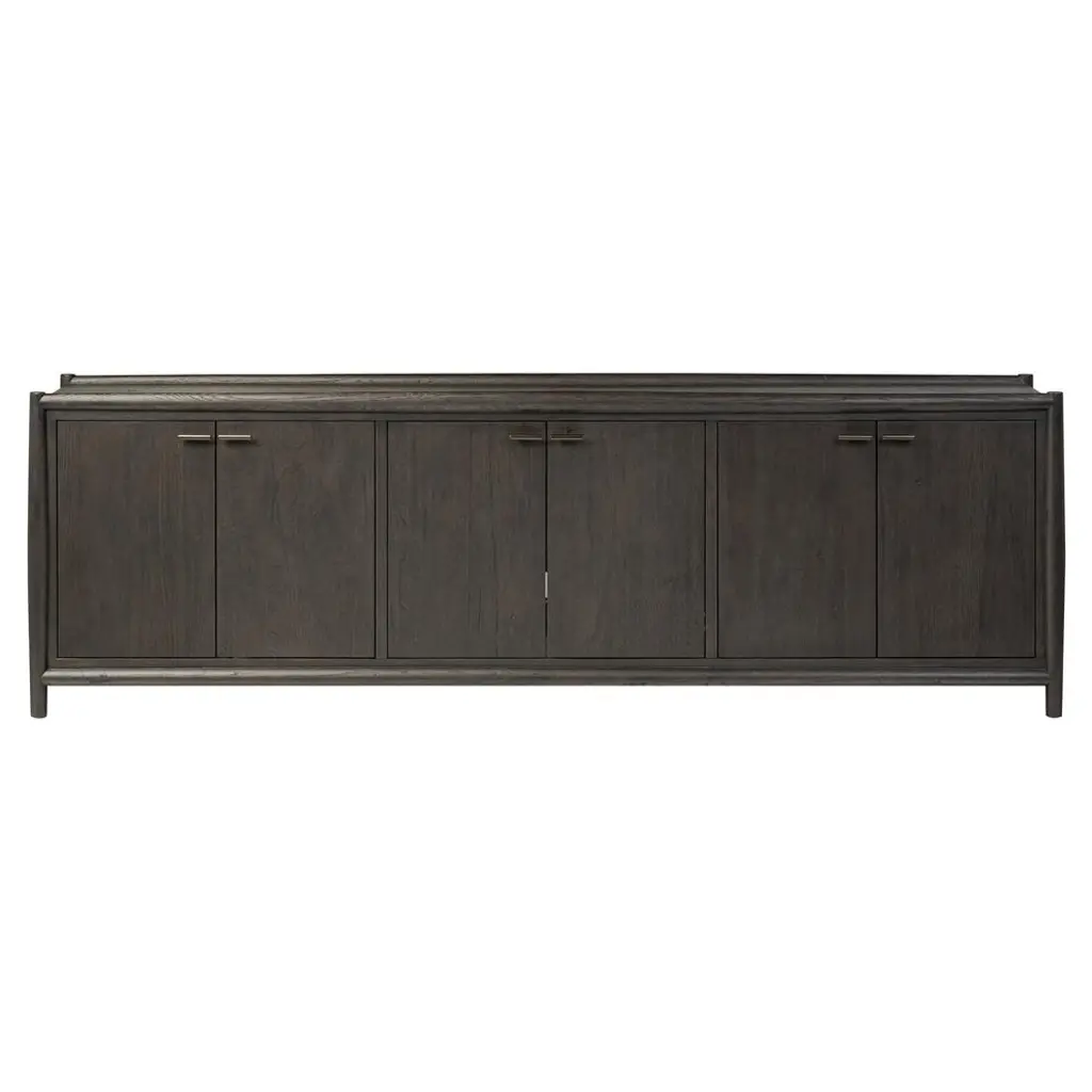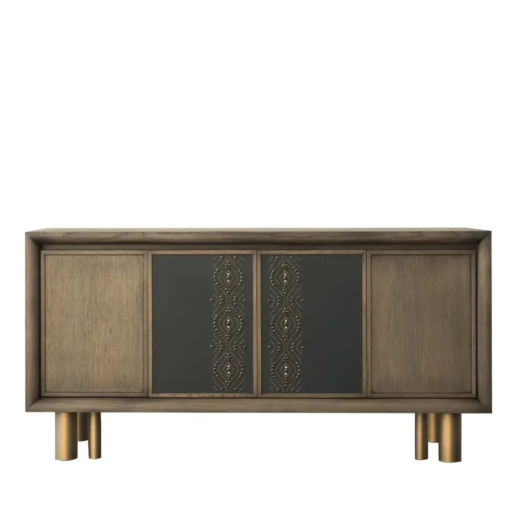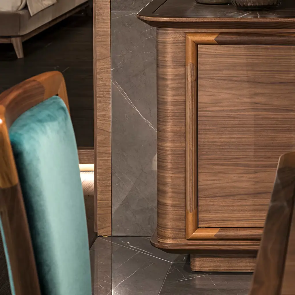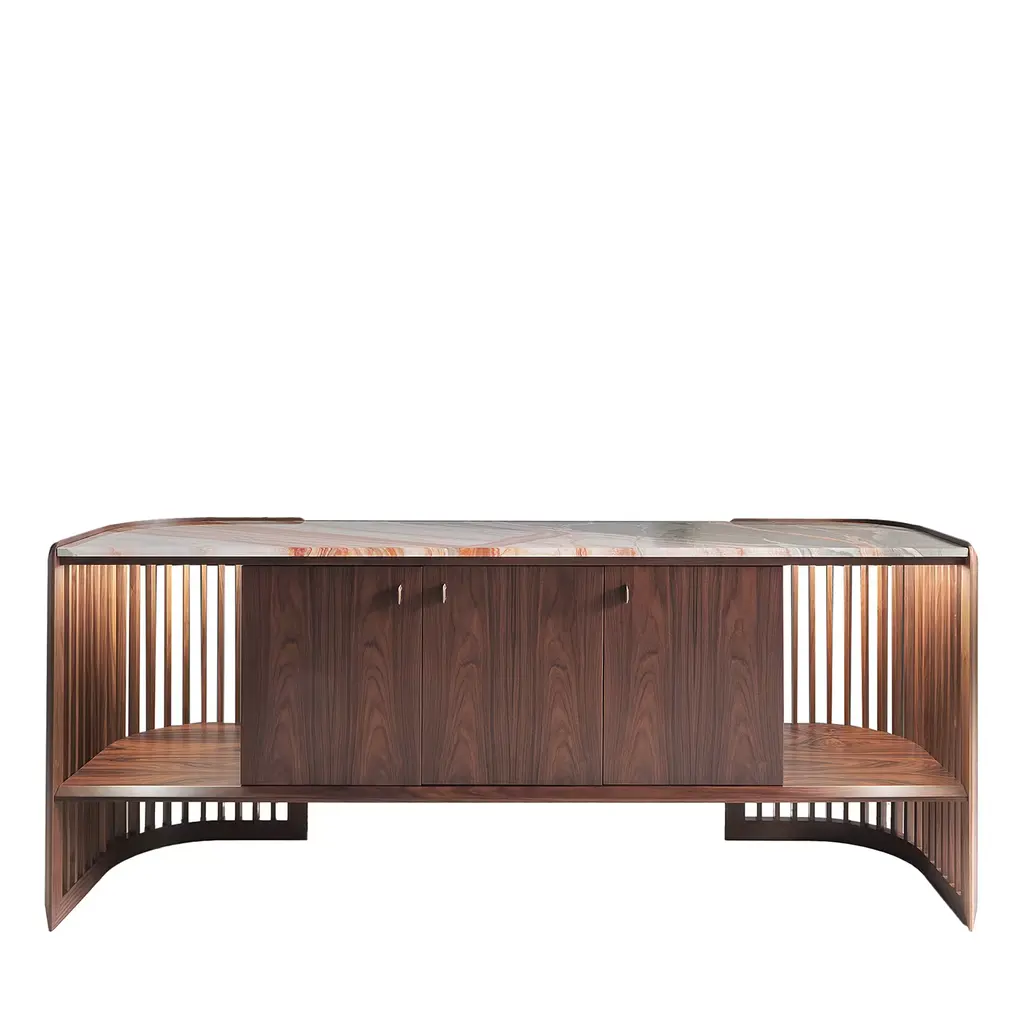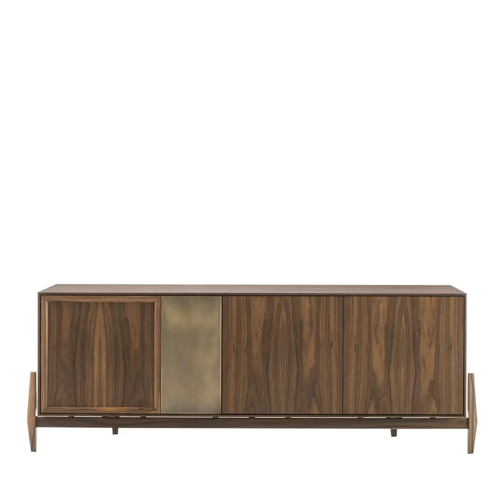 This prized and thoughtful design is entirely fashioned of satin-finished Canaletto walnut and teak with leather details accenting the inner drawers concealed by the four doors closing the storage compartments. Expertly smoothed-out edges make the piece extremely pleasant to touch, while the evident veining of the two woods leave the design's natural beauty completely untouched.