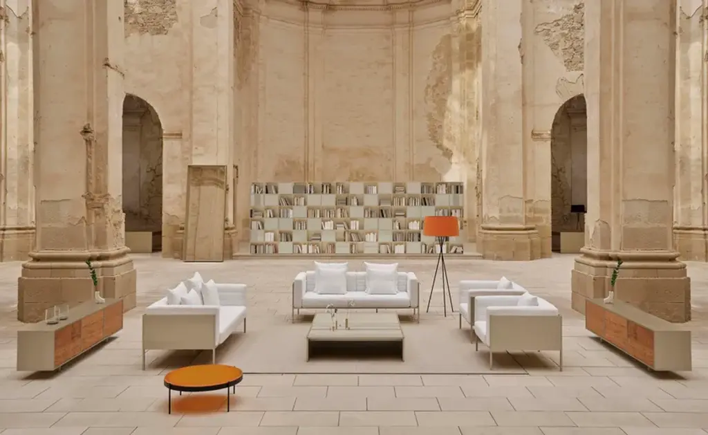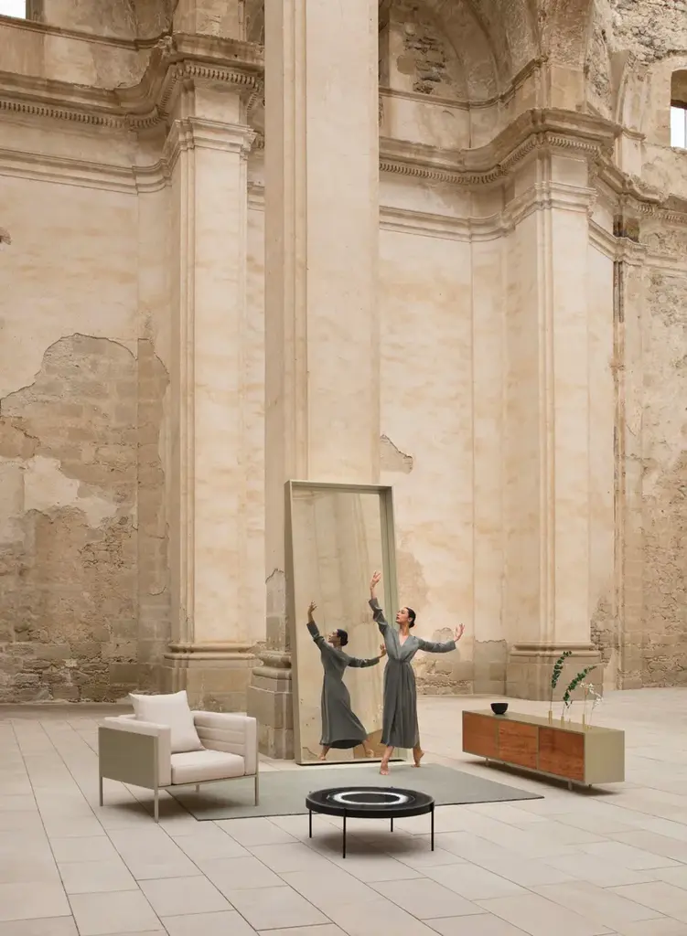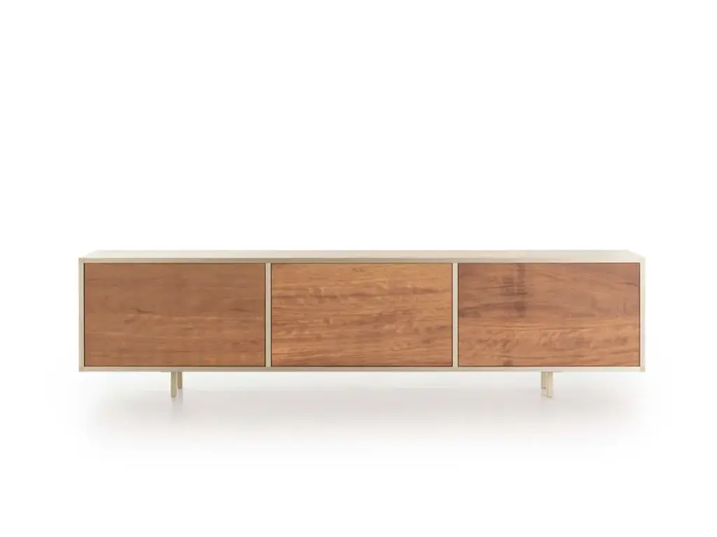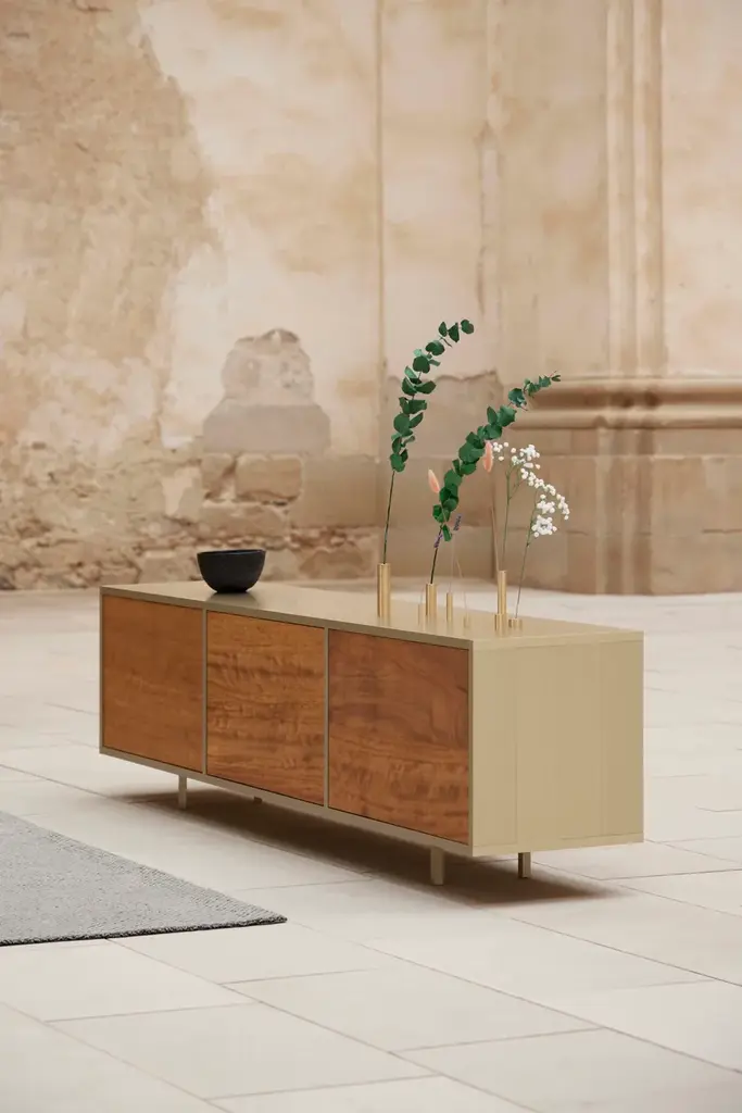 GBmodular is a sideboard with an anodised aluminium frame and iroko wood doors.Its uniqueness lies in the clipping between its extruded recyclable aluminium profiles. This technique makes it possible to juxtapose aluminium panels in an infinite number of dimensions and, with them, to create structures using a mechanism composed of an aluminium knot and screwed-in stainless steel bolts.In 2023 GBmodular demonstrates the great expressive possibilities of its system of construction and is incorporating pieces suitable for creating complete environments into its collection: a lounger, an armchair, a two-seater sofa, a low table, a mirror, a bookshelf available with and without doors and a sideboard. These last two designs, the bookshelf and the sideboard, can be equipped with doors made of Iroko wood and tempered glass.Mono-material, 100% recyclable and handmade, GBmodular reduces material waste as much as possible The manufacture of the aluminium profiles used for GBmodular is done by machines. Moulds are used, which imprint shapes onto the profiles, allowing for lengths of up to 7 meters. Once the profiles have been coated, they are cut to the desired dimensions and assembled, which is done manually. GBMODULAR represents the perfection of the construction system designed by José A. Gandía-Blasco Canales and his team more than 20 years ago to devise the first outdoor furniture collections that have projected GANDIABLASCO internationally. The peculiarity of this new line of furniture lies in the patented system of clipping between aluminium profiles, which makes it possible to obtain aluminium panels in an infinite number of dimensions and with them to shape structures through the manual assembly of an innovative system composed of an aluminium knot and screwed stainless steel bolts. The series takes as its starting point three tables and three benches made of aluminium fibres that have the same dimensions in terms of width and thickness but differ in length -they can reach up to 7 metres-. The tables, whose central pieces are more robust, are accompanied by side benches that can be successively aligned according to their use or needs.Sustainability is a fundamental added value in the design of GANDIABLASCO furniture. GBMODULAR always uses the same aluminium profile extrusion, which reduces material waste to a minimum.