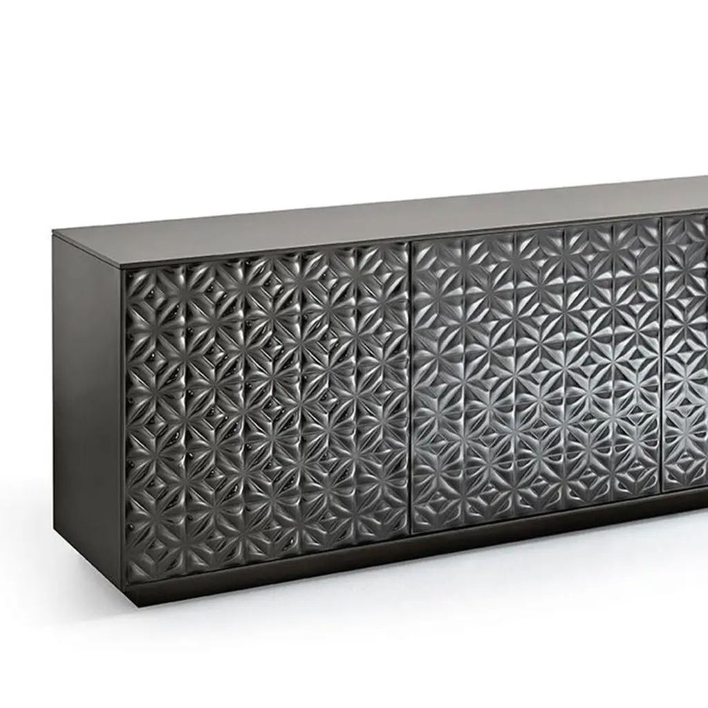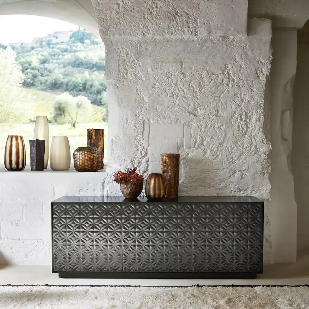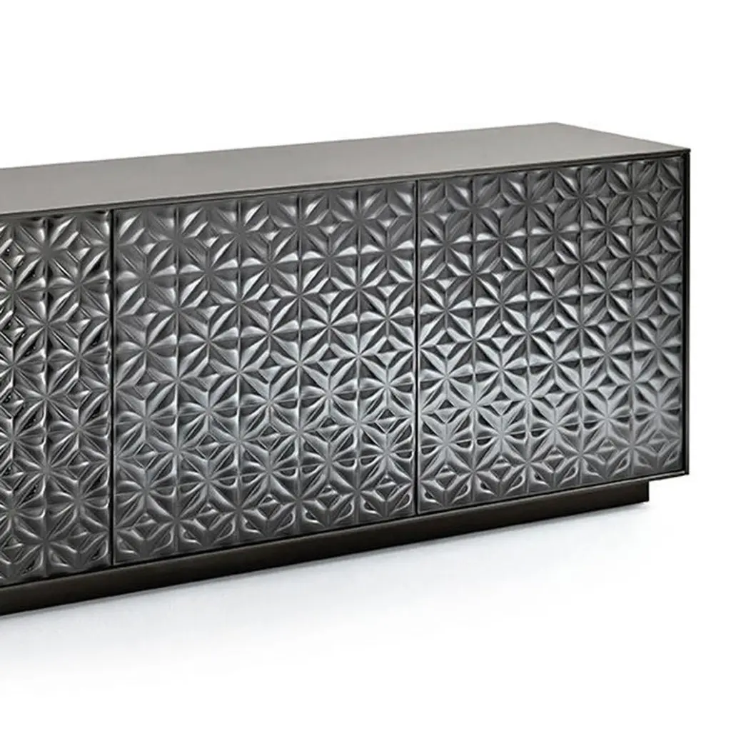 Sideboard Genova Smocked with wooden structure in lacquered dark grey finish,with 3 doors in fused smocked glass, 6mm thickness, with pattern. Sideboard withinternal shelves in tempered smoked glass, 8mm thickness.Also available on request with doors in glass with back in silver finish.Also available on request in:L134xD47xH74cm, price: 7700,00€.L265xD47xH74cm, price: 12300,00€.