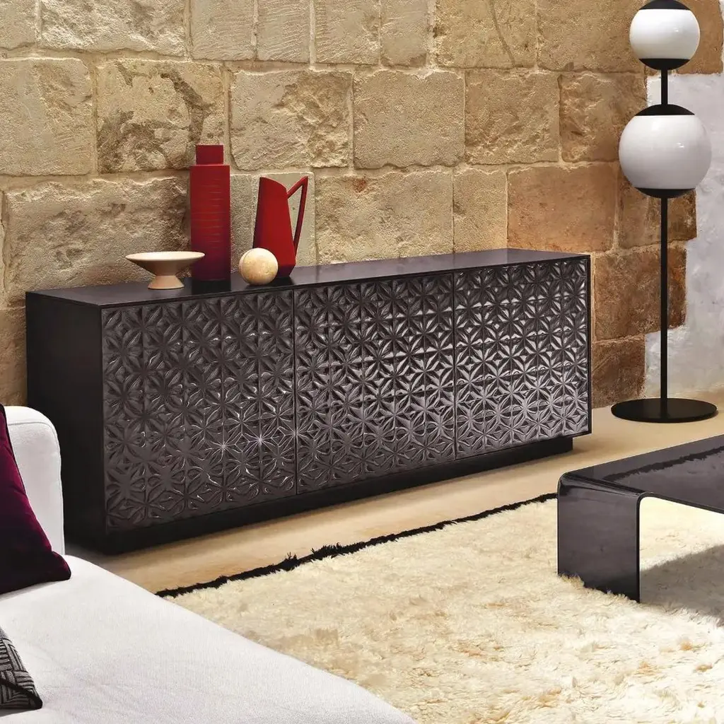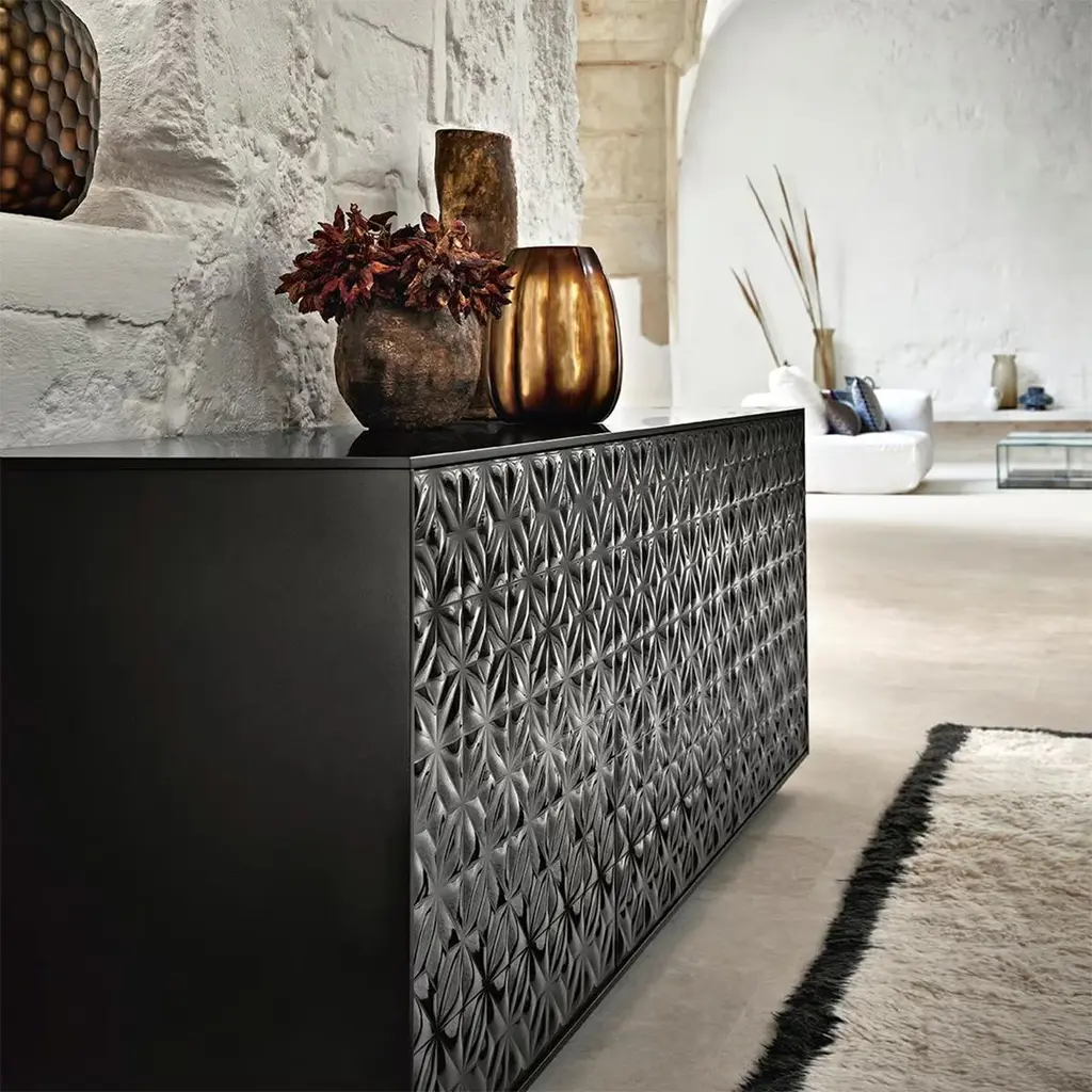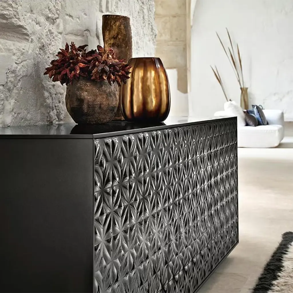 Sideboard Genova Smocked with wooden structure in lacquered dark grey finish,with 3 doors in fused smocked glass, 6mm thickness, with pattern. Sideboard withinternal shelves in tempered smoked glass, 8mm thickness.Also available on request with doors in glass with back in silver finish.Also available on request in:L134xD47xH74cm, price: 7700,00€.L265xD47xH74cm, price: 12300,00€.