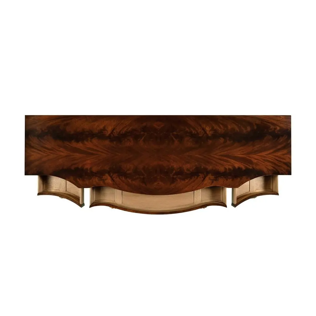 Substantial George III style bow fronted serpentine sideboard with four doors, flame mahogany veneers, and three drawers to the upper register. Contrasting stringing throughout and raised on square cross-section feet. Dimensions: 72.75" W x 21" D x 38.5" H
