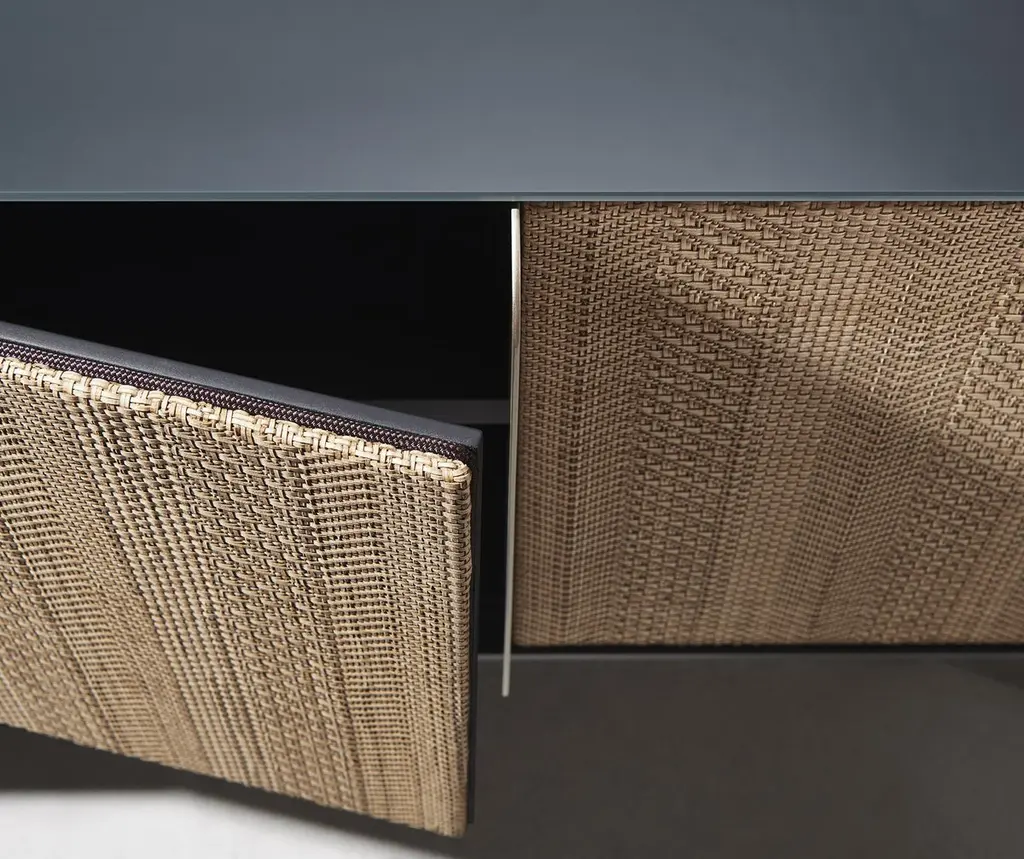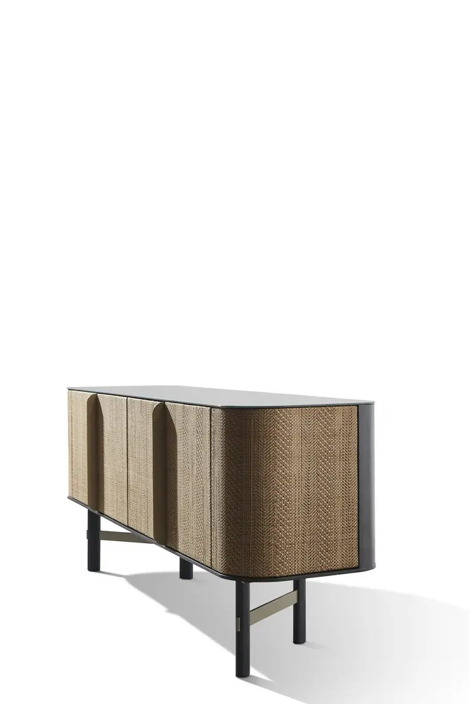Sideboard with plywood and MDF lacquered body. Four doors upholstered in water-repellent and cleanable ecoleather One or two internal adjustable shelves. Top available in two options: 6 mm porcelain stoneware; 6 mm glass painted below. Elliptical-section legs made of lacquered solid wood and connected by steel bars.