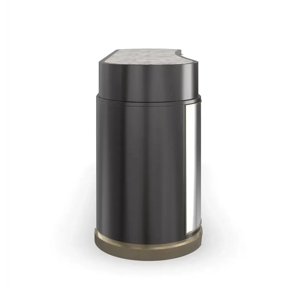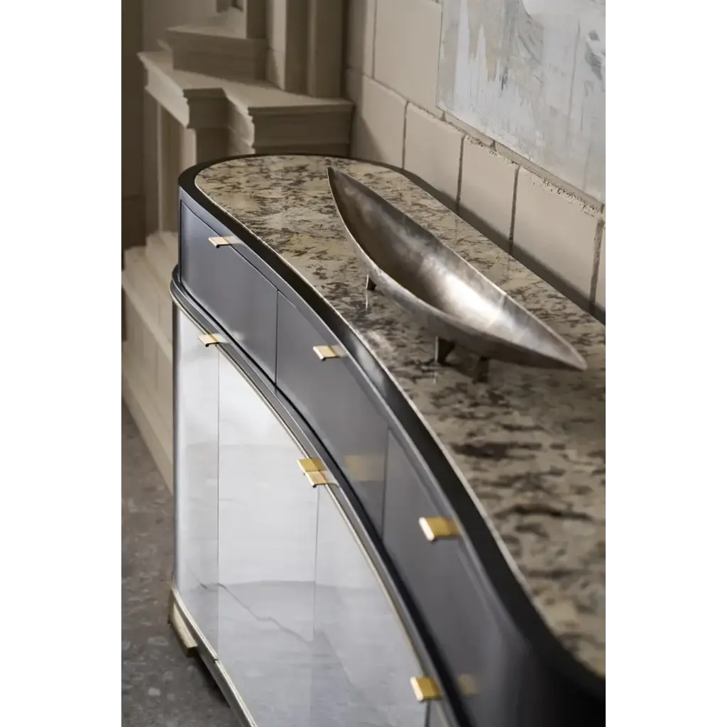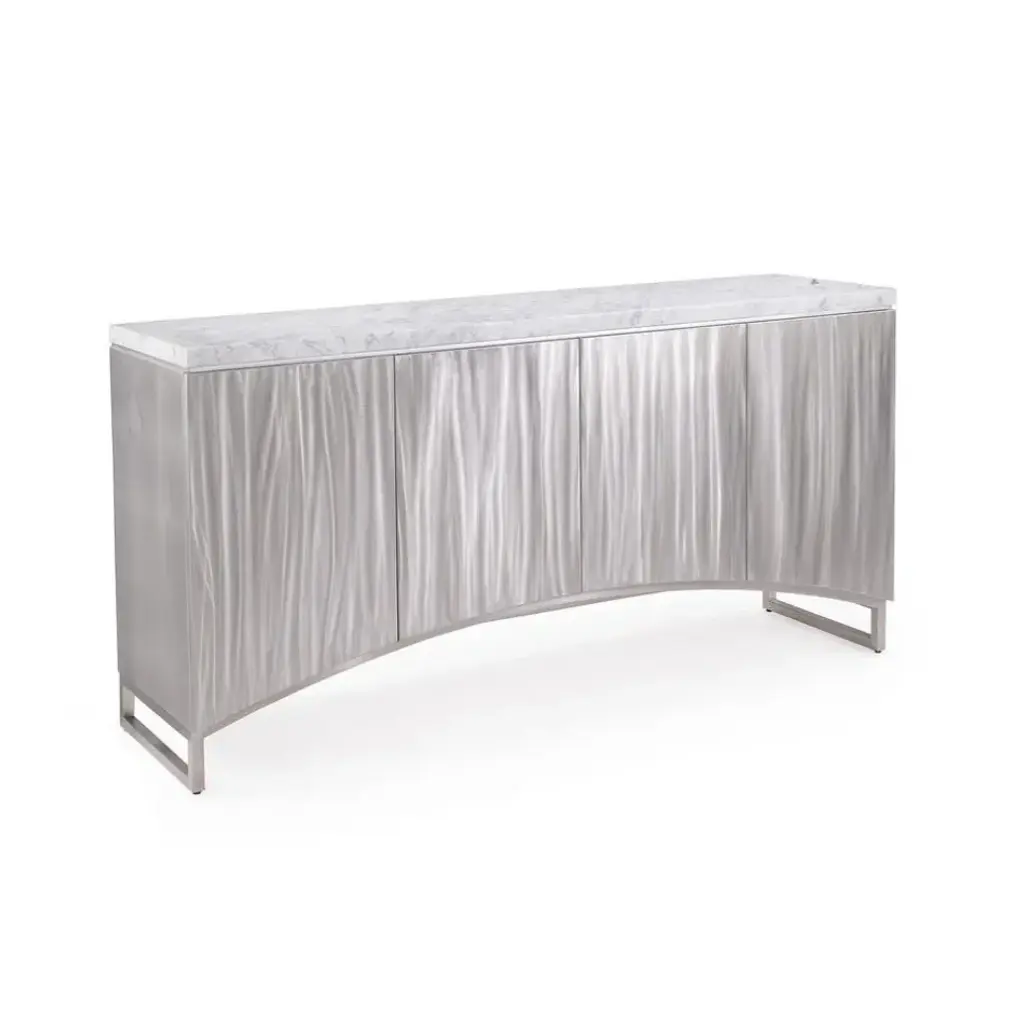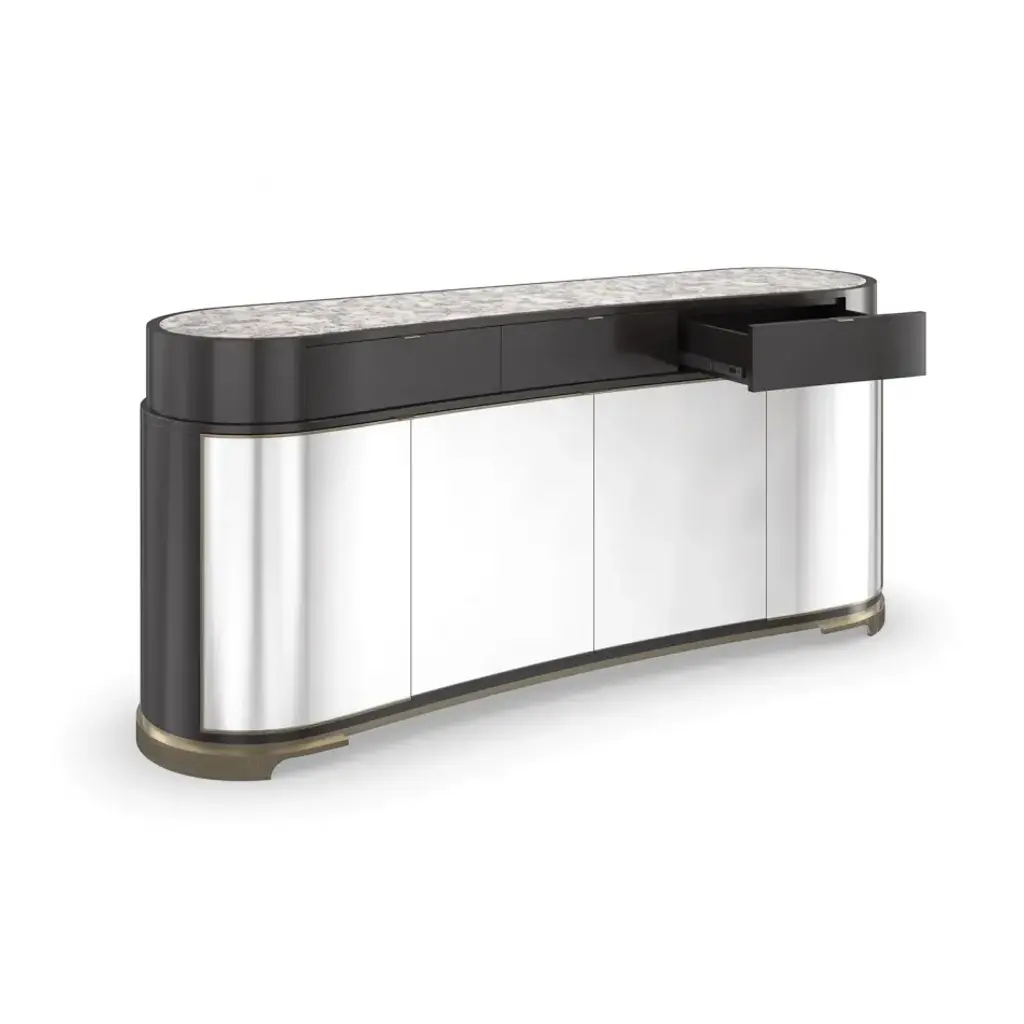 With the iconic appeal of a polished metal ice bucket, this sleek sideboard mixes elegant design with unexpected materials. Its classic kidney bean shape is punctuated by an Almost Black finish and shimmering silver door fronts framed in a bead of Brushed Gold. More than just gloss and glamour, its spacious interior offers ample room for keeping entertaining essentials, and a Snow Fox stone top lends a luxe yet durable surface for serving and display.