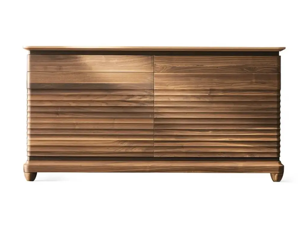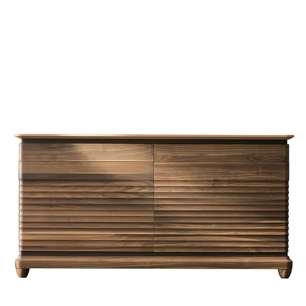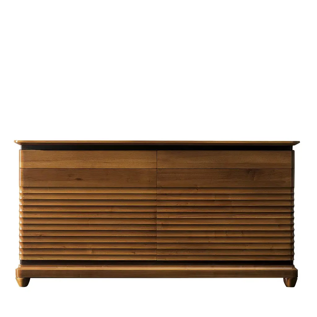 This superb sideboard is an exquisite example of fine craftsmanship. It is made of walnut and its simple rectangular shape rests on four small feet and features six central drawers and two doors. The details make this piece a precious addition to any home: the inlaid decoration on the top and the stunningly textured front panels with their parallel grooves that add dynamism to the sideboard.