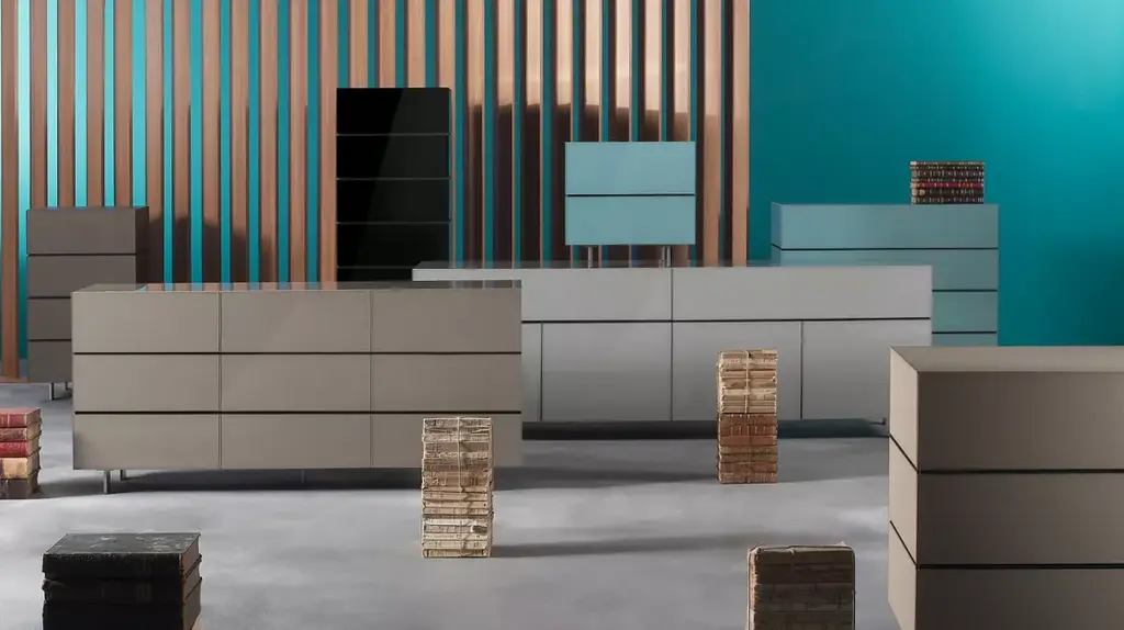 Globo is a complete collection of storage furniture pieces that are both graphic and functional. The entire collection features the same horizontal rhythm on the facades that is highlighted by deep partitions between the openings. The facades can be in coloured lacquered glass, coloured mirror, wood veneer, or a combination of these finishes.