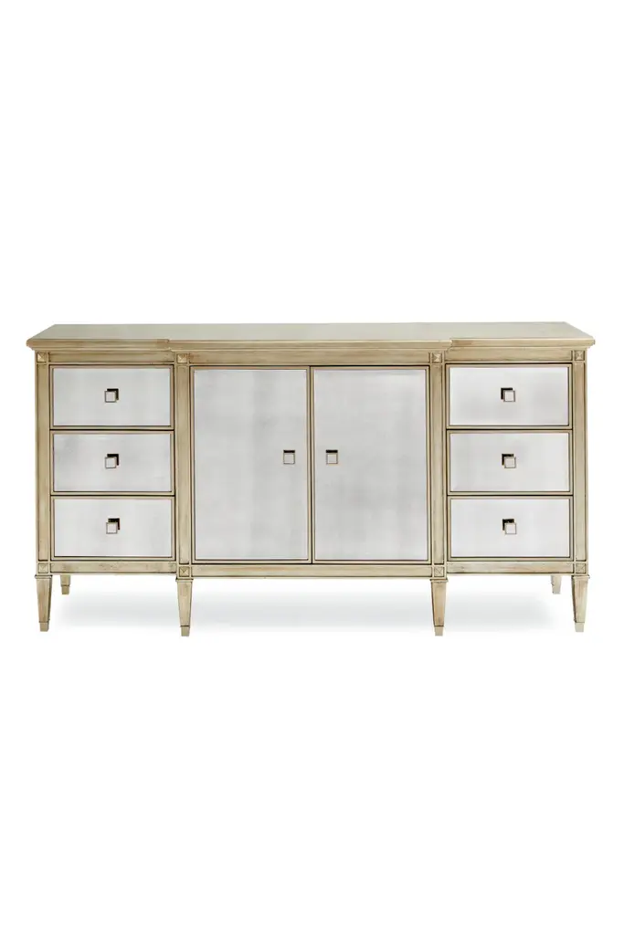 Champagne leaves intertwine in a contemporary, arabesque pattern that wraps round this piece to make it a standout design. The narrow buffet shows off the elegance of Koto wood, finished in glowing Champagne Shimmer. Its radiant aura is perfectly accented with two metallic Whisper of Gold bands and ferrules that add just the right touch of sparkle to this four-door piece with a pull-out, drop-down drawer (with cord access) and three adjustable shelves. With elegant detailing and dramatic custom crystal hardware, this silhouette is perfect for entertaining or as an accent piece that draws your eye to its beauty.