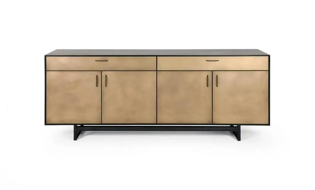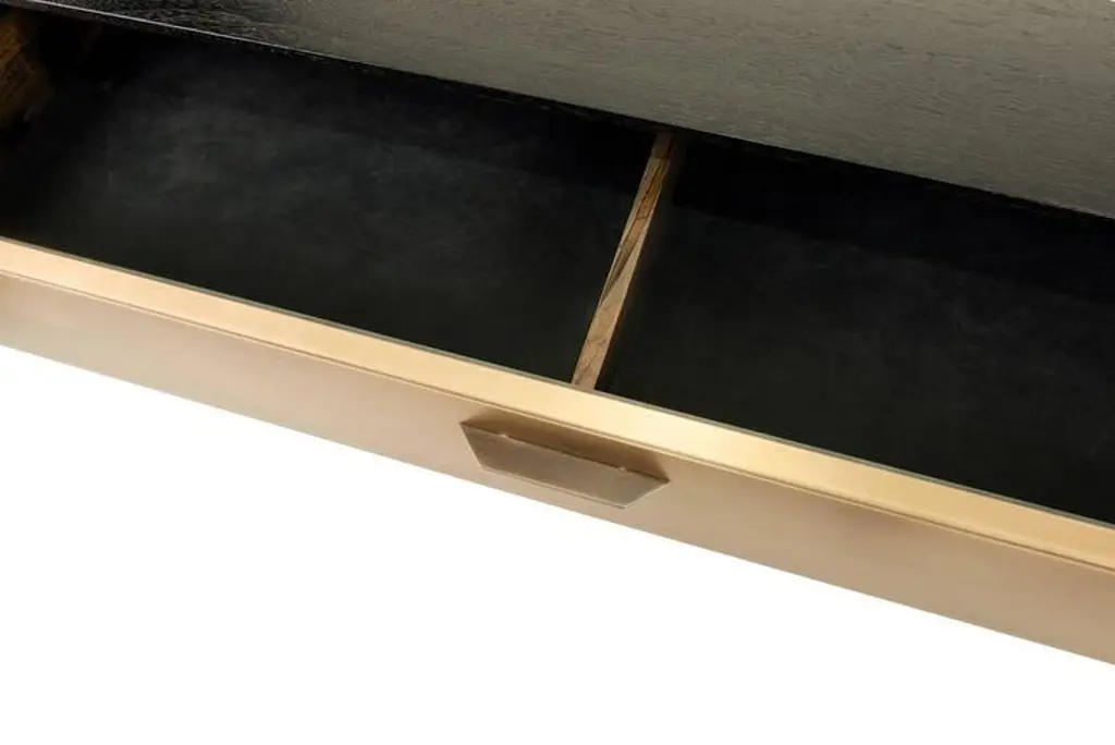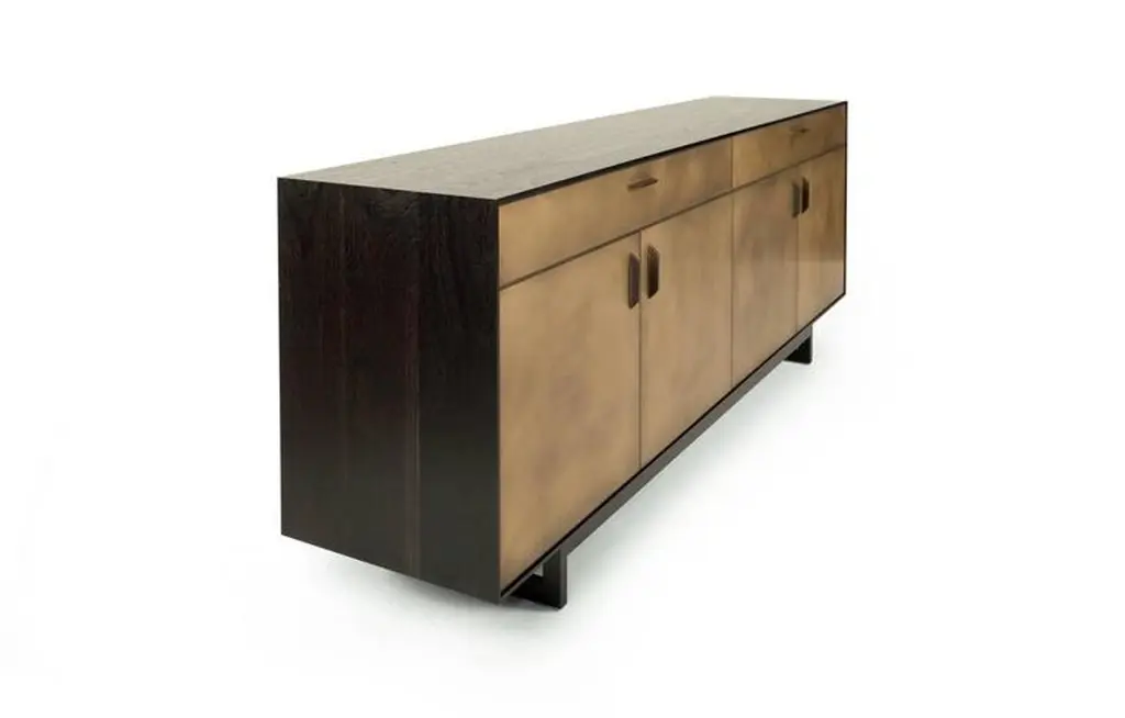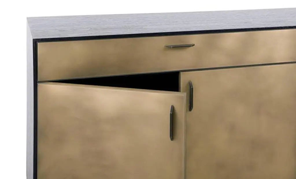 The Gotham credenza features clean lines that blend harmoniously with the beautiful mix of materials. A dark and dramatic oxidized walnut frame sits on a blackened steel base. Custom hand-sculpted blackened bronze pulls compliment the striking burnished bronze encased in resin drawer and door fronts. Dimensions as shown: L 80 in. / D 18 in. / H 32 in.Standard size options:L 50 in. / D 18 or 22 in. / H 28 or 32 in.L 65 in. / D 18 or 22 in. / H 28 or 32 in.L 80 in. / D 18 or 22 in. / H 28 or 32 in.L 95 in. / D 18 or 22 in. / H 28 or 32 in.Custom sizing and finishes available, please inquire.