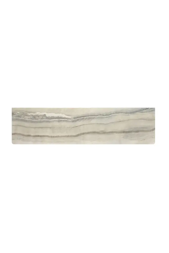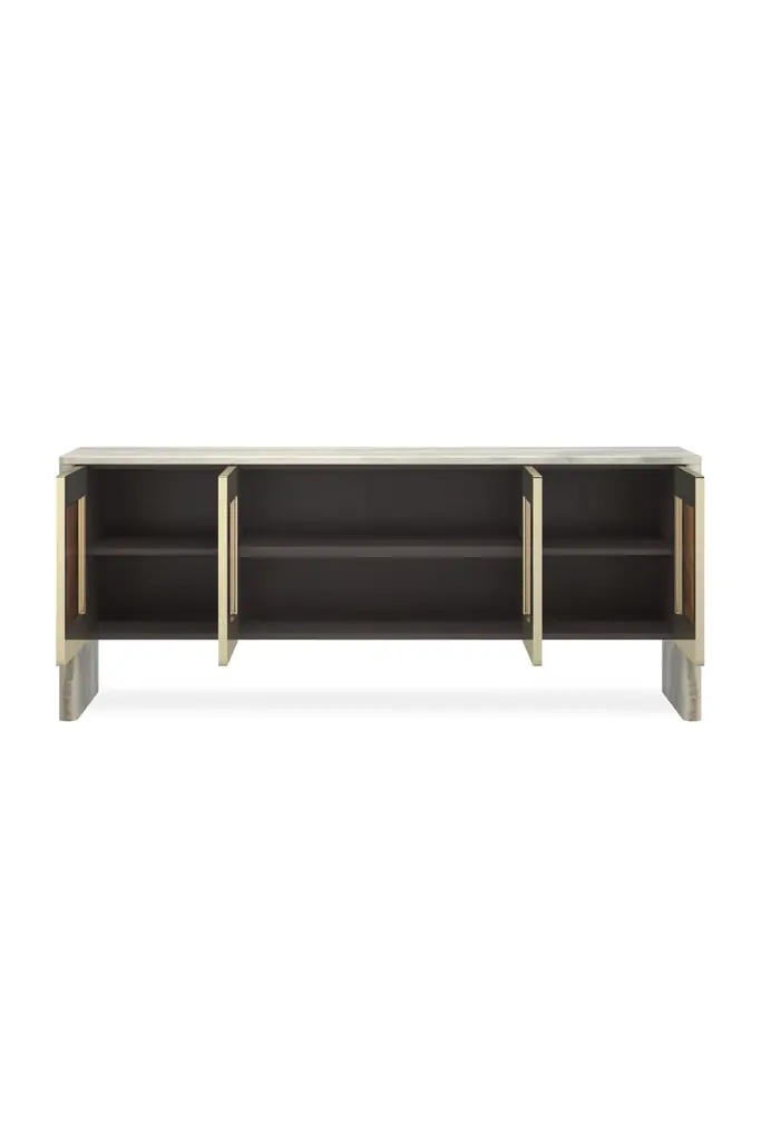 Sojourn gives off a 70s retro vibe with its “big look.” Immediately, your eyes are drawn to the large slabs of Grey onyx marble that create the legs and top of the sideboard. Inset into the stone frame are four metal doors that create Whisper of Gold frames for the inset Bronze glass front panels. Open the touch-latch doors to discover an interior finished in luxurious painted seal skin. There is an adjustable shelf behind each end door; and one adjustable shelf behind the center doors.